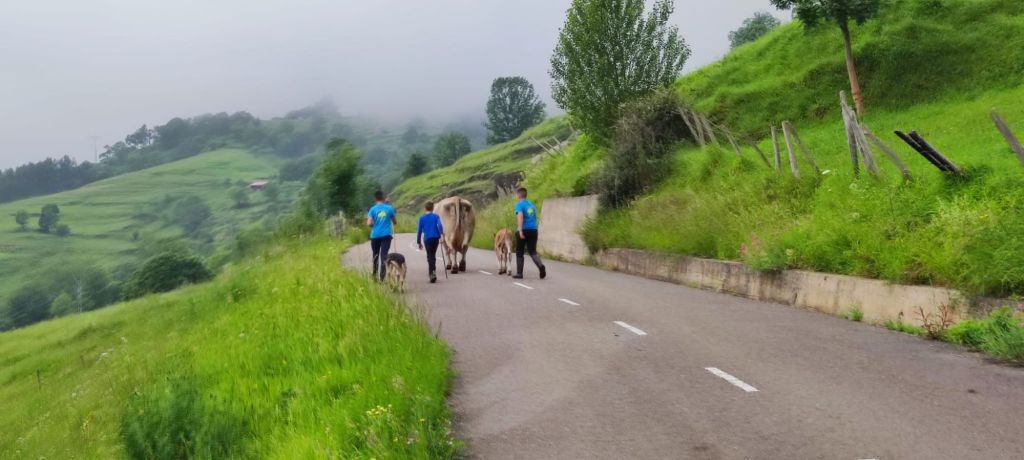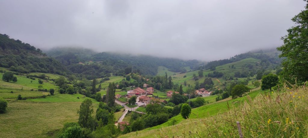 En la subida a Burió las rampas se hacen un poco más duras y nos encontramos un grupo de chicos que llevan una vaca y su ternero de cinco días a un prado más alto. A la salida de Burió nos cae una espesa niebla que nos impide ver las panorámicas sobre el valle del Lamasón y sobre el propio pueblo de La Fuente. En este punto entramos en una pista cementada por la que en 1,5 km superamos más de 150 metros de desnivel. Con calma llegamos a la carretera CA-282 y al Collado de la Hoz (660 m) Continuamos algo más de un kilómetro hasta encontrar un camino de tierra a nuestra izquierda dejando el asfalto después de 14 km de Etapa. Este camino, al principio en ligera subida, inicia pronto el descenso a Cicera. La niebla se abre un momento y nos permite tener una bonita vista del pueblo entre imponentes montañas con el impresionante desfiladero de la Hermida al fondo. Entramos por la parte alta a Cicera y nos dirigimos a nuestro alojamiento. Cicera es un pueblo de 32 habitantes con dos alojamientos rurales y un solo bar con horario y oferta muy limitada. Aquí nos reencontramos con Marga y Llarina (las asturianas de ayer) y nos despedimos de ellas ya que van a continuar hasta Cabañes. Al terminar la comida llegan al bar el trío de italianos con los que cambiamos algunas impresiones.
