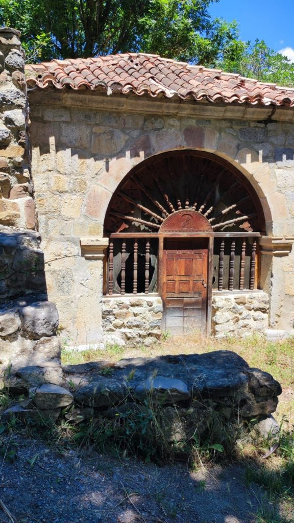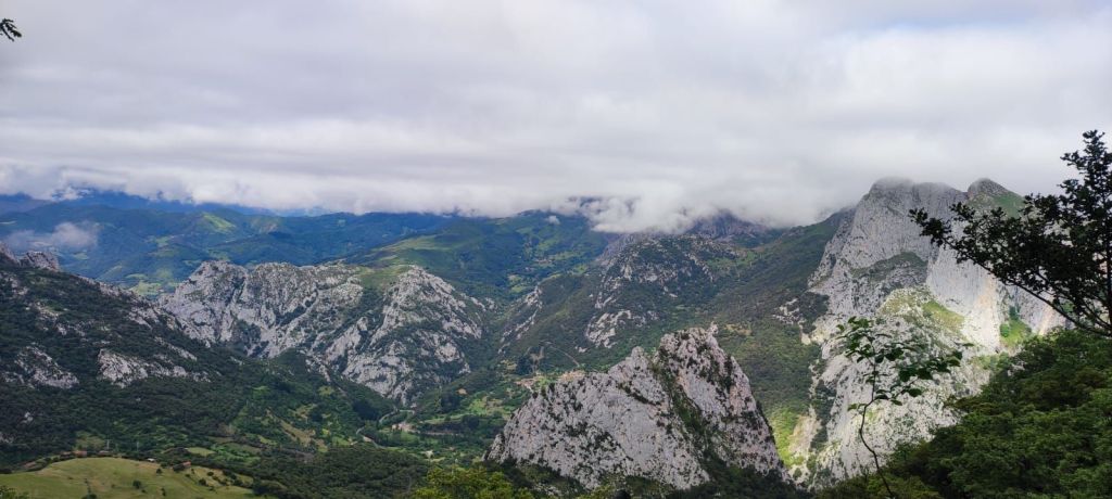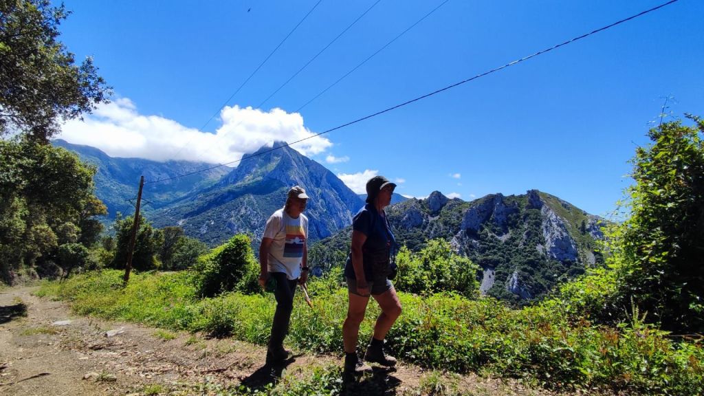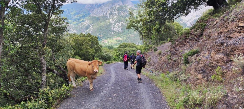 Salimos de Cicera en dirección al itinerario de “La Canal de los Francos” señalizado también con los postes del Camino Lebaniego y comenzamos a ganar altura por un sendero que es una maravilla para los sentidos: un precioso bosque de hayas centenarias cada vez con más pendiente. El camino asciende por la ladera del monte Mesa sin Pan y, a medida que vamos ganando altura, vamos disfrutando de hermosas panorámicas sobre los picos de Europa. Hay que andar con mucho ojo por la hojarasca y las piedras cubiertas de musgo y zonas encharcadas. A la mitad de la subida nos alcanza el grupo de cordobeses con los que hemos coincidido estos días y haremos con ellos el camino hasta Lebeña. Cuando llevamos unos 3 km de etapa alcanzamos la altitud máxima (840 m) y encontramos un bonito mirador en el que tenemos al frente a la derecha el macizo de los Picos de Europa, abajo el desfiladero de la Hermida, al frente divisamos Allende y Cabañes y a la izquierda la Peña Ventosa que nos va a acompañar durante casi toda la jornada. El descenso se hace por un camino apto para vehículos que permite caminar con tranquilidad a pesar de la pendiente. En este descenso nos encontramos con algunos grupos de vacas que ocupan parte del camino y vamos viendo las breñas e invernales de los ganaderos de la zona. Finalmente, tras 5 km de bajada llegamos al bonito pueblo de Lebeña y nos dirigimos a la Iglesia Mozárabe de Santa Maria de Lebeña, la más valiosa joya del prerrománico cántabro. Lamentablemente hoy lunes permanece cerrada.