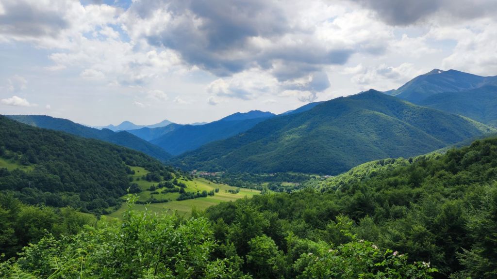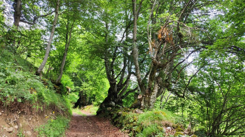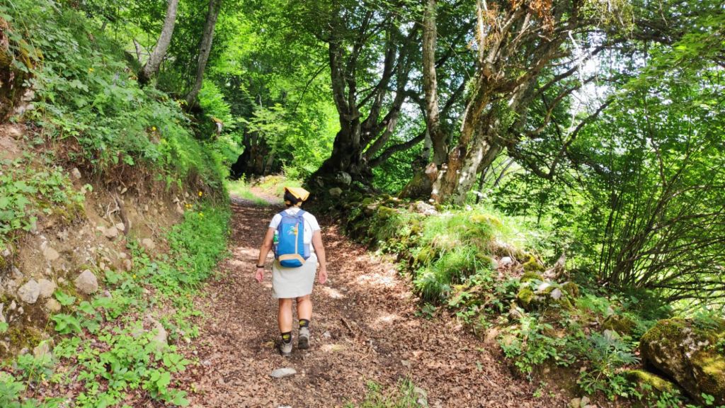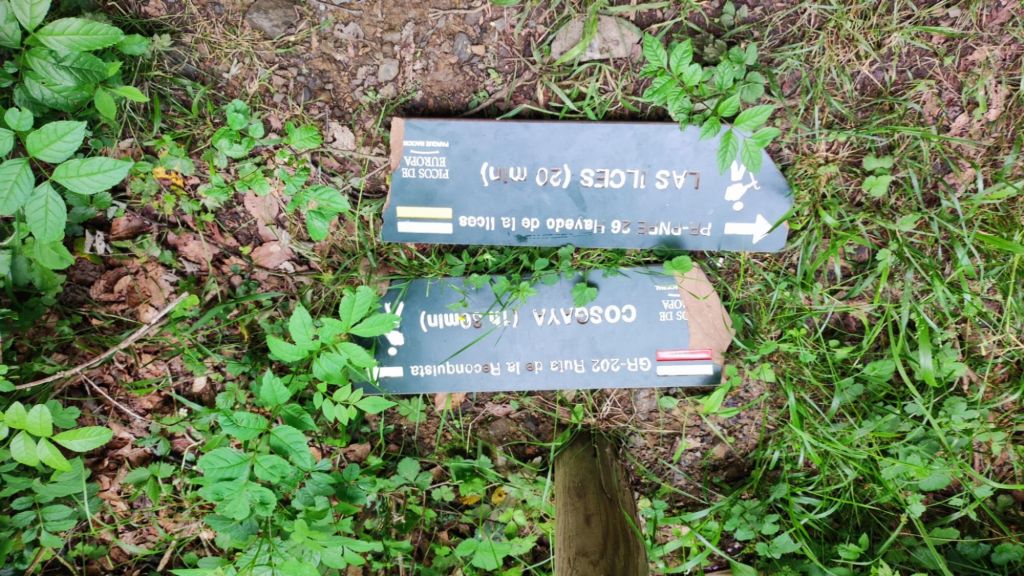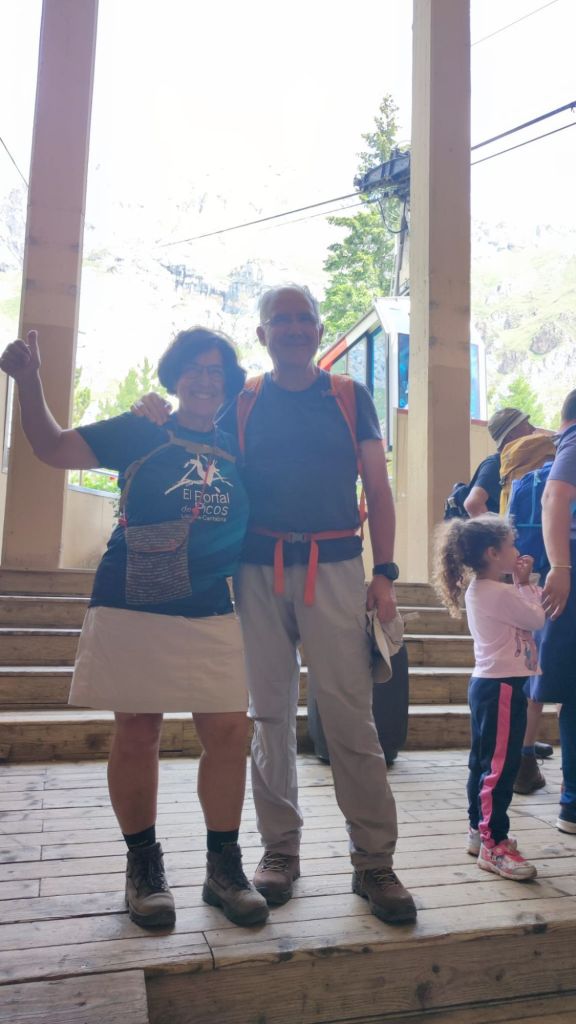 Salimos de Cosgaya por un camino paralelo a a su calle principal y a la carretera de Potes a Fuente De. Este camino finalmente desemboca en la mencionada carretera y por el arcén de la misma, y con mucha precaución, circularemos aproximadamente 1 km para desviarnos por un camino muy bien señalizado con las balizas del GR – 202. Es un camino de tierra muy cómodo que se interna por un magnífico bosque de robles, castaños y, más adelante de hayas (Hayedo de las Ilces) mientras que por las vaguadas que lo cruzan discurren arroyos más o menos caudalosos que aportan la rumorosidad del agua. Las primeras rampas son bastante duras pero luego se van suavizando y se camina muy cómodamente. En este tramo nos encontramos con Juan y Miguel Ángel, dos caminantes avezados que están haciendo el camino Vadiniense hasta Santo Toribio de Lièbana. Intercambiamos opiniones sobre los caminos y seguimos nuestro camino. Los diez primeros kilómetros son de subida y superamos los 1.080 m. Descendemos hasta la localidad de Pido y por una pista cementada comenzamos un nuevo ascenso hasta los 13 km de nuestro recorrido en el que encontramos una bifurcación señalizada con dos caminos, uno para continuar hasta Portilla sin pasar por Fuente De y siguiendo recto para llegar a Fuente De. Continuamos por ese camino que continúa en ascenso hasta llegar a la Fuente de la Fonfría y en bajada llegamos hasta el parking superior del Cable de Fuente De.
