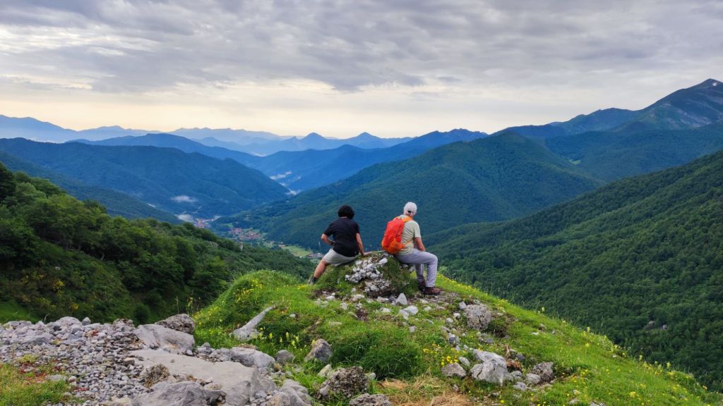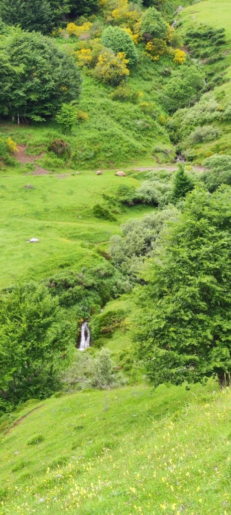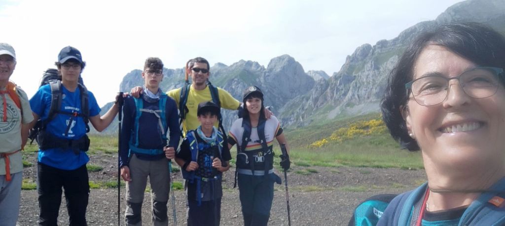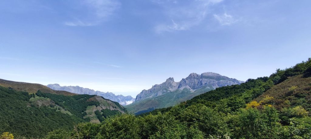 Comenzamos a caminar desde el parking superior de Fuente De y tomamos un camino de tierra junto a la entrada del Camping y salimos del circo glaciar de Fuente De ganando altura progresivamente. Pasamos junto a la fuente de la Fonfría y un poco más adelante junto a los invernales de las Berrugas. El camino que llevamos, Senda de la Remoña, transita bajo un gran bosque de robles y va alternando rampas más duras con otras más suaves. Han sido 8 km de subida que se pueden dividir en dos partes similares separadas por unos 800 m llaneando entre una y otra. El paisaje en toda la subida es espectacular. En cuanto se toma algo de altura tenemos unas vistas imponentes sobre el valle y se pueden ver Espinama y Pido e intuir Cosgaya un poco más lejos. A nuestra derecha toda la cuerda de los Picos de Europa. Para no olvidar. Sobre las 12 de la mañana llegamos al mirador de la Remoña (Horcada de Valcavao) donde encontramos un grupo de jóvenes montañeros con su monitor que se disponen a hacer una ruta por la zona. Tomamos una fruta e iniciamos el descenso en dirección al Puerto de Pandetrave.