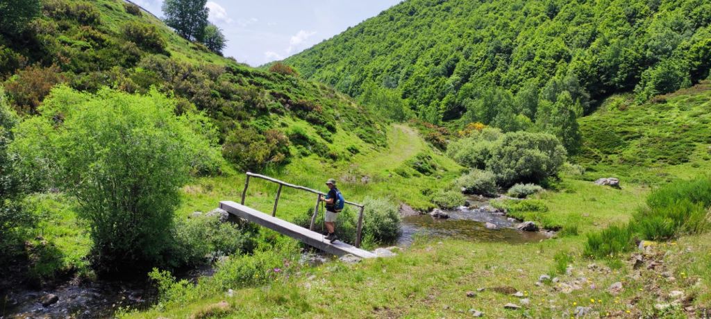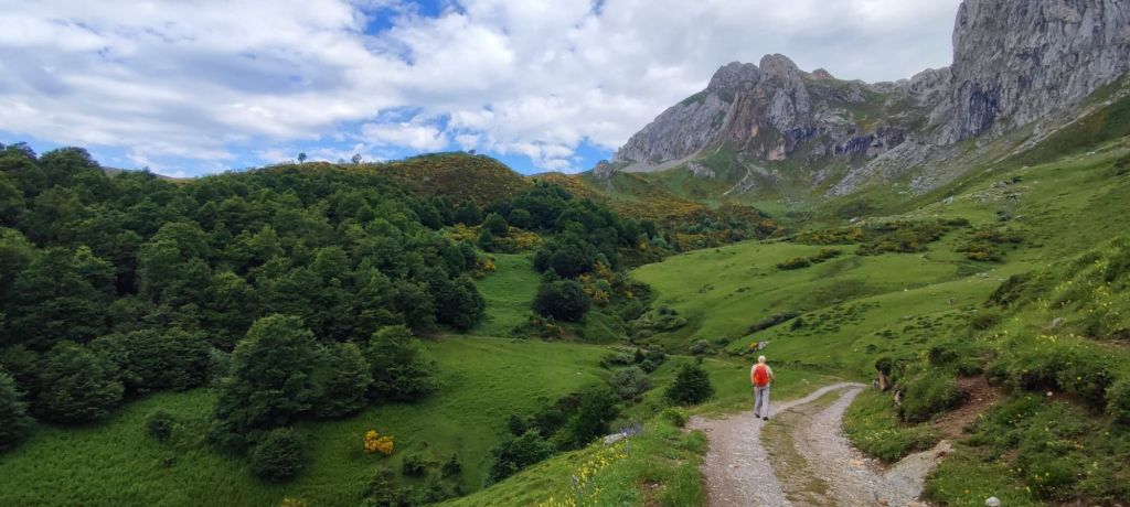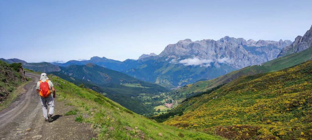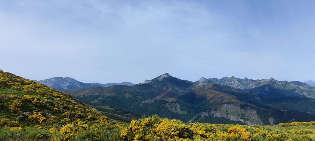 En nuestra sexta etapa de este camino Vadiniense cruzamos la cordillera cantábrica alcanzando la cota de los 1.794 m de altitud en la Horcada de Valcavao. La etapa tiene una subida larga (8 km subiendo) con unos paisajes impresionantes sobre los Picos de Europa en un entorno excepcional: valles verdes, extensos bosques, avistamiento de fauna silvestre, etc. Hasta el Puerto de Pandetrave hemos seguido cómodas pistas de tierra. Luego hemos alternado un sendero junto al río Puerma con una monótona carretera de montaña. En esta etapa no se atraviesa ningún núcleo urbano, por lo que tenemos que llevar todo el avituallamiento necesario para hacer la comida durante el camino y agua suficiente para todo el día.