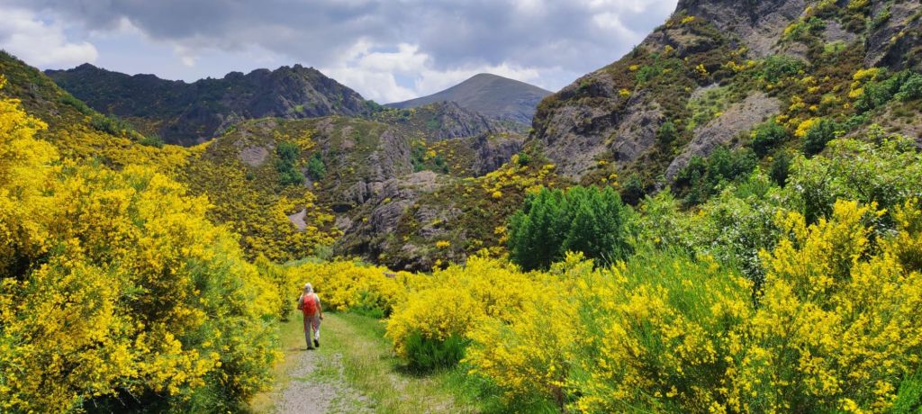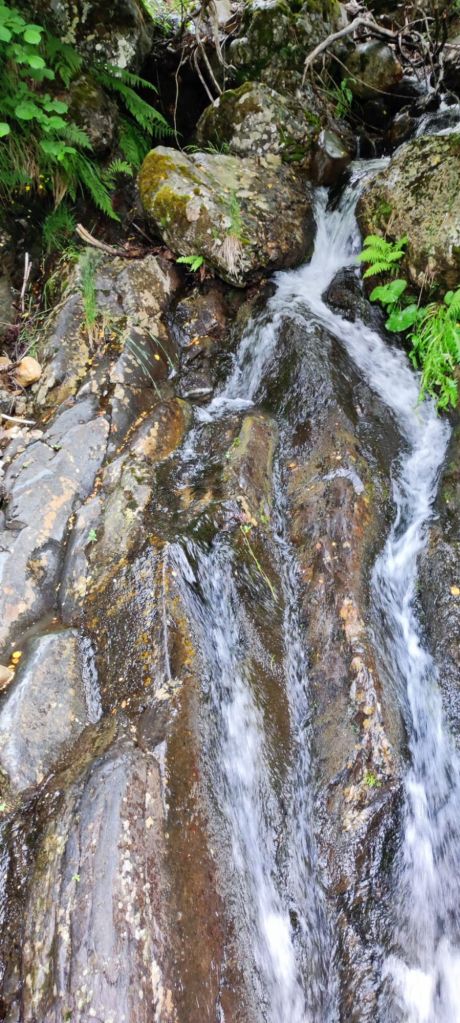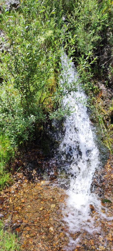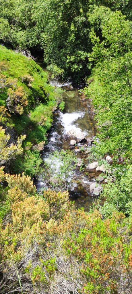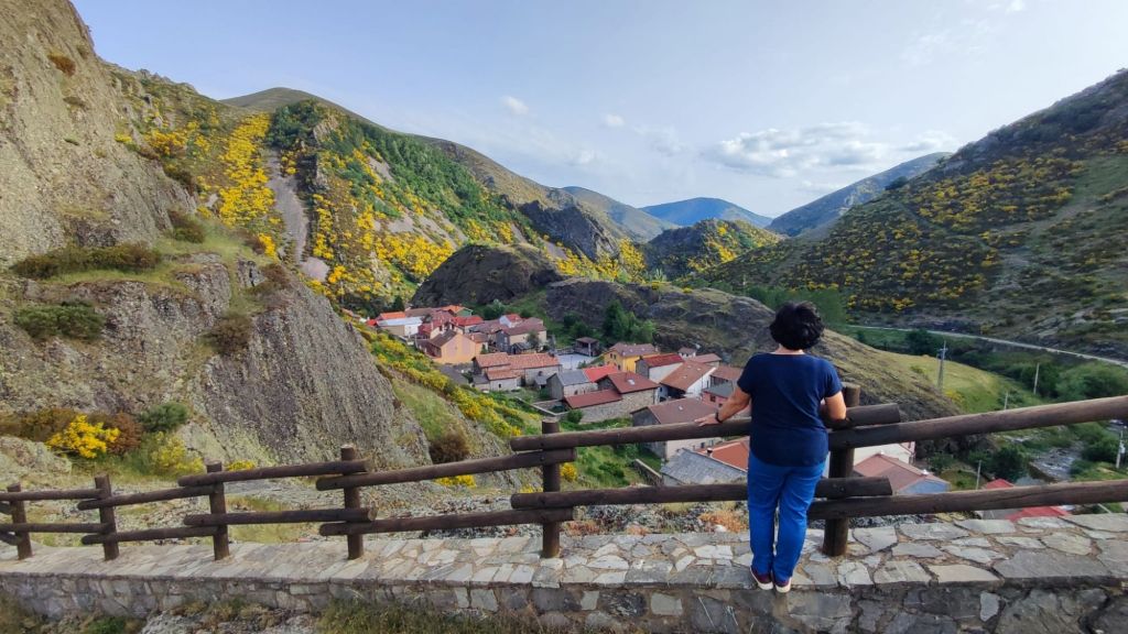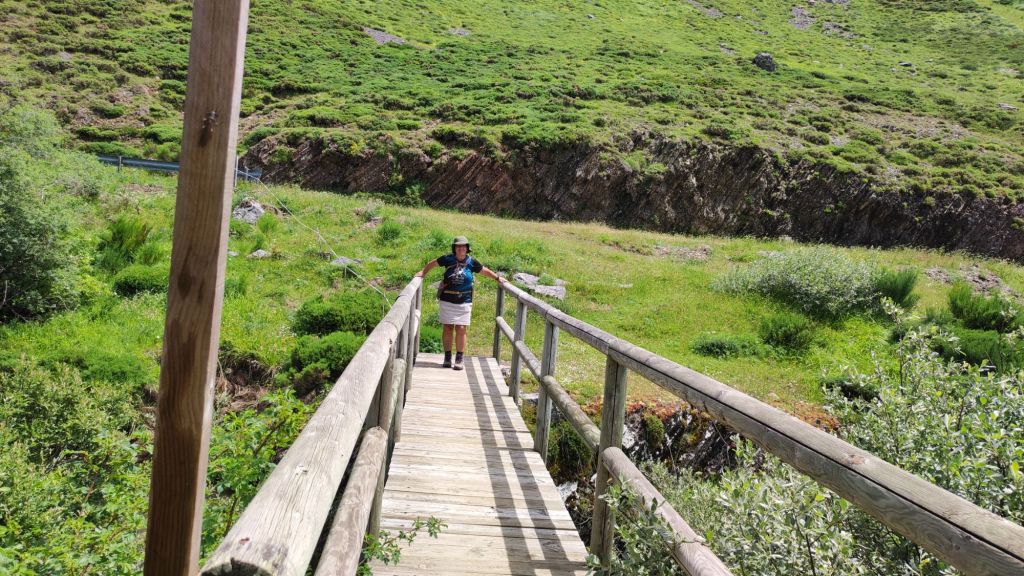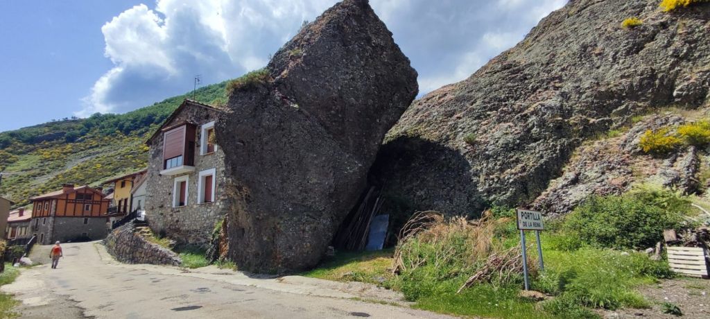 La pista que baja al Puerto de Pandetrave es igual de cómoda que la que traíamos por el lado de la subida. Pasamos por un chozo de pastores trashumantes y poco más adelante pasamos por una gran fuente con abrevadero. Junto al Puerto de Pandetrave nos encontramos con un pastor con su rebaño de ovejas con unos mastines no muy amistosos. En el puerto una carretera de montaña en muy mal estado baja hacia Portilla de la Reina. Un poco más adelante del puerto la señalización nos dirige hacia un sendero paralelo al río Puerma. Está sin desbrozar, con bastante agua por las lluvias de la tormenta de la tarde noche anterior, por lo que renunciamos al sendero y volvemos a la carretera. En el kilómetro 14,50 de nuestra ruta, cansados de la carretera tomamos un atajo señalizado que nos vuelve a las orillas del Río Puerma. Lo seguimos hasta que vuelve a la carretera. En el kilometro 16,5 de nuestro recorrido otra flecha amarilla nos invita a seguir por la otra orilla del Río. En este caso la seguimos durante un kilometro y medio, pasamos por otro chozo de pastores y al poco volvemos a la carretera. Un kilometro más adelante otra flecha nos invita a dejar la carretera, esta vez por la izquierda, y tomamos una senda sin desbrozar por la que volvemos a la carretera en otro kilometro. Desde aquí hasta el desfiladero en el que se encuentra Portilla de la Reina quedan unos 500 m y entramos a Portilla por el Barrio de las Mulas. Seguimos hasta un puente que nos lleva hasta el otro barrio de Portilla, junto a la carretera nacional que sube a San Glorío, donde se encuentra el albergue. Llegamos sobre las tres y cuarto de la tarde y nos comemos nuestros bocadillos mientras esperamos a que llegue nuestra anfitriona.