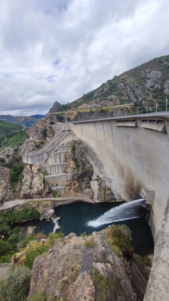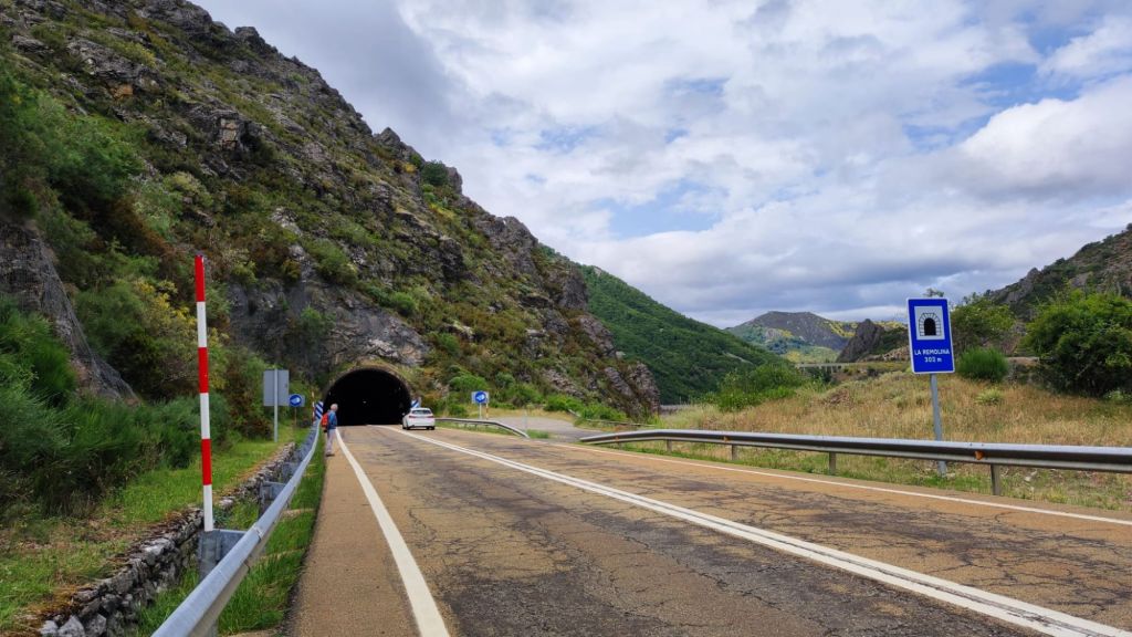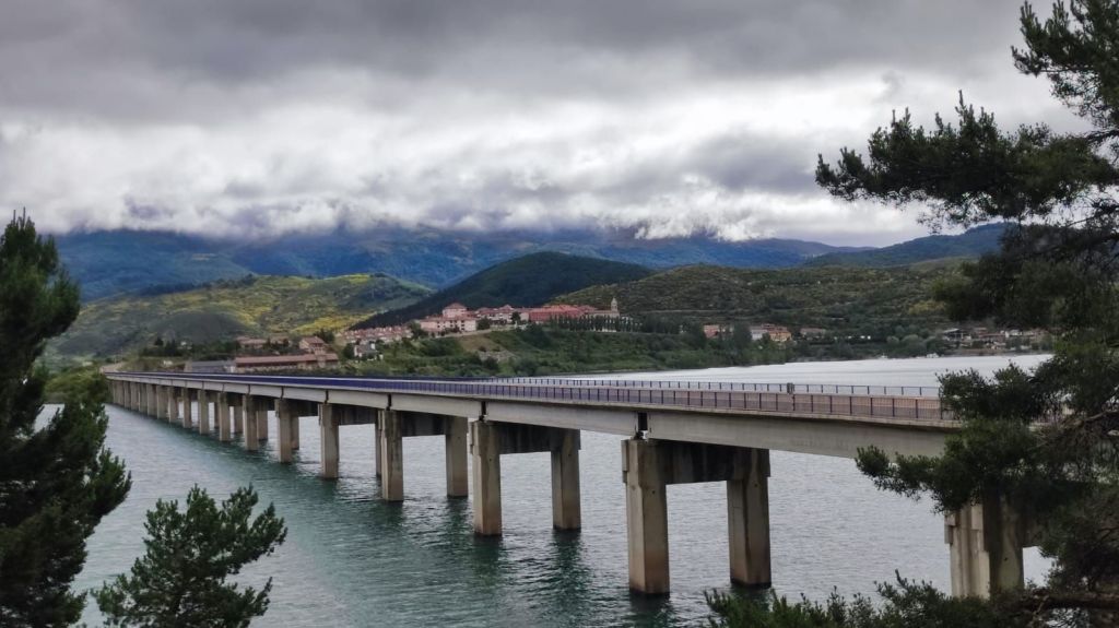 Caminamos por el arcén de la carretera unos 3,5 km, pasamos junto al Mirador de Huelde, sobre el embalse y nos cae un somero chaparrón. Llegamos al túnel de la Remolina (también tiene una acera segregada para peatones) y caminamos los 300 m de túnel hasta llegar sobre la presa. Justo antes de la salida, giramos por otro túnel para bajar por una pista de servicio asfaltada que desemboca en una carretera local que seguimos unos 200 metros hasta entrar en un camino de tierra junto a un arroyo. Continuamos por el camino y unos 700 m más adelante el arroyo de nuestra derecha se une al Esla con sus aguas reguladas por el embalse. Alcanzamos un puente que da acceso a Las Salas y comenzamos el camino de la Calzada romana del Esla. Esta calzada conserva tramos muy completos en los que se pueden observar las marcas dejadas por los carros en su paso constante y fue construida por mandato de Augusto para las guerras cántabras. Seguimos la calzada durante unos 4,5 km hasta la ermita de Nuestra Señora de Pereda. En este tramo pasamos por diversos paneles informativos que nos señalan la presencia de castros vadinienses en las cercanías. El camino aparece salpicado de poemas relacionados con esta tribu prerromana y algunos bancos que reproducen diversas lápidas vadinienses como la de Turenno encontrada en Argovejo y que se expone en la actualidad en el Museo de León. Continuamos el camino junto al Esla y un puente nos acerca a la localidad de Crémenes, lugar en el que finalizamos la etapa de hoy.
