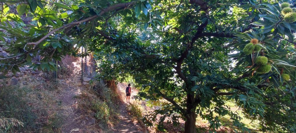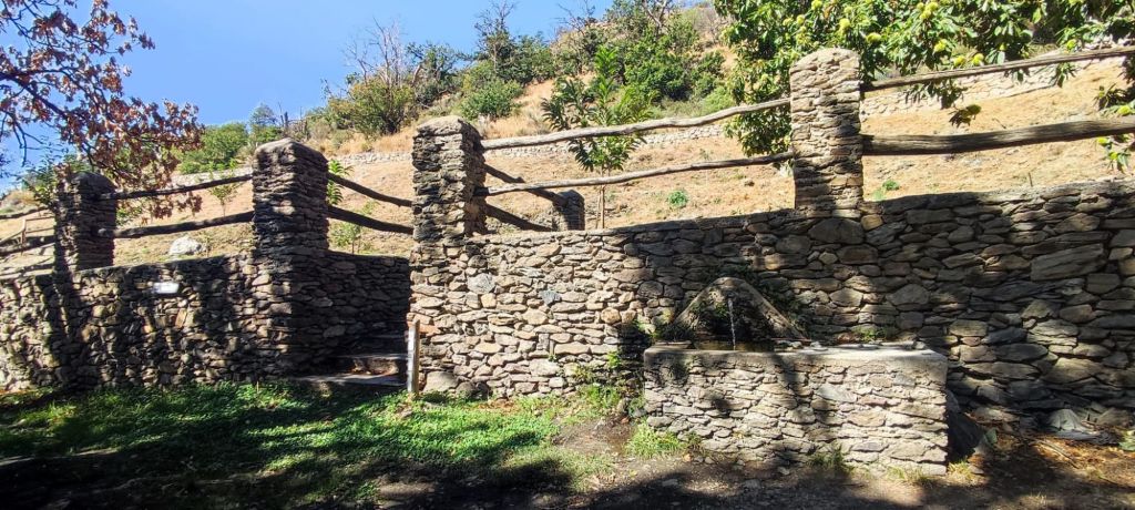 Regresamos un pequeño tramo por el mismo camino que hemos traído hasta llegar a la bifurcación que hemos mencionado anteriormente. Comenzamos a ascender por un empinado y agreste sendero en zigzag hasta un carril, que tomaremos hacia la derecha. Un poco más adelante, abandonamos el carril y entramos en el área recreativa Huerto de las Monjas. Para llegar a ella hay que ascender por unas escaleras de roca. Es un buen lugar para un descanso con mesas, un par de fuentes y un cobertizo refugio. Tomamos una fruta admiramos las vistas del valle del Río Lanjarón y los castaños centenarios que hay por esta zona y nos encontramos con una familia de caminantes que han llegamos un momento antes que nosotros.