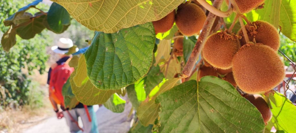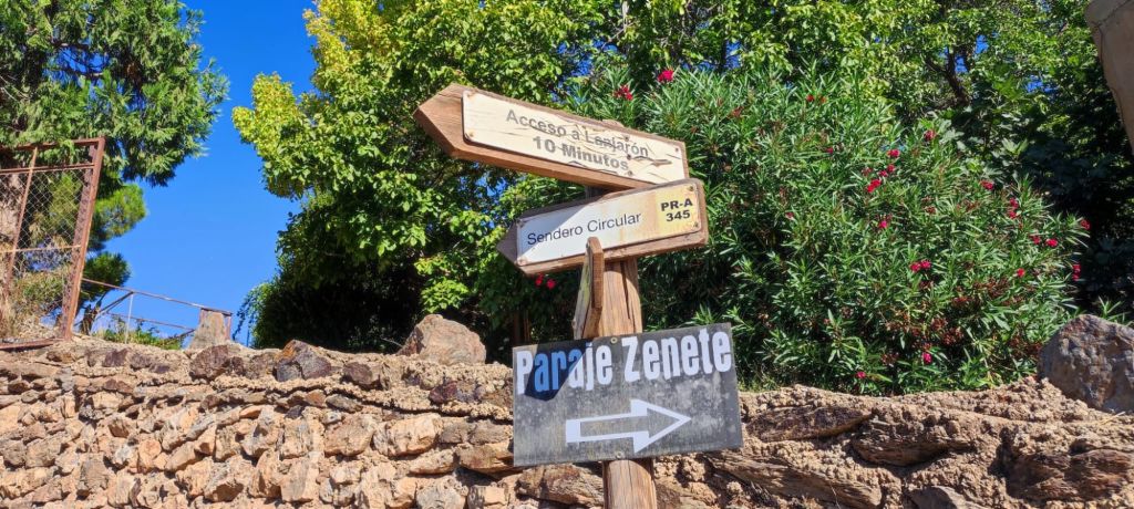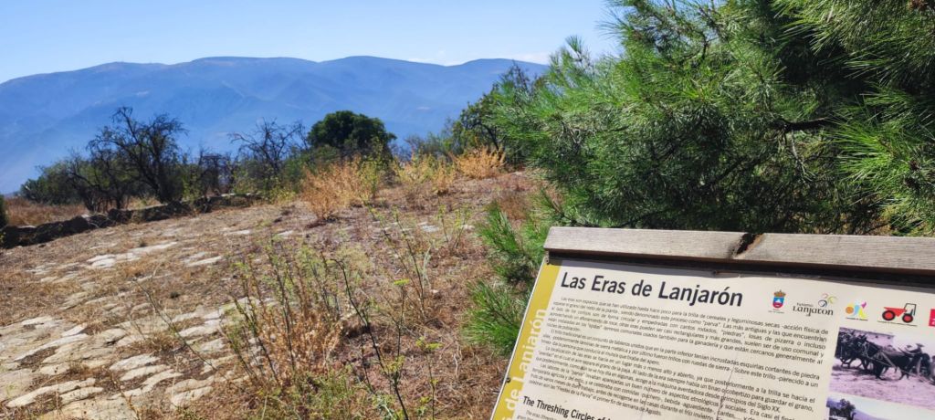 Dejamos el área recreativa por la parte superior tomando un carril en ascenso que dejaremos unos metros más adelante para tomar el camino de la Acequia Cecarta (señalizado y balizado) a la izquierda. Caminaremos paralelos a esta acequia un buen tramo. Esta parte también es muy bonita con magníficas vistas hacia el valle con la Sierra de Lújar al fondo. Abandonamos la acequia e iniciamos el descenso haciaLanjarón. El camino de descenso discurre por senderos empedrados acompañados por tramos de acequia que vuelcan sus aguas a las fincas, y algunos pequeños tramos de carril. La zona es un auténtico vergel con numerosas zonas de sombra. Pasamos junto a una era con un panel informativo sobre las tareas de la cosecha y llegamos al punto en el que este camino se encuentra con el que llevábamos esta mañana. Desde este punto volvemos por la pista cementada que nos dejará junto a la carretera A-348 junto al Hotel Balneario. Pasamos por el área recreativa del Parque del Salada (lugar de arranque del sendero señalizado PR-A-345 y en un par de minutos estamos junto a la fuente de las Adelfas donde dejamos el coche esta mañana.