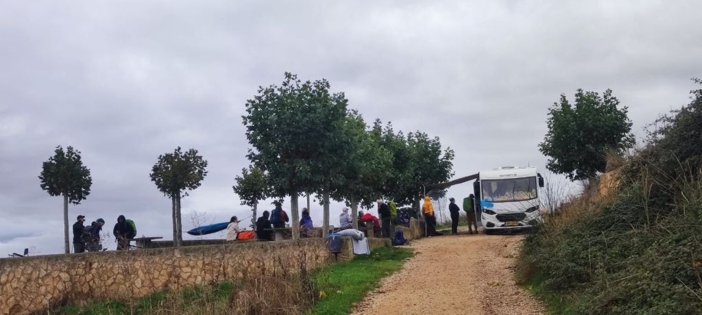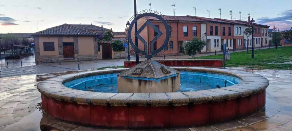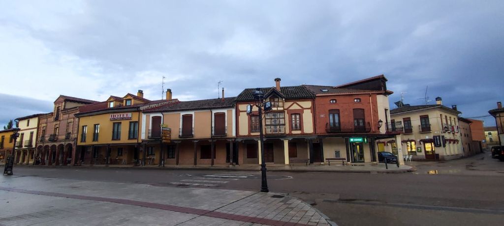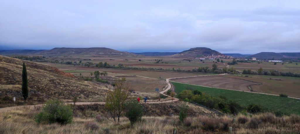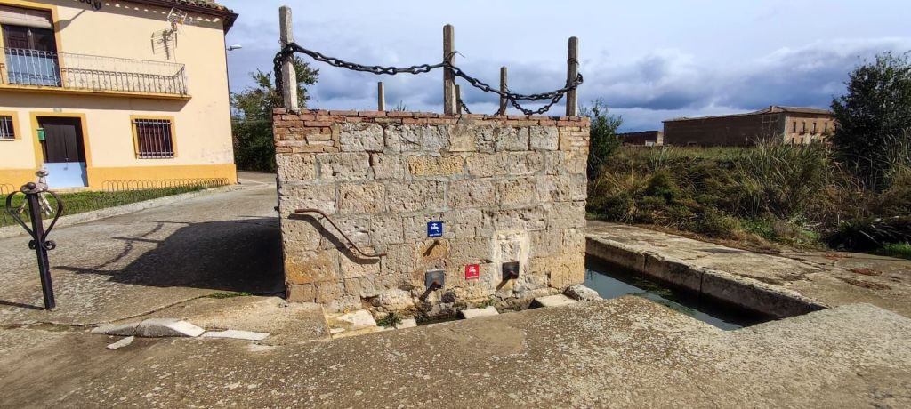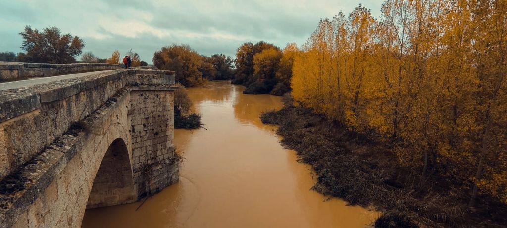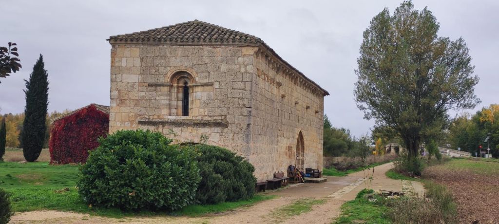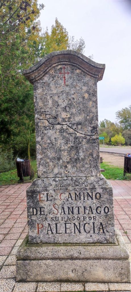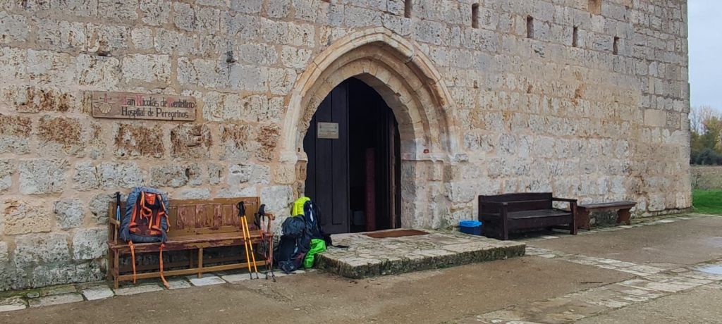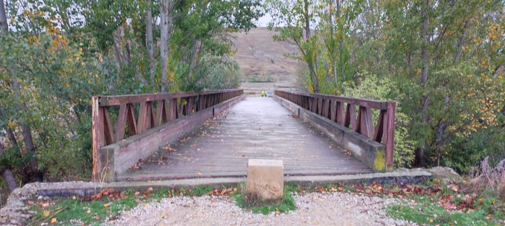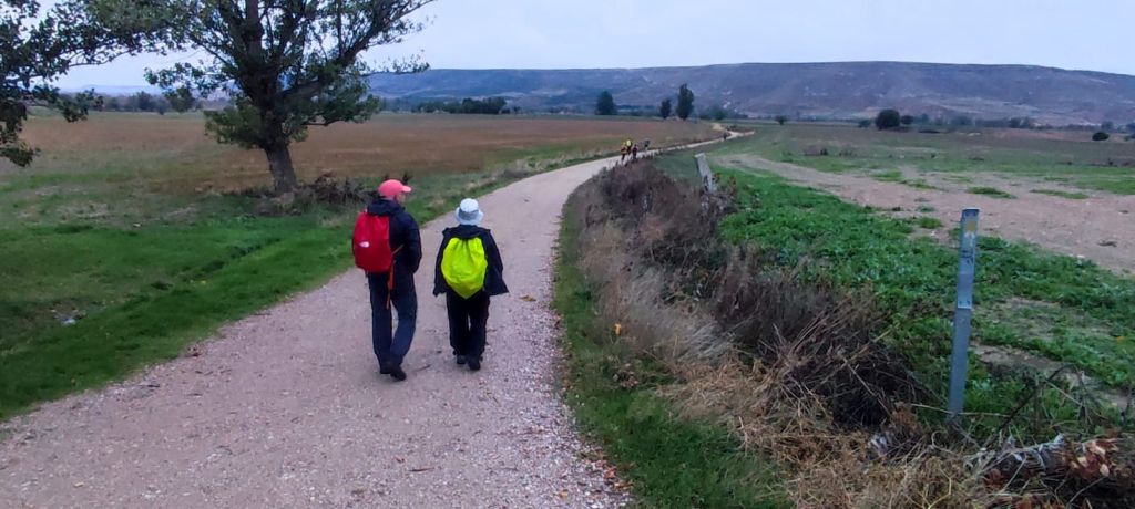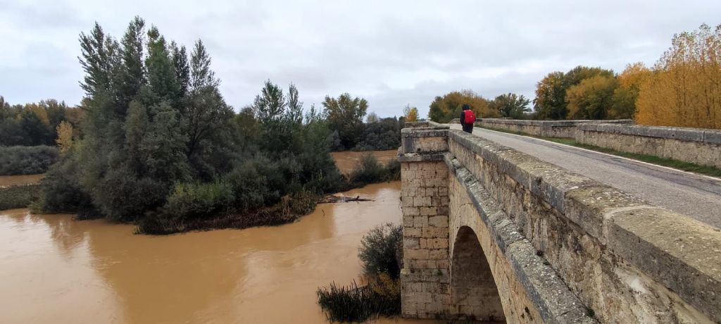Salimos de la Casa de la Unión en Castrojeriz donde nuestra anfitriona Beatriz nos ha preparado un suculento desayuno y un par de bocadillitos para el almuerzo. Pasamos junto a la Iglesia de San Juan, la fuente de San Juan a la salida de la villa y nos dirigimos hacia el río Odra por una pista que cruza la carretera comarcal. Lo cruzamos por un puente de madera (puente Bárcena) e iniciamos lentamente la subida al Alto de Mostelares (927 m) A lo largo de la subida y en la cima encontraremos algunos memoriales en recuerdo de varios peregrinos. En el alto disfrutamos de una panorámica amplia pero algo limitada por la presencia de negras nubes. Tras un llaneo de un km iniciamos el descenso, pronunciado al principio, pero que se suaviza progresivamente. Pasamos por un desvío señalizado hacia Itero del Castillo, pasamos junto a la Fuente del Piojo con un área recreativa en la que hay una food track instalada con mucho ambiente y, al cabo de unos cuatro km llegamos a la ermita de San Nicolás de Puente Fitero, reconvertida en hospital de Peregrinos. Un poco más adelante el mencionado Puente Fitero sobre el Río Pisuerga y entramos en la provincia de Palencia. Este puente, uno de los más largos del camino de Santiago cuenta con once arcadas de sillería correspondientes a varios reformas que han respetado su estilo románico original.