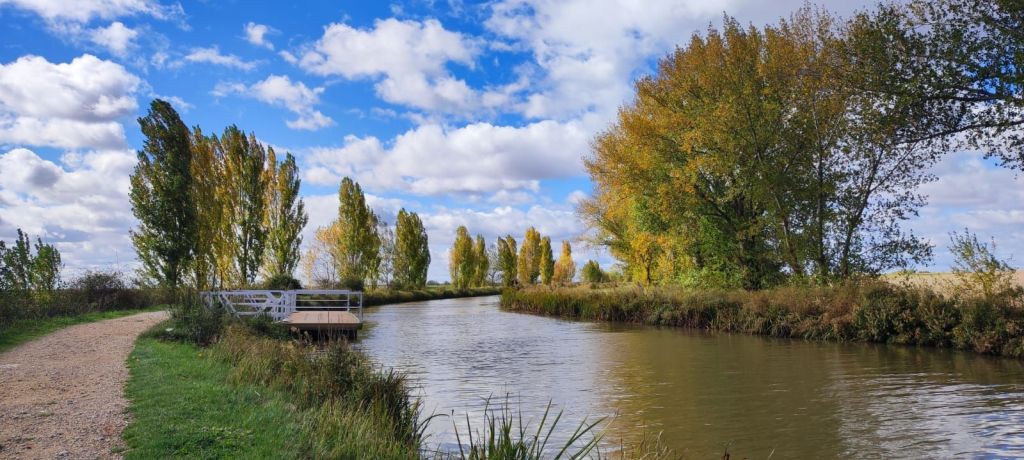 En nuestra décimo quinta etapa de este Camino de Santiago francés nos desplazamos desde la localidad burgalesa de Castrojeriz a la localidad palentina de Frómista. Aunque ha llovido varias veces durante la noche y el pronóstico es de lluvia durante toda la mañana, cuando salimos está muy nublado pero no llueve. En la etapa de hoy vamos a continuar con la tónica paisajística de estos días: etapa casi llana con una única “tachuela” de 927 m, campos de cereal, girasoles y remolachas hasta donde llega la vista y muy escaso arbolado. Algunos bosques de ribera junto a los ríos, un insignificante bosquete de pinos cerca de Boadilla del Camino y un par de ralas hileras de chopos a lo largo del Canal de Castilla. Lo más significativo el cambio de la provincia de Burgos por la de Palencia, un paseo por el camino de sirga junto al Canal de Castilla y la visita a la joya del románico de San Martín de Frómista.