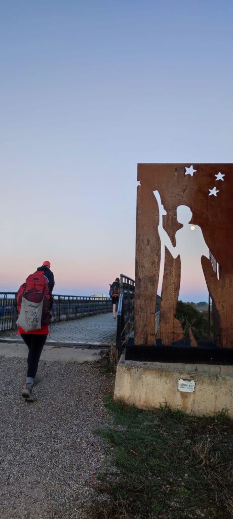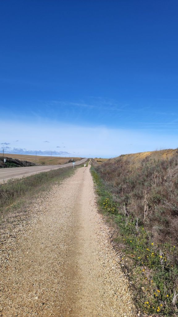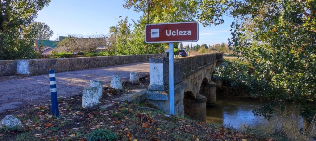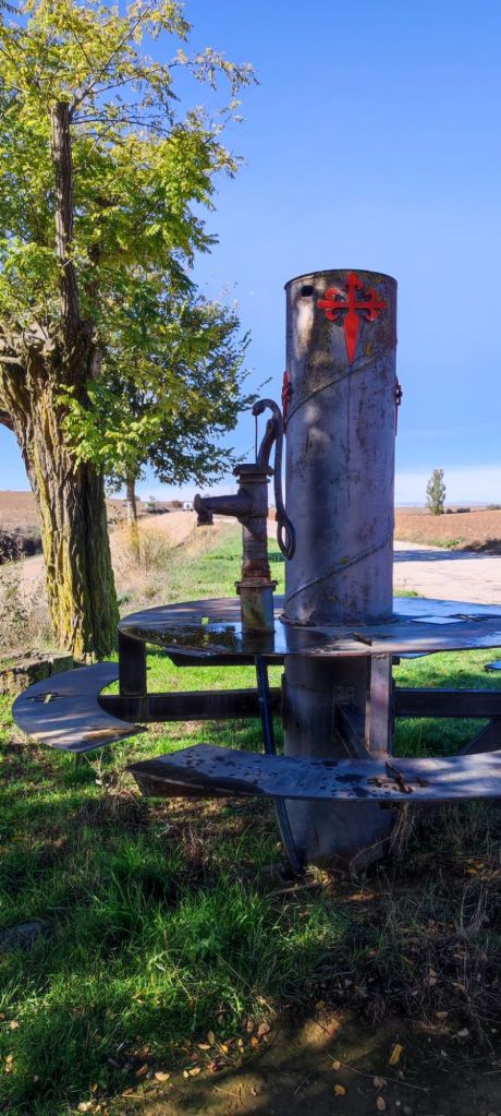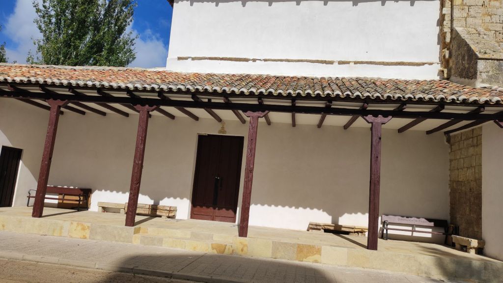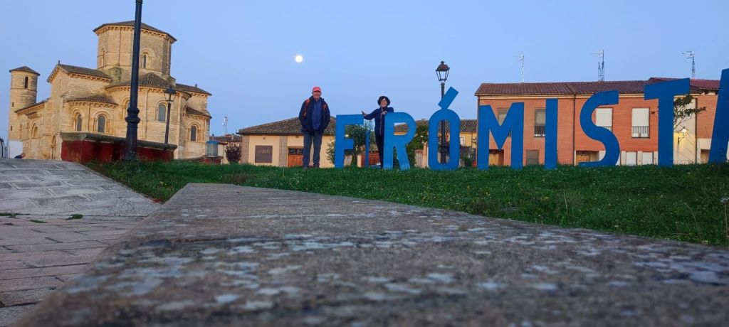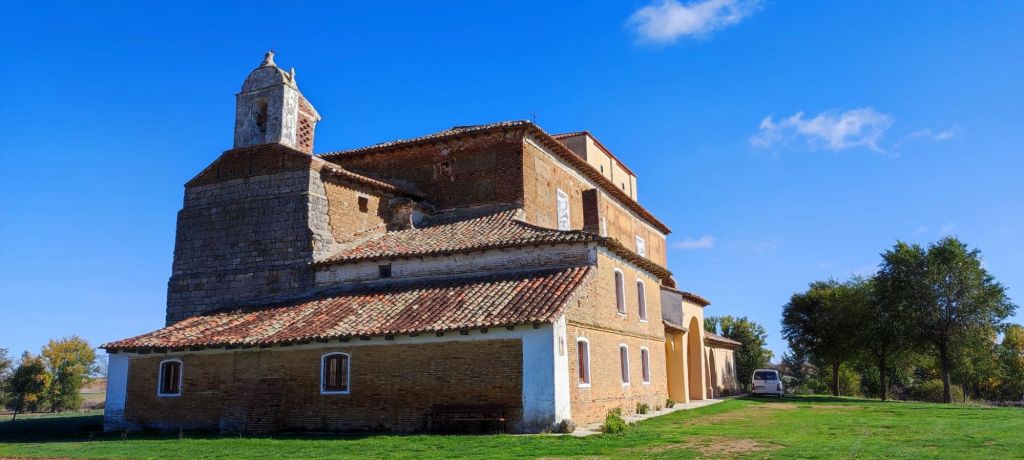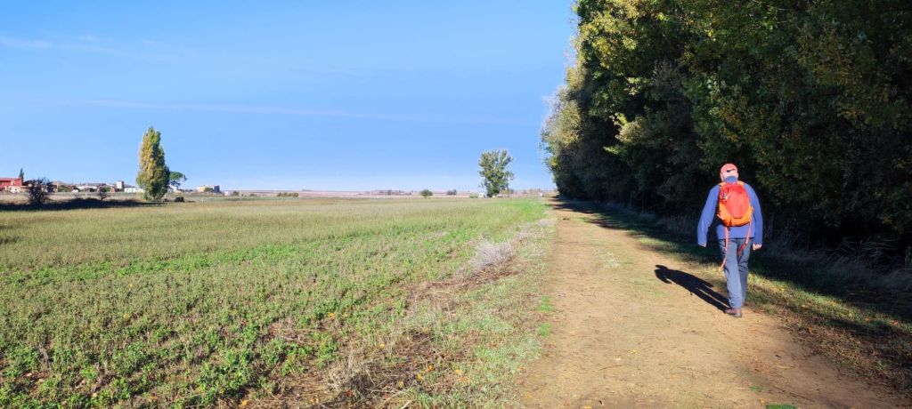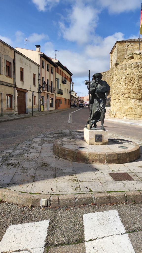 Después de la tormenta que cayó ayer por la tarde en Frómista el día ha amanecido bastante claro pero muy frío. Después de desayunar y dejar nuestro alojamiento el termómetro de la farmacia marca a las ocho y veinte cinco grados. Comenzamos a caminar buscando la carretera P-980 a su paso por Frómista (con acera) hasta cruzar la N-611 por un puente y la A-67 por un paso elevado junto al que hay un monumento al peregrino en acero corten. Seguimos por una senda/andadero paralelo a la carretera P-980 hasta llegar a Población de Campos. A la entrada de esta población encontramos un albergue con una escultura de una mano gigantesca y al otro lado la Capilla de San Miguel del siglo XIII junto a un área recreativa. Cruzamos Población de Campos y, justo antes de cruzar el Río Ucieza, tomamos la variante por Villovieco (bien señalizada) y pasamos junto a la Iglesia de Nuestra Señora del Socorro, de estilo tardorrománico, que estuvo anexa a un hospital de peregrinos. La variante se dirige a Villavieco por un camino rural desde el que vemos al grueso de los peregrinos que caminan junto a la carretera.