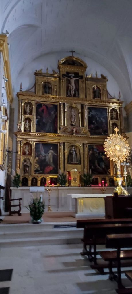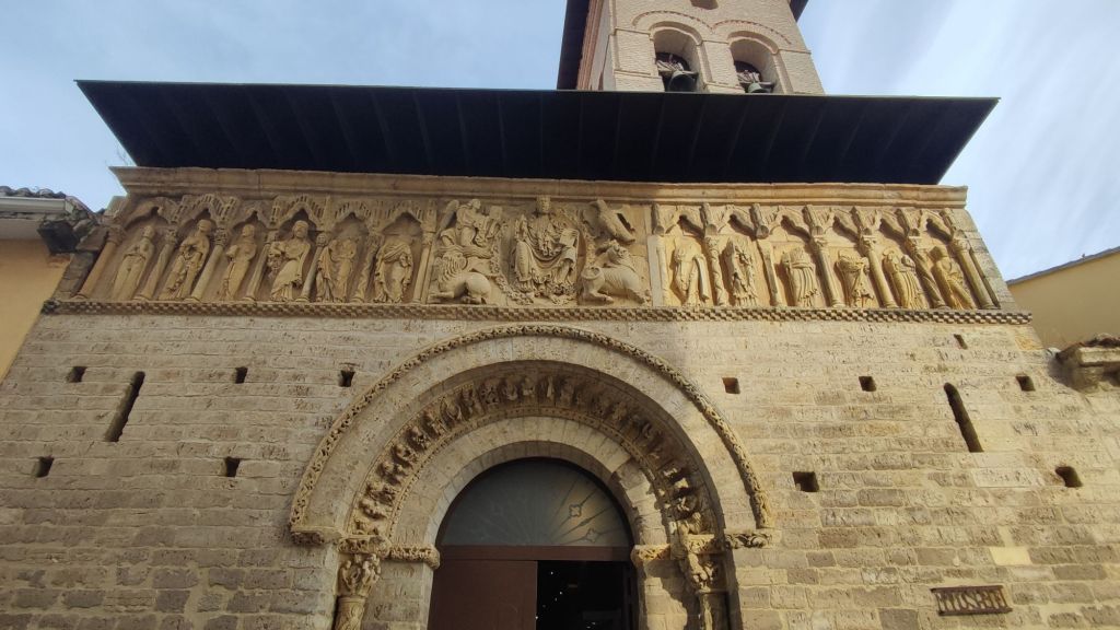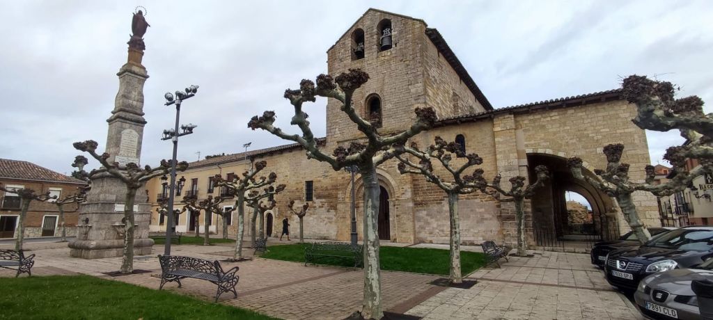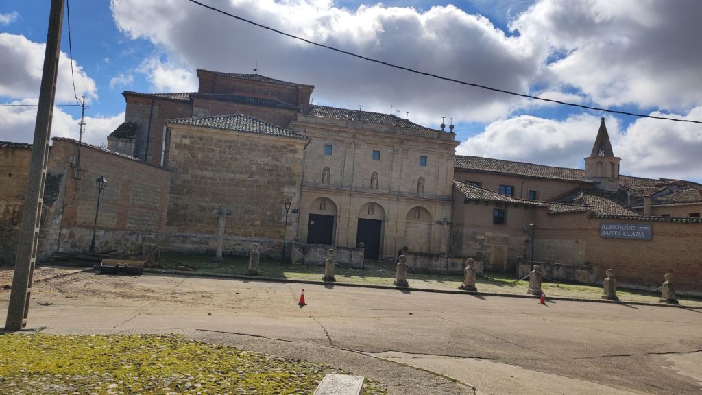 Saliendo esta localidad retomamos el andadero junto a la carretera. En este punto se inicia una suave subida hacia un collado desde el que ya divisaremos Carrión de los Condes. A la entrada de Carrión nos sale al paso la Ermita de la Piedad con una espadaña bastante deteriorada. Al poco encontramos otro peregrino, de bulto redondo, junto a la muralla oriental de Carrión que da paso al casco histórico. Muy cerca el Monasterio de Santa Clara con su bonito patio. Parte del monasterio es ahora albergue de peregrinos. Continuando camino encontramos la Iglesia de Santa María del Camino de estilo románico con friso decorado con una Epifanía con Herodes, la Virgen y el niño. Ya en el centro de la localidad destaca la iglesia de Santiago (hoy museo) con un espectacular friso escultórico con Pantocrátor rodeado por el tetramorfos. Bajo el friso una moldura de ajedrezado jaqués muy típico del arte románico. En este punto llegamos a nuestro alojamiento y dejamos el resto de Carrión para la etapa de mañana.