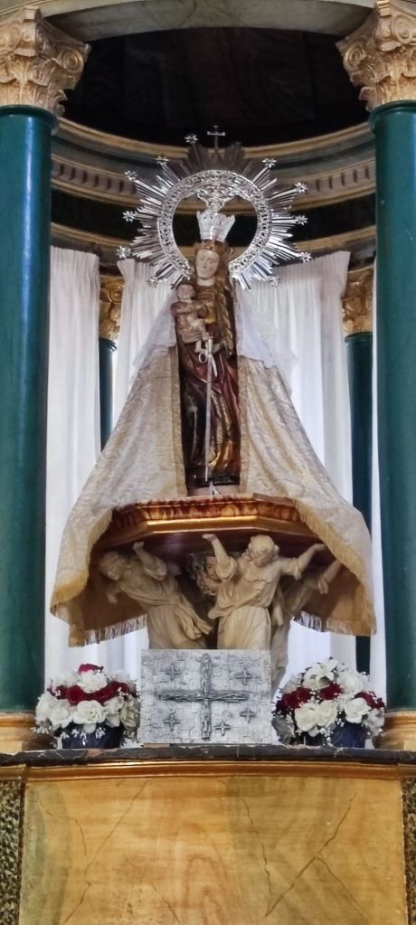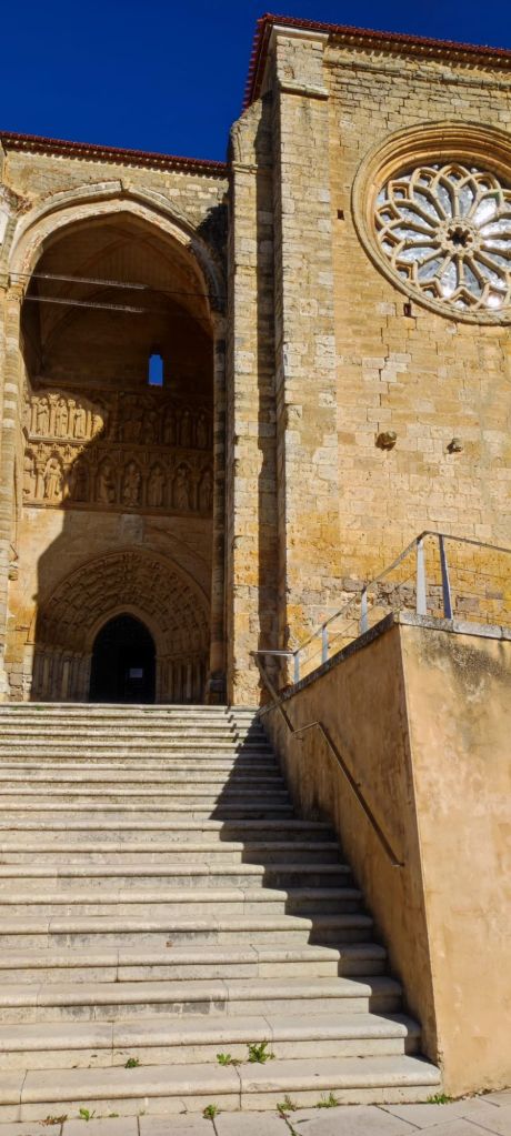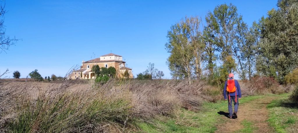 El día está muy soleado pero el aire sigue siendo muy frío. Al cabo de 3,4 km llegamos a la entrada de Villavieco en el que otro peregrino en acero corten nos da la bienvenida. Por un puente de piedra salvamos el río Ucieza que baja bastante crecido. La variante transcurre desde este punto por un camino paralelo al río y junto a tierras de cultivo. El bosque galería está repleto de aves que nos amenizan el caminar con su canto. Una solitaria cigüeña busca su alimento en una finca a nuestra izquierda. Esta variante es muy poco transitada y solamente nos encontramos con otra pareja de caminantes en los 6 km que hay hasta el lugar en el que se encuentra la majestuosa Ermita de la Virgen del Río con área de descanso con bancos en el que encontramos otras cinco personas. La iglesia, de una nave con gran cúpula, alberga una talla policromada de la titular del templo y un busto en alabastro de Santiago Peregrino. En este punto salimos a una carretera comarcal que en un kilómetro y medio nos deja en la entrada de Villalcázar de Sirga. En esta localidad sobresale la imponente iglesia gótica de Santa María la Blanca, con dimensiones catedralicias destaca un magnífico pórtico con doble friso tallado con el Pantocrátor rodeado por los evangelistas bajo la forma de los animales que los simbolizan (tetramorfos). Junto al pórtico un enorme rosetón hiperdecorado. En la plaza contigua una escultura de Pablo Payo, mesonero mayor del camino de Santiago, esculpido como peregrino medieval contemplando la iglesia cómodamente sentado mientras toma un refrigerio.