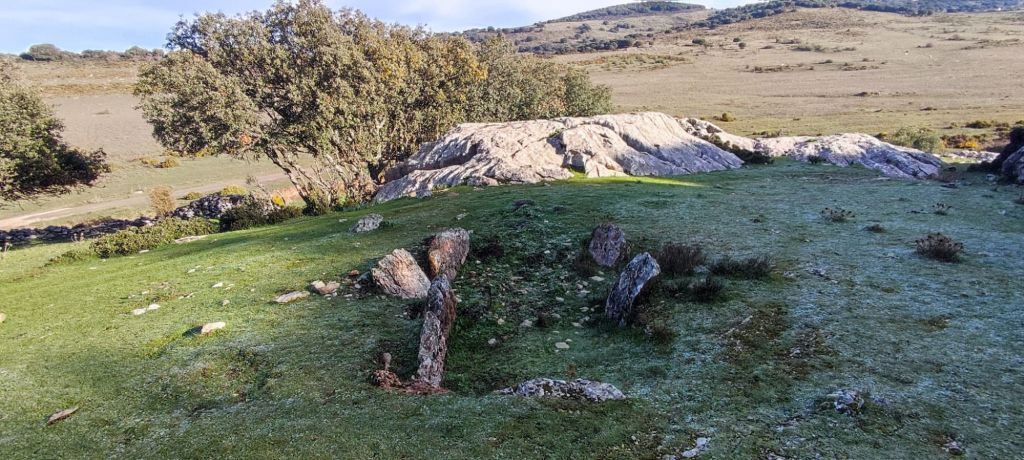 Iniciamos la ruta siguiendo el mismo carril por el que hemos llegado hasta las inmediaciones del Chaparro centenario de las Ánimas , el cual nos llevará a los Llanos del Apeo. Se trata de la Cañada de las diez pilas que desemboca en otro camino junto al Arroyo de los Alamos, lo cruzamos y nos acercamos a ver los restos del Dolmen de Patagalana o de Los Lajares que no encontramos en aquella ocasión. Aunque presenta un lamentable estado de deterioro, aún pueden observarse varios ortostatos (cuatro a un lado y dos a otro) y se reconoce su orientación N-S.