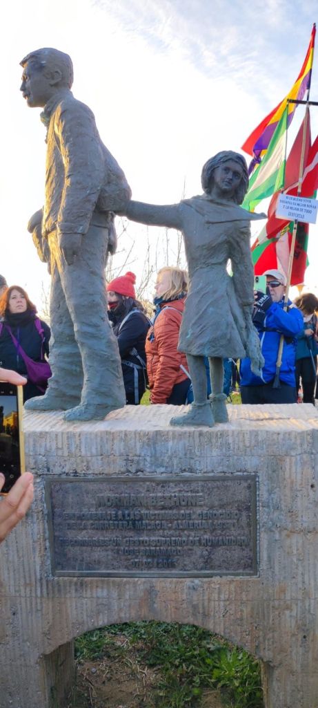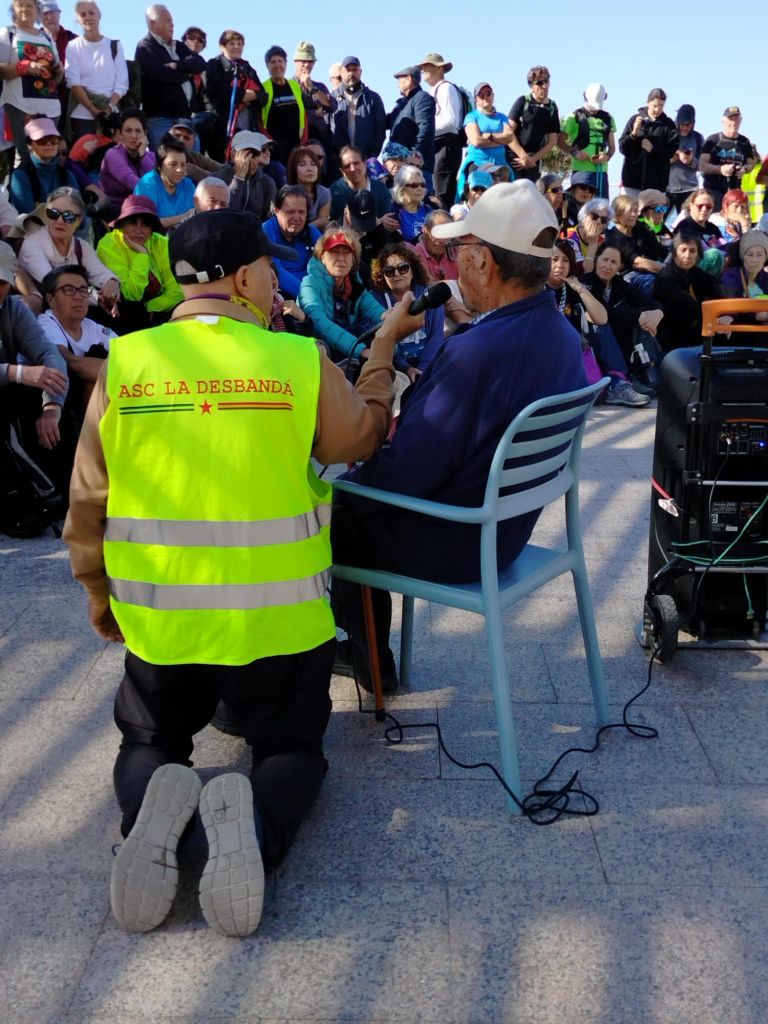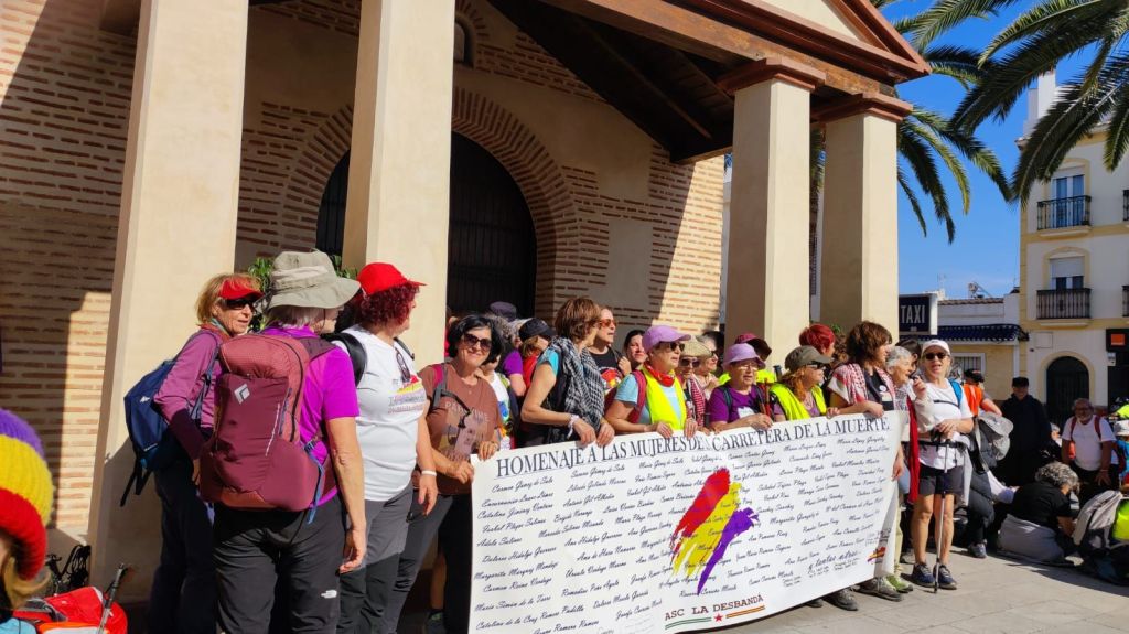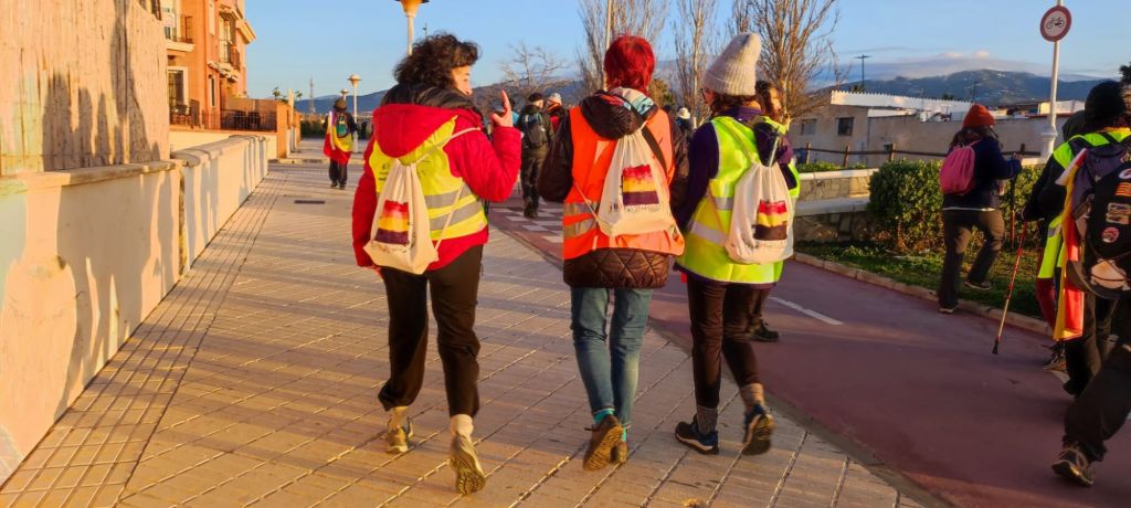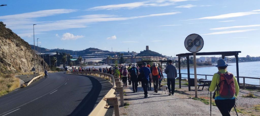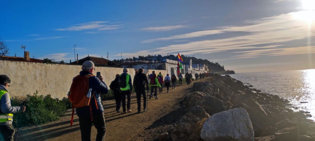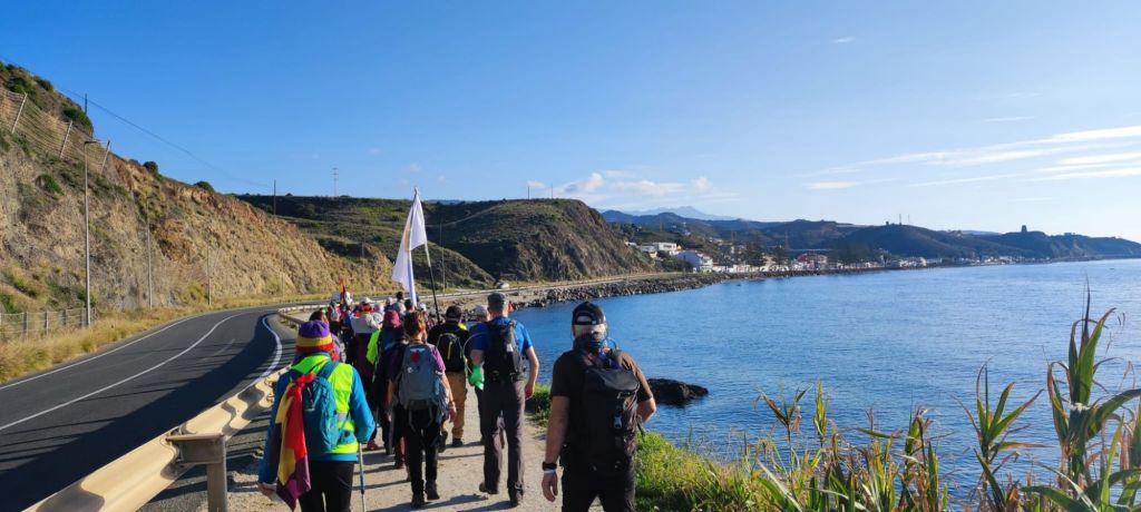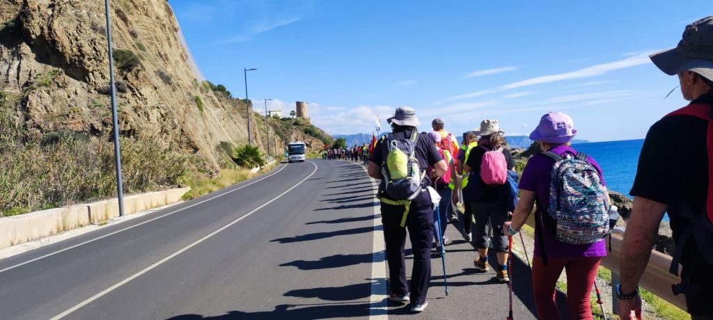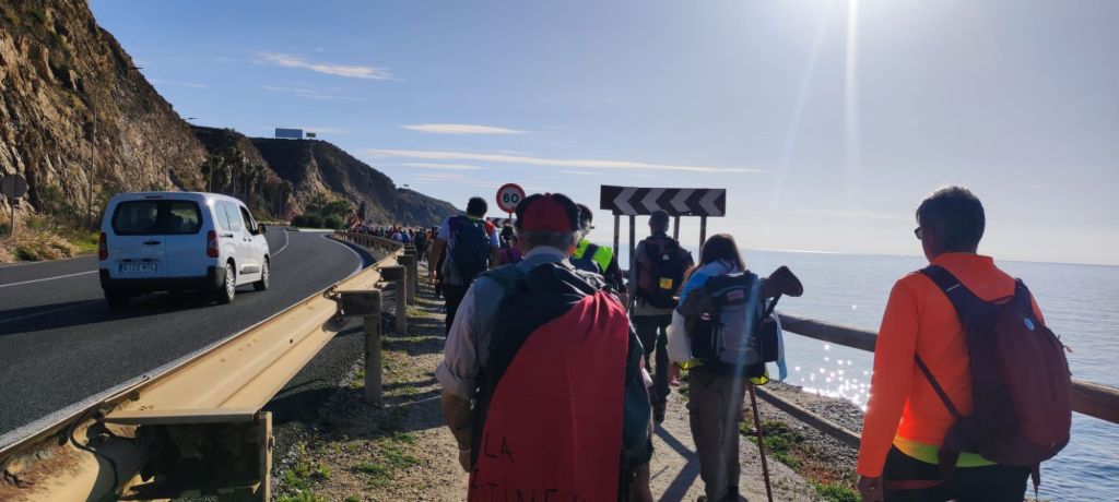 Seguimos recorriendo la larga playa de Lagos, la Playa del Pijil y llegamos al Morche donde está previsto un avituallamiento con naranjas, higos secos y agua. En la zona se han habilitado unas mesas y el ayuntamiento ha dejado abiertos los aseos que se encuentran en un estado impecable. Tras la parada retomamos la marcha en direccion al paseo marítimo de Torrox que con el día tan bueno que hace se encuentra a rebosar de turistas haciendo el aperitivo. Al llegar a las inmediaciones del faro de Torrox la organización tiene preparada una sorpresa: un superviviente de La Desbandá que vive en Torrox narra su experiencia de aquellos días de 1937. Salimos de Torrox y entramos en el tramo más complicado del día ya que caminamos junto al arcén de la carretera con un intenso tráfico. Caminamos junto a la carretera hasta llegar a Calaceite en donde nos desviamos por un tramo de la antigua N-340 inutilizado en el que uno de los guías nos habla de la existencia de un famoso pecio que se encuentra muy cerca de la playa y cuyo hundimiento tiene alguna relación la batalla de Málaga y La Desbandá. Desde este punto continuamos hasta El Playazo y caminamos junto a las playas de poniente de Nerja: el Playazo y la Torrecilla. En la Torrecilla entramos ya en el casco urbano de Nerja y callejeamos hasta la Ermita de las Angustias donde se muestra una pancarta con los nombres de algunas de las mujeres que, con certeza, perdieron la vida en La Desbandá. Finalizado este acto continuamos camino hacia el Polideportivo E. López Cuenca donde ha tenido lugar la comida y ha terminado la etapa.
