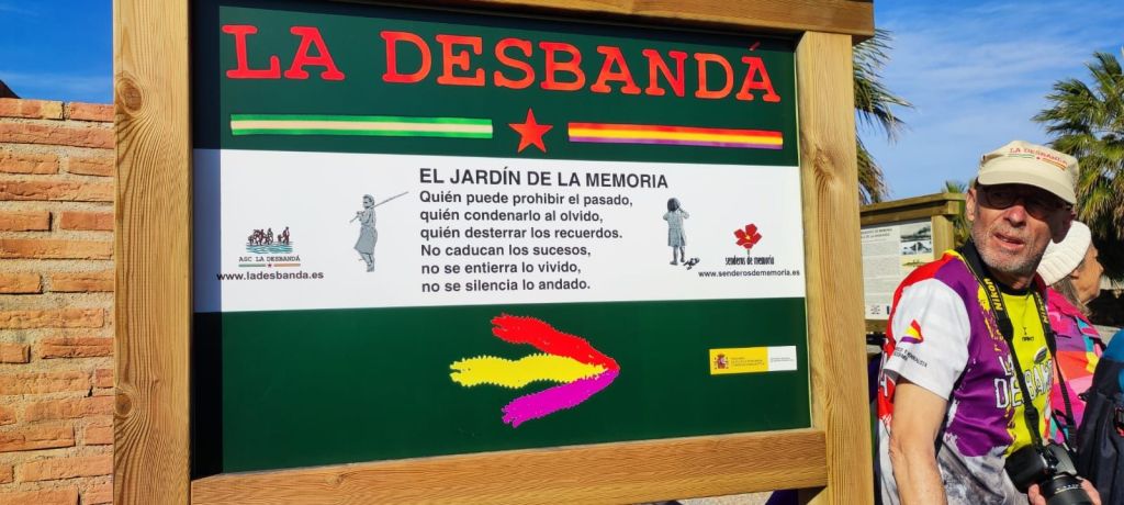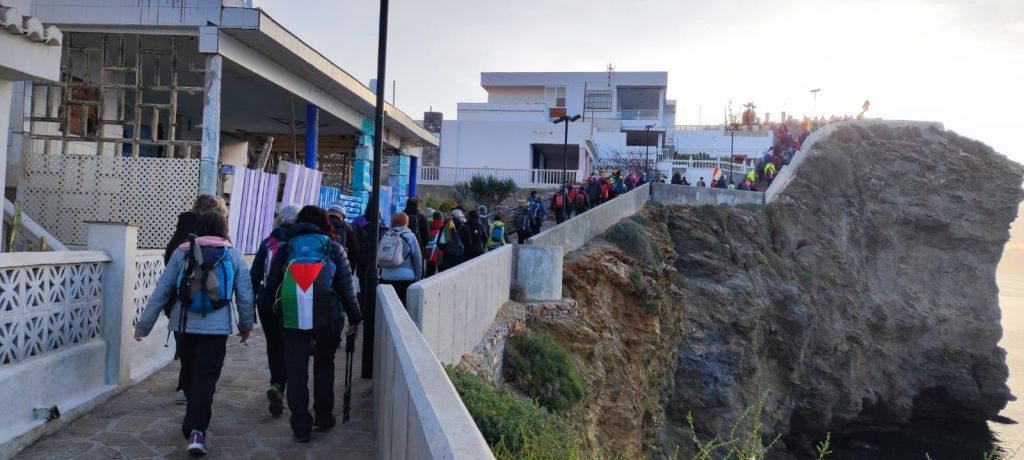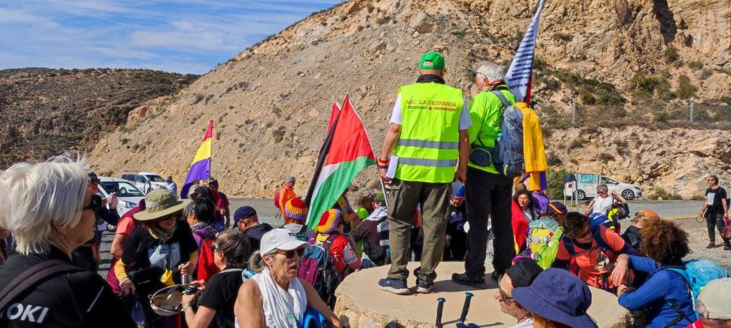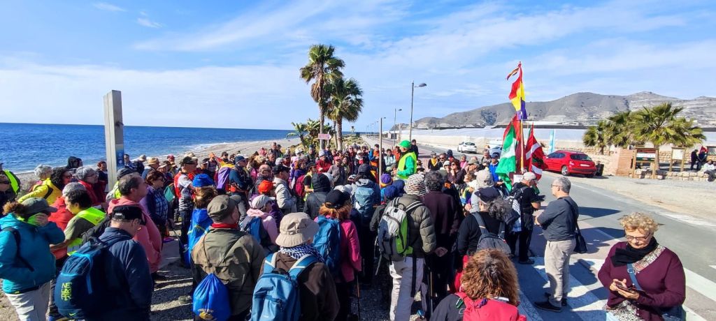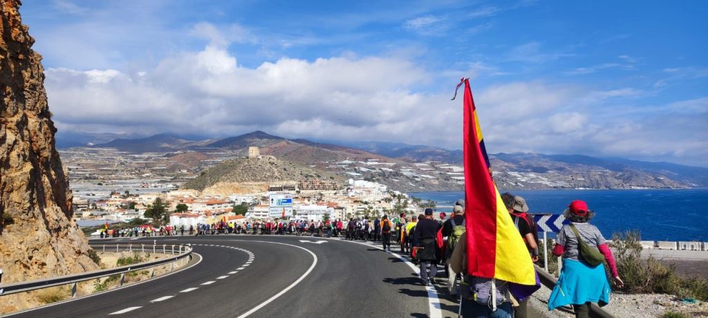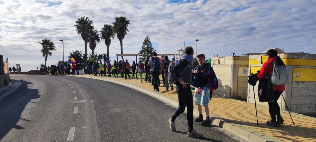 Iniciamos la caminata junto a una escultura de la Virgen del Carmen en dirección al Puente colgante de Jolúcar (una bonita pasarela sobre los acantilados) subiendo por unas escaleras junto a unas casas que se asoman también a los acantilados. La ruta continua por el borde del acantilado y llegamos a un mirador sobre la playa de Torrenueva y a la playa nudista de La Joya. Tras pasar por el aparcamiento habilitado para esta playa cruzamos la carretera nacional, pasamos junto al Faro de Sacratif y caminamos aproximadamente dos km por la antigua carretera 340 con el pavimento de grava, pasamos por un mirador desde el que atisbamos las grandes extensiones de invernaderos y bajamos hasta la playa de Carchuna. Recorremos 2,5 km por la playa y llegamos al Fuerte de Carchuna (también mencionado como Castillo de Carchuna. Una fortificación construida en el siglo XVIII para proteger la zona de ataques piratas fue empleado como prisión por el bando franquista para acoger prisioneros de guerra republicanos. El lugar fue asaltado con éxito por fuerzas republicanas y permitió la liberación de unos 300 presos. En el día de hoy se ha inaugurado junto al Fuerte el jardín de la Memoria con la instalación de 14 paneles informativos en los que se recogen 14 hitos de la memoria de la La Desbandá entre Málaga y Almería. En el interior del Fuerte hay una exposición permanente con fotografías de la época. En este punto se realiza el avituallamiento diario.