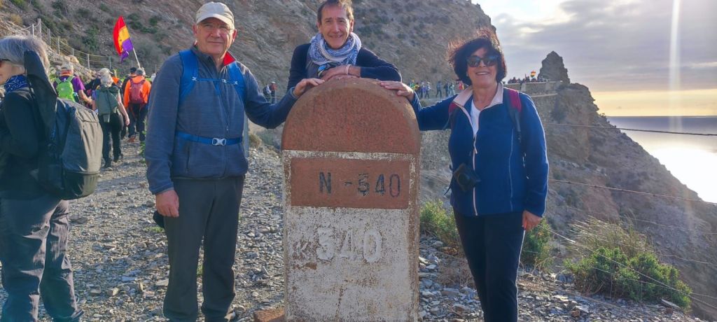 Continuamos por la playa hasta llegar a las primeras casas de Calahonda, localidad que vamos bordeando por la Carretera N-340 en continua subida. Pasamos por el Mirador de Calahonda y llegamos al parking de la Playa de la Conejita, seguimos hasta el mirador de Punta Rijana en el que realizamos un reagrupamiento. Continuamos la caminata por el arcén de la Carretera y llegamos a la zona de las trincheras. Una persona de la organización toma la palabra y explica sobre el terreno los lugares que ocuparon las trincheras de ambos bandos y algunas de las tácticas que se siguieron. Desde este punto toca subir un fuerte repecho hasta llegar al túnel de la Rijana, que cruzamos por la acera, y a la salida comienza un descenso que nos lleva hasta la entrada de Castel de Ferro. Cruzamos el pueblo y nos dirigimos hacia el ÍES Sayena donde se sirve la comida y se da por finalizada la etapa.