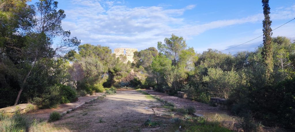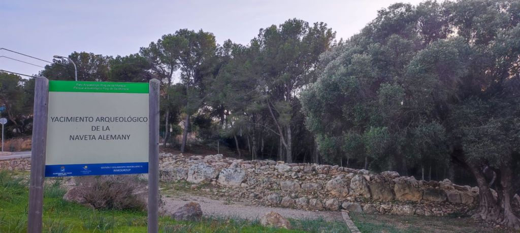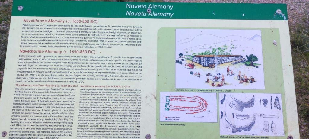 Continuamos nuestro paseo por el Camí de Sa Porrassa, pasamos junto a la Biblioteca municipal, en cuyo jardín posterior encontramos un nutrido grupo de gallinas con sus pollitos y, por la acera junto a la carretera llegamos hasta el Yacimiento Arqueológico de la naveta de Alemany. Se trata de una naveta de habitación: una estructura de planta alargada, con una especie de ábside redondeado y con la entrada orientada hacia el sur. No se dispone de una datación precisa pero de los restos materiales encontrados, elementos de industria ósea, lítica , cerámicas de la fase naviforme o un pequeño puñal de bronce, puede ubicarse en la etapa del Bronce Medio (1.600-850 a.C.) Desde este punto hasta el inicio de la ruta ya sólo nos queda algo más de un kilómetro de distancia por una zona ligeramente urbanizada y bajo la sombra de un denso pinar.