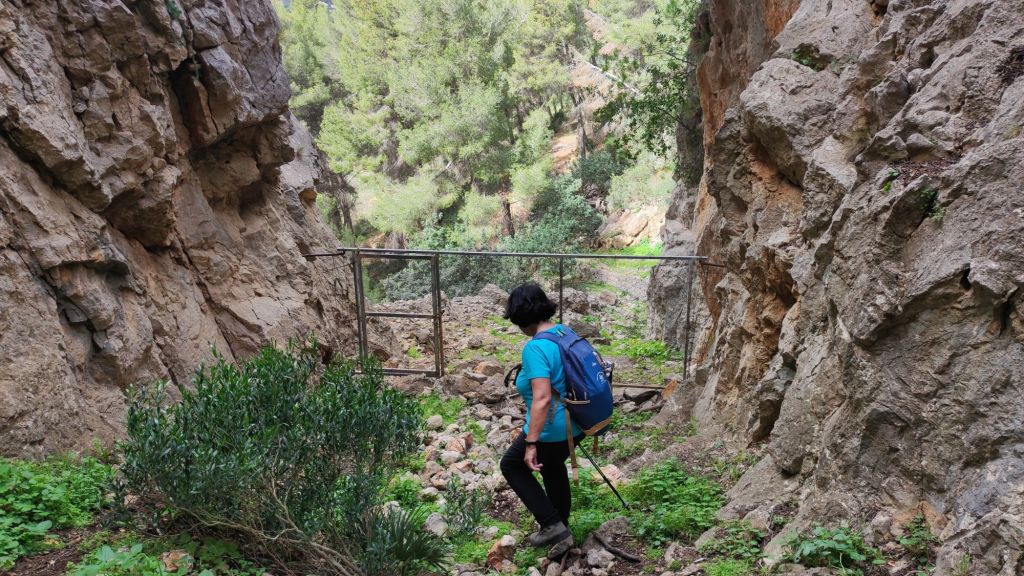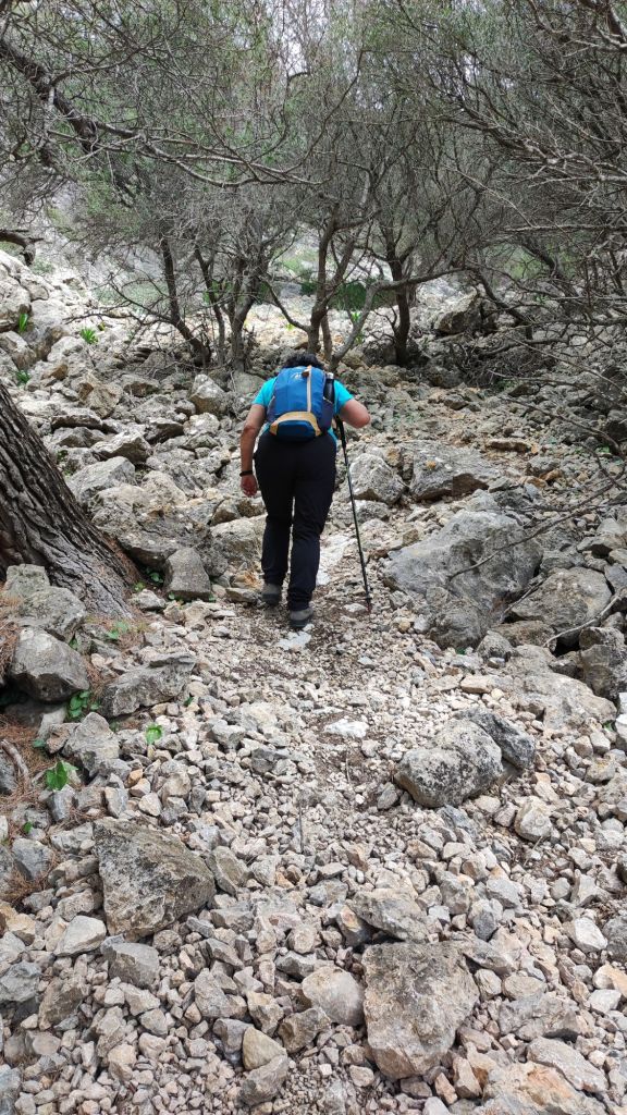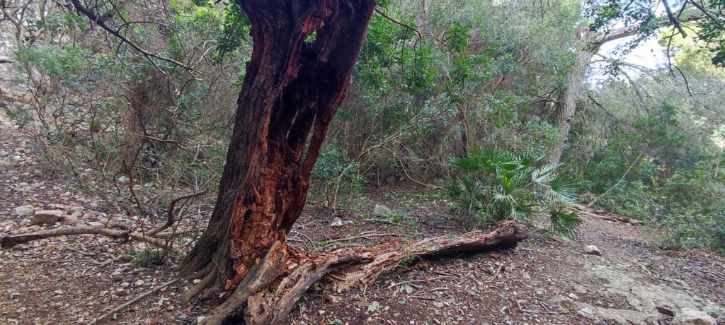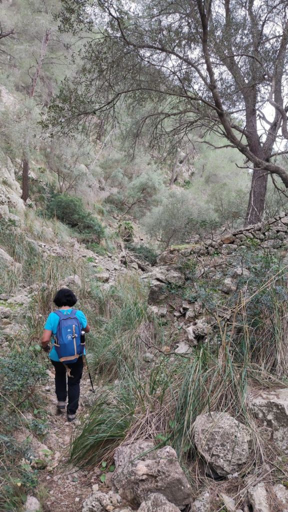 Reemprendemos la marcha en la misma dirección por la que hemos llegado por una vereda bastante difuminada y pedregosa hasta alcanzar el Collado d’en Garrafa para dirigirnos a un denso pinar a la izquierda buscando un sendero que nos adentra en el Comellar de Can Pau. Esta vaguada, al principio amplia, se va estrechando poco a poco hasta conformar un estrecho sendero entre grandes rocas que acometemos con mucha precaución por fuerte pendiente y la presencia de bastante roca suelta. Pasamos junto a los restos de una caseta de leñadores y, finalmente, llegamos a un estrecho desfiladero cerrado por una cancela practicable. Cruzamos la cancela y nos sorprenden unas impresionantes paredes de piedra que sujetan el camino. Lo seguimos hasta llegar a una pista de tierra que tomamos hacia la izquierda. La pista desemboca en una cancela cerrada con cadena y candado. Nos planteábamos saltarla cuando un vecino con un coche se acerca y amablemente, nos abre la puerta. Desde este punto sólo nos queda volver por la acera junto a la carretera hasta el punto en el que hemos dejado el coche.