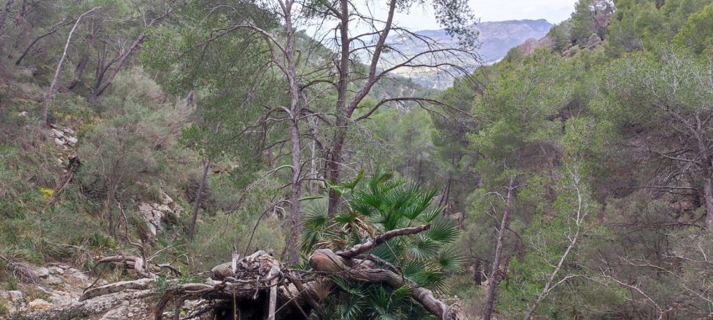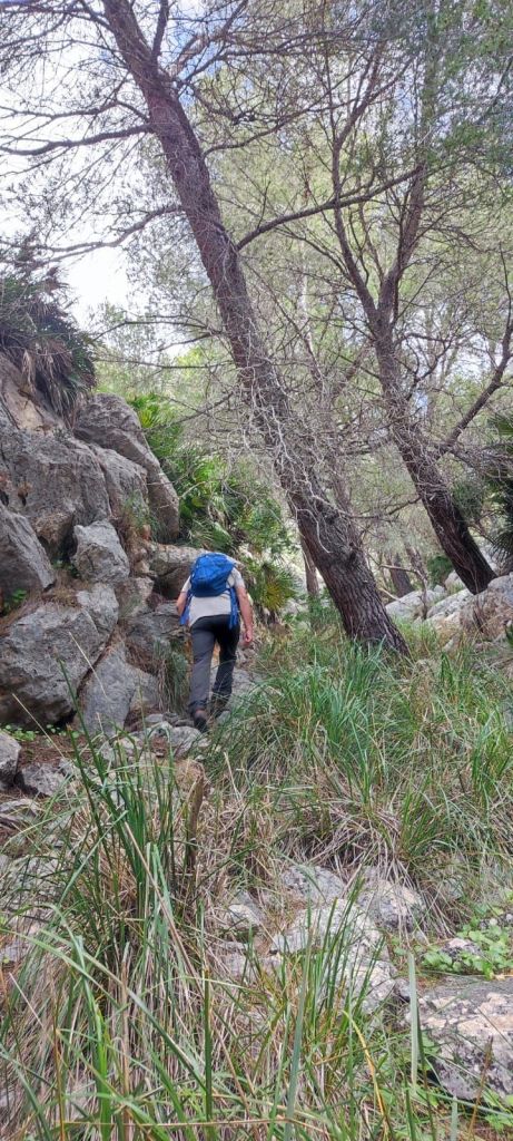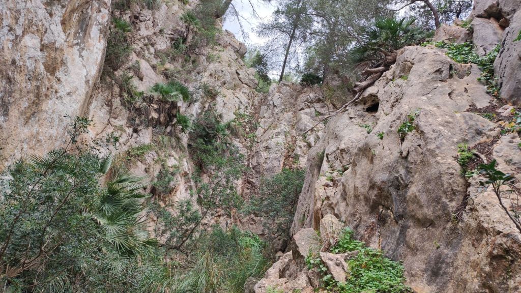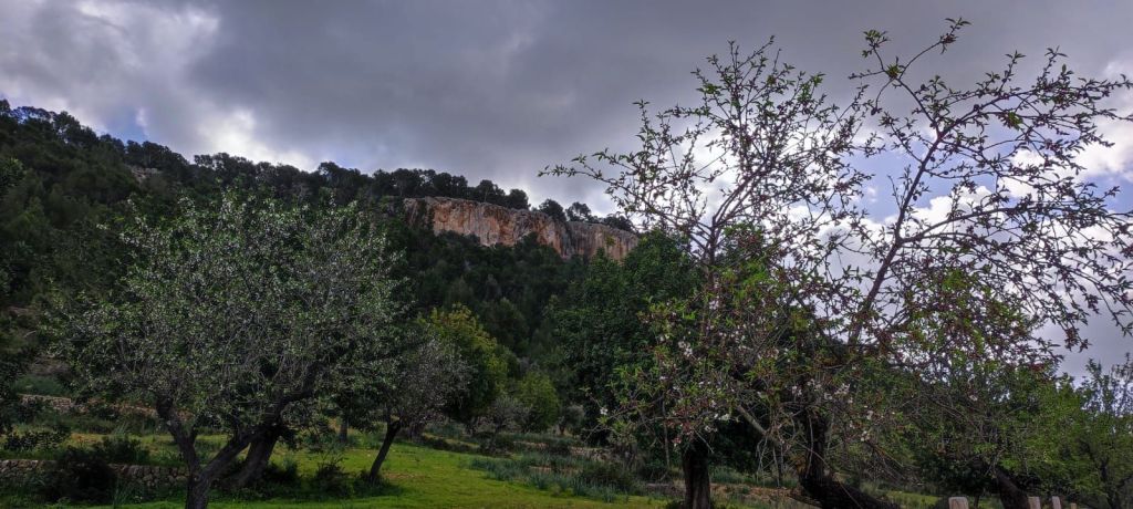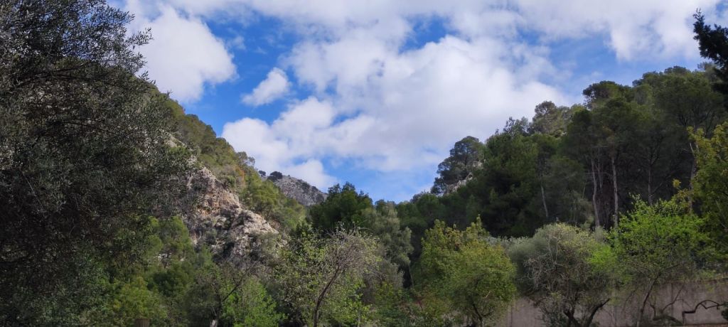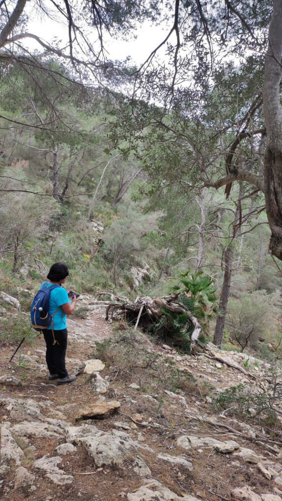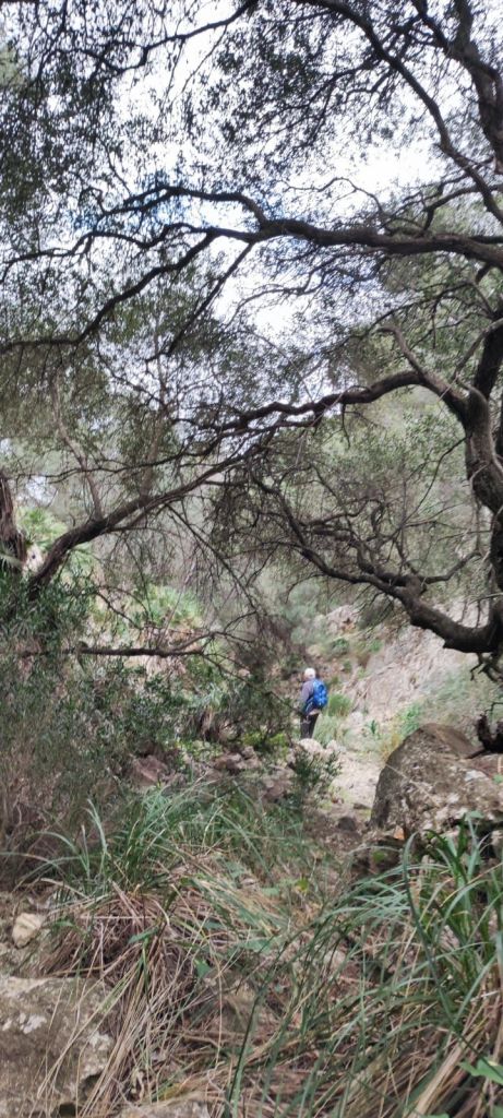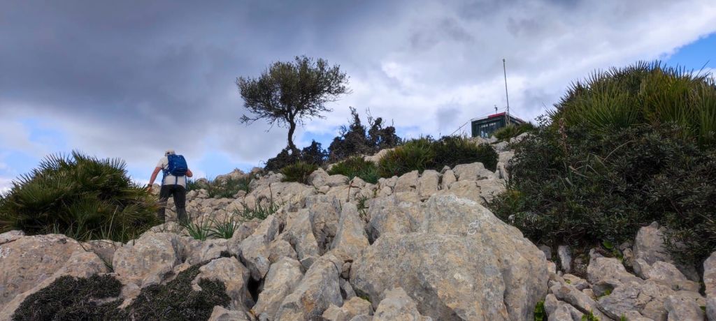 Iniciamos la ruta junto al polideportivo municipal de Andratx donde hay un amplio aparcamiento. Desde aquí retrocedemos hasta la carretera que viene de Palma que recorremos primero por la acera y, más tarde, por una senda ciclable que nos lleva hasta un camino rodeado de almendros por el que llegamos hasta unos depósitos de agua del Ayuntamiento de Andratx. Entre los depósitos arranca un sendero entre matorrales. Al poco de iniciar el sendero encontramos un desfiladero rocoso con algunas oquedades mientras entramos en una vaguada que parece ser el lecho de un barranco. La subida de esta vaguada (Coma de Sa Teia) va alternando tramos de senda con pedregales y poco a poco vamos ganando altura. Al pasar la curva de nivel de los 400 m encontramos a una pareja de Barcelona que desciendo por el camino que traemos. Cambiamos impresiones, nos avisa de que el camino se pierde más adelante y continuamos la subida. Llegamos a una zona de meseta y, tirando de GPS, nos dirigimos hacia la derecha para dirigirnos hacia un roquedal que es un excelente mirador natural. Vemos la Bahía de Palma, Andratx, Mafaluf, Cabrera, etc. Regresamos por el mismo camino, pasamos el punto por el que hemos culminado la ascensión y nos dirigimos a otro pedregal que compone otro excelente mirador sobre la Sierra de Tramuntana. A pesar de lo nublado del día vemos las principales cimas de esa sierra y, a nuestra derecha, el Puig d’en Garrafa que es nuestro próximo objetivo coronado por una vetusta caseta contra incendios. Primero descendemos ligeramente hacia una hondonada desde la que se inicia la subida por un terreno rocoso y sin camino hasta alcanzar la cima de este modesto pico, situado a 462 m de altura, y coronado por un vértice geodésico y la mencionada caseta contra incendios. Aprovechamos para reponer fuerzas a la sombra de la caseta y disfrutar de las bonitas vistas.