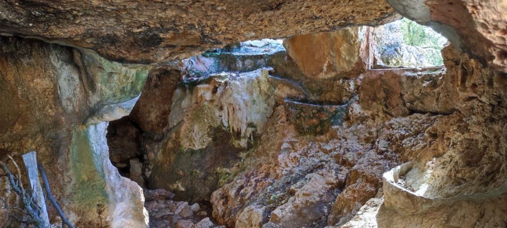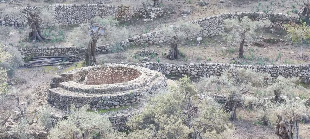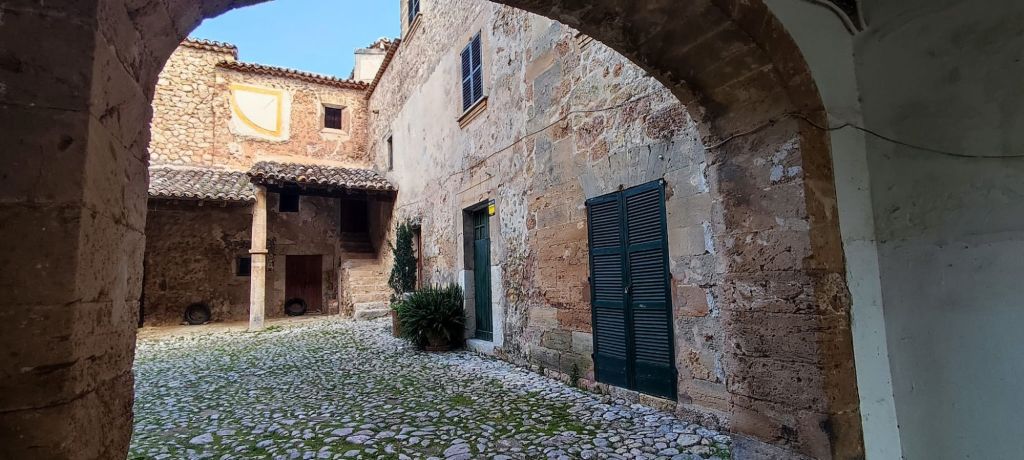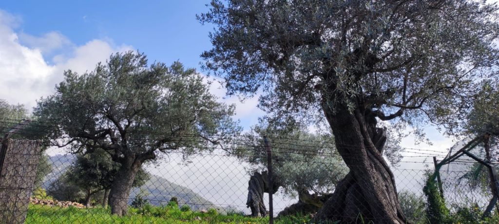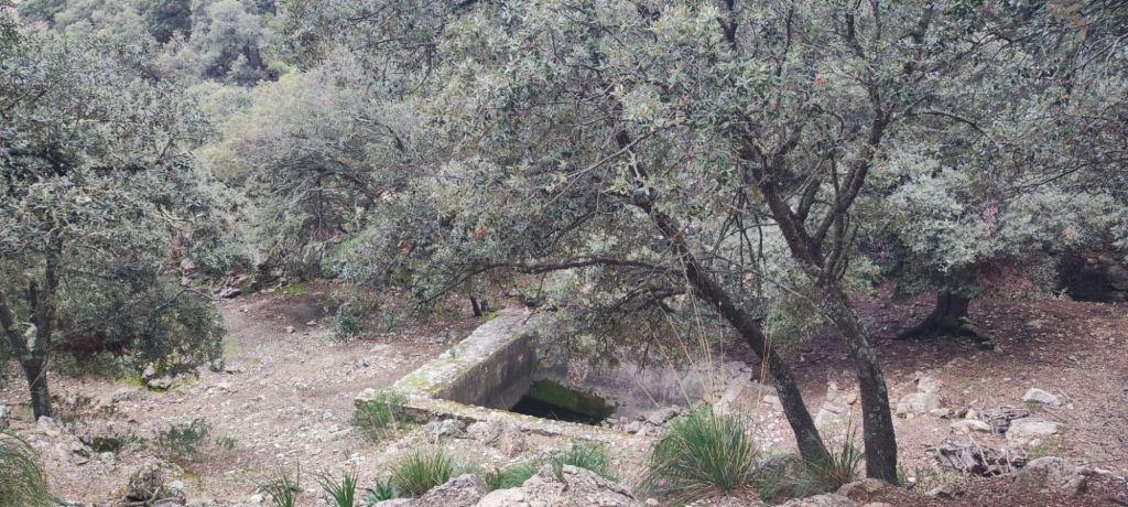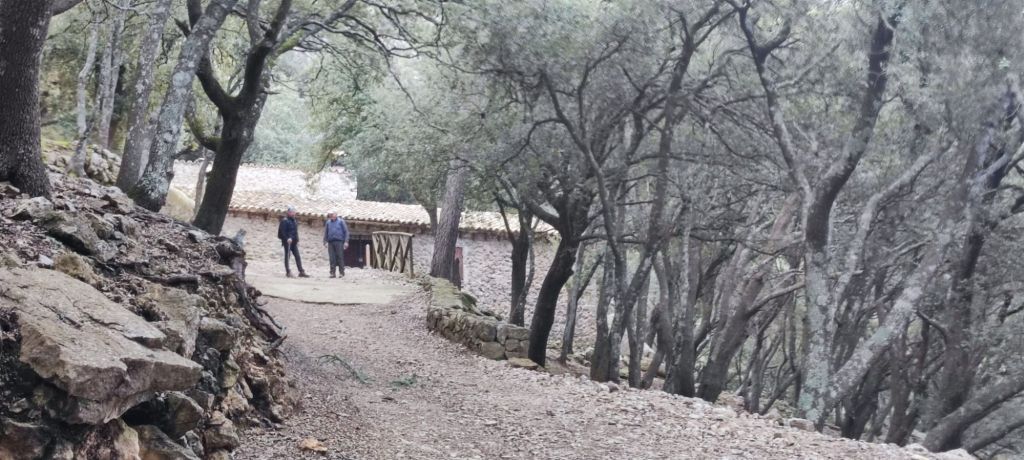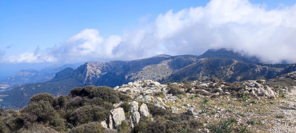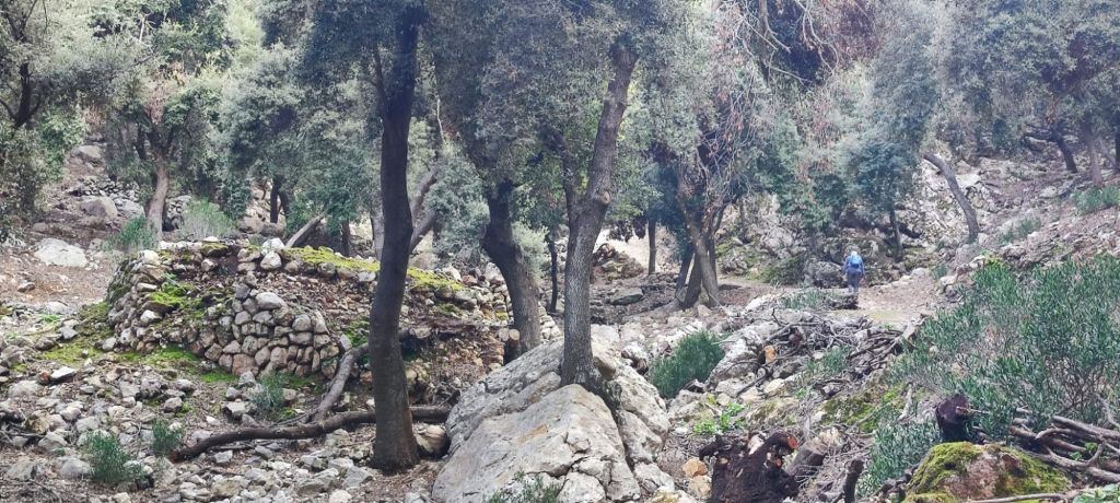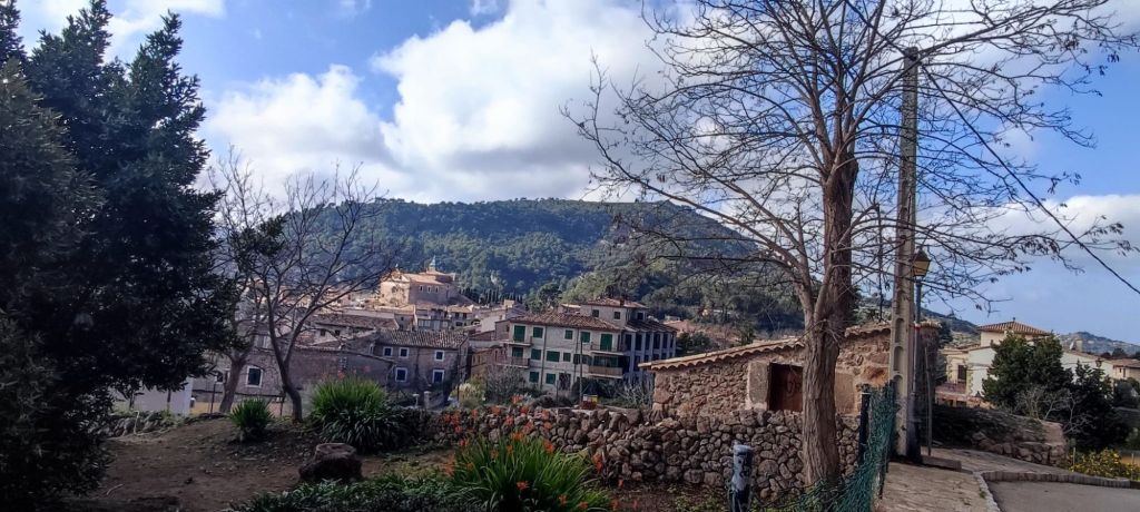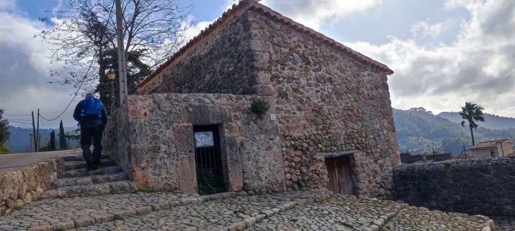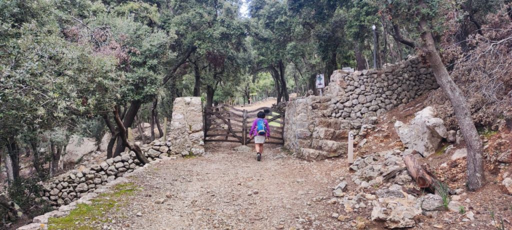 Desde el Puig Caragolí comenzamos un suave descenso que nos lleva al borde del acantilado con preciosas vistas al puerto de Sóller, a Sa Foradada y la propia casa del Archiduque. Continuamos por el Pas de ses Tres Pedretes (aún a 925 m) y continuamos el descenso hasta el Coll de Son Gallard. Bajamos de los 800 m y entramos de nuevo en un encinar denominado en el mapa de IGN Corral des Bous. Pasamos por una corraleta con una cueva en su interior , poco después por una zona de recientes desprendimientos para llegar finalmente al Mirador de Sa regata de les Once donde podemos ver allá abajo la localidad de Valldemossa. Continuamos por el camino, rodeados de nuevo por elementos etnológicos construidos para almacenar agua, entre ellos un aljibe con su correspondiente fuente. El camino lleva a una puerta menorquina que nos avisa que estamos en una finca privada. Este camino pasa junto a la Caseta de entrada a la Muntaya des Voltor. Este camino baja en marcados zigzags hacia Valldemosa a la Calle Oliveras. Por esta calle llegamos a las inmediaciones de la Cartuja, lugar en el que detenemos la ruta y buscamos un lugar para comer algo.