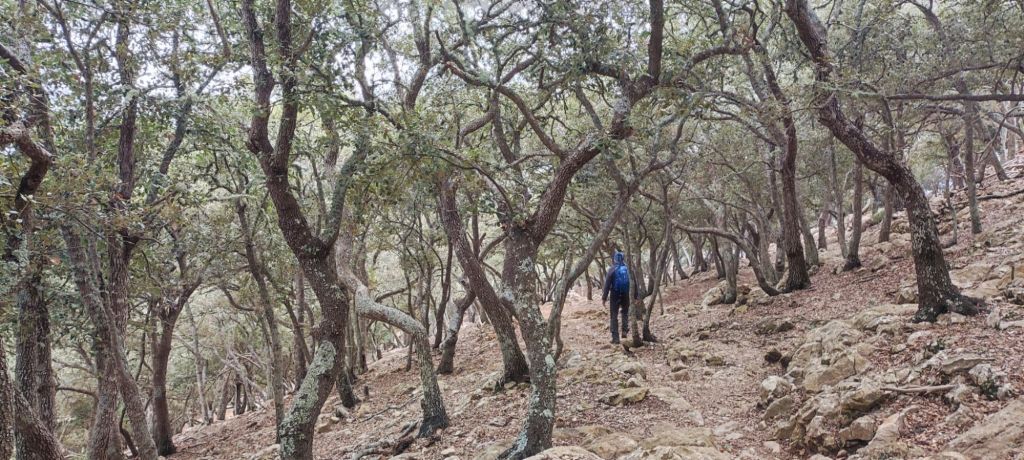 Comenzamos a caminar desde el aparcamiento público de Valldemossa para dirigirnos hacia la Calle Lluis Vives y después la de Toscana par salir de la población siguiendo el torrente d’Avall por un camino entre fincas privadas con olivares a ambos lados del camino. Es un camino amplio en suave subida hasta llegar a la entrada de la finca pública de son Moragues donde podemos ver varios paneles informativos con las rutas que se pueden realizar en la zona. Escogemos el itinerario 1 (Ruta Catalina Homar) y, en este punto nos encontramos con varios hornos de cal, eras de carboneo, casetas de carboneros y los tradicionales rangos de carboner que eran terrenos de varias cuarteladas de superficie arrendados al propietario y en los que los carboneros obtenían la leña. Actualmente es un denso bosque de encinas por los que es todo un lujo caminar. Siguiendo el camino, que se va empinando progresivamente, llegamos a la Font des Polls un área recreativa con fuente mesas y bancos. Un poco más arriba, con el camino en dura subida llegamos al refugio de Son Moragues, donde se encuentra el antiguo pozo o casa de nieve situada a unos 800 metros de altura. A partir de este punto, la ruta se convierte en camino de montaña y se eleva para dar la vuelta por el camí de s’Arxiduc, donde el encinar deja paso a la garriga de montaña. A partir de este punto, la pista se va estrechando para convertirse en camino, que asciende serpenteando para salir de la Coma des Cairats y llegar a un gran hito de piedras que marca el desvío a la derecha hacia el Pla de Mala Garba y el Racó Perdut. El camino sigue siendo muy evidente y no tardamos en llegar a un mirador previo al Puig Gros (916 m) Entramos en una vaguada llamada Pla des Aritges previa a llegar al techo de la jornada el Puig Caragolí con 936 m. En la cima una placa recuerda al Archiduque Luis Salvador.