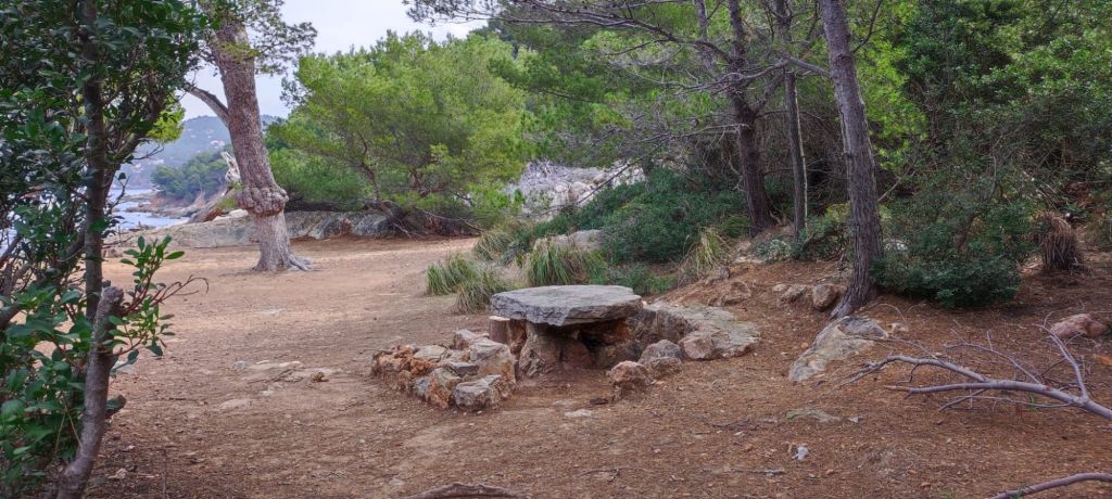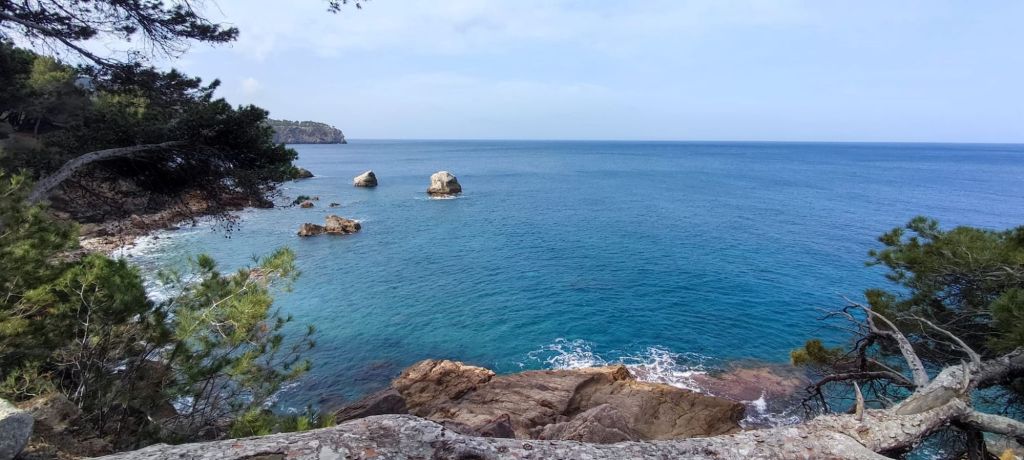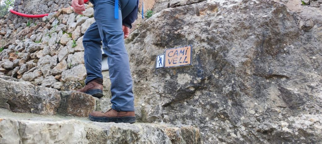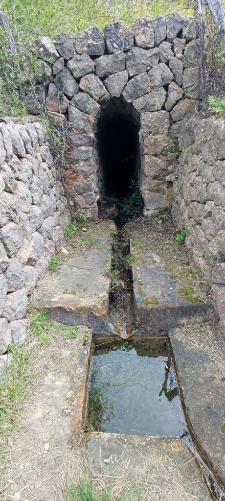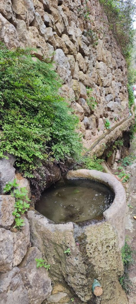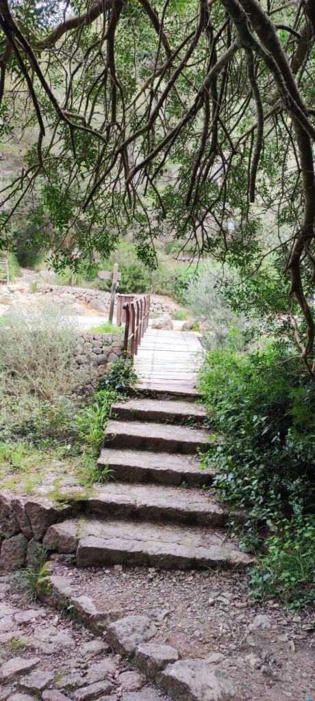 El camino asciende bajo una pinar de repoblación hasta llegar a un camino de tierra que enlaza con el Camí de Castelló (GR 221). Al comienzo del camino pasamos por la Font de ses Mentides, una mina de agua muy bien conservada. Tras dos kilómetros de revueltas alcanzamos el punto más alto de la ruta y la bifurcación con el Camí de Castelló donde nos encontramos con una familia de ovejas en medio del camino. Tomamos la bifurcación a la derecha y las ovejas nos siguen hasta el Camí de Castelló. Éste comienza con una cuesta empedrada, desciende a media ladera de la montaña y, en lontananza podemos ir viendo el mar y los acantilados. Pasamos por lugares realmente bonitos antes de llegar a la urbanización de Ses Coves antes de desembocar en la Ma-10 que recorreremos durante un kilómetro hasta llegar a una bifurcación que da comienzo al Camí de Sa Pesta. En este camino pasamos por varias fincas de olivar y, finalmente, llegamos a un saltador justo enfrente del Pont des Torrent por el que pasamos esta mañana. Ya sólo nos queda recorrer el Camí des Ribassos en dirección a Deiá para llegar al punto de partida en el que tenemos aparcado el coche dando por finalizada esta bonita excursión.