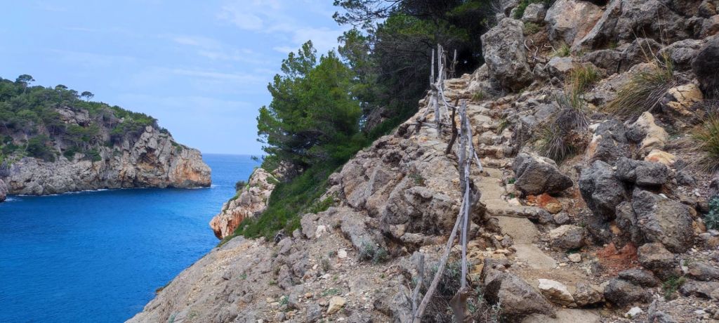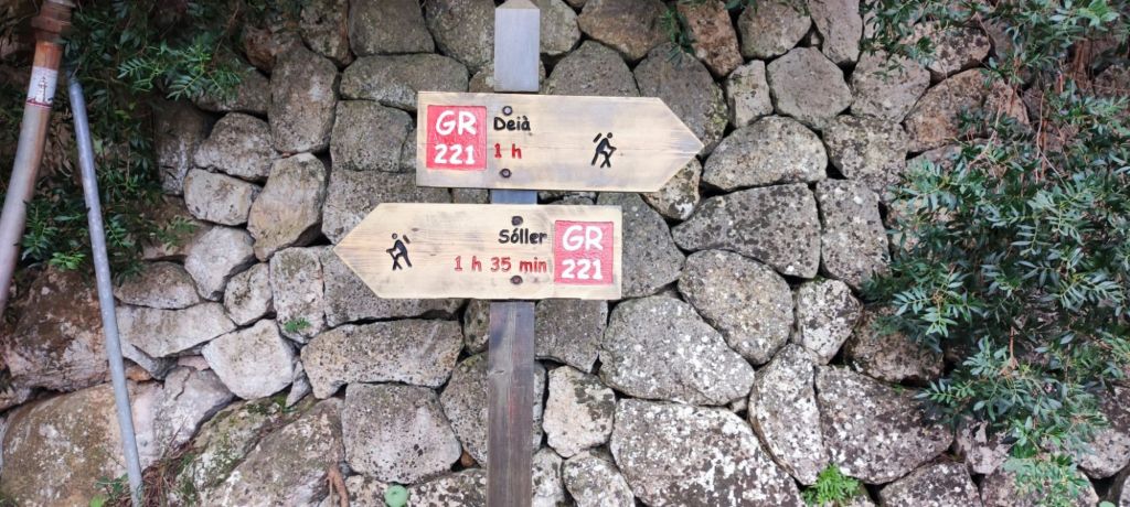 Comenzamos la caminata en el aparcamiento público junto a la carretera Ma-10 que une Valldemossa con Deiá a la entrada de esta localidad. Caminamos dirección Deiá por una pasarela de madera paralela a la carretera hasta llegar a la calle del Teix que desciende paralela al Torrent Major que baja con un buen caudal de agua. Un poco más abajo nos encontramos con los Rentadors des Siquio (lavaderos) y un pequeño puente sobre el torrente. Más adelante, pasamos ante el Refugi de Can Boi instalado en una gran casa recientemente restaurada. Llegamos a una bifurcación y tomamos el Carrer d’es Clot en el que vemos una curiosa fuente a nuestra izquierda con un canalizo que dirige el agua sobrante a un acequia de riego. Terminamos el asfalto y entramos en el Camí des Ribassos. Es un camino de tierra entre huertos y bancales de olivos, almendros y otros árboles frutales. Un poco más abajo llegamos al Pont des Torrent, un puente de madera que cruza sobre el Torrent Major. Tomamos la carretera asfaltada que conduce hasta la bonita Cala de Deiá en la que también desemboca el Torrent. Vemos varadas las pequeñas embarcaciones que usan los pescadores y la playa (sin arena, de piedras) Poco antes de llegar a la Cala vemos el arranque del Camí dels Pintors, que comienza subiendo por unas escaleras empedradas y luego va bordeando la cala ofreciendo muy buenas vistas. En este punto un cartel indicando la posible peligrosidad del tramo que comenzamos. Hay unos indicadores en madera que señalan Bens de Avall-Soller que es la dirección que debemos de seguir. Vamos recorriendo