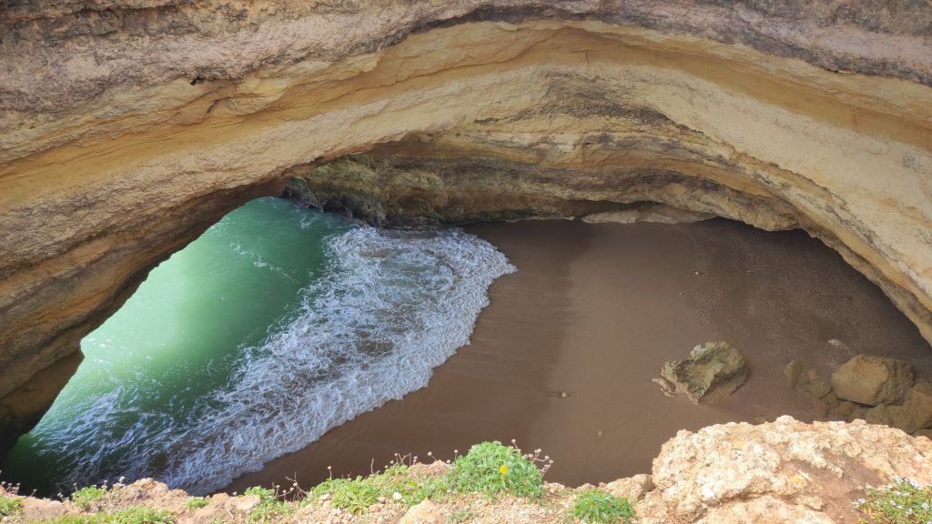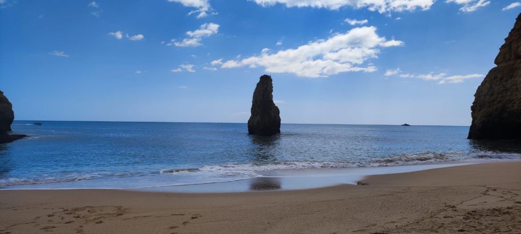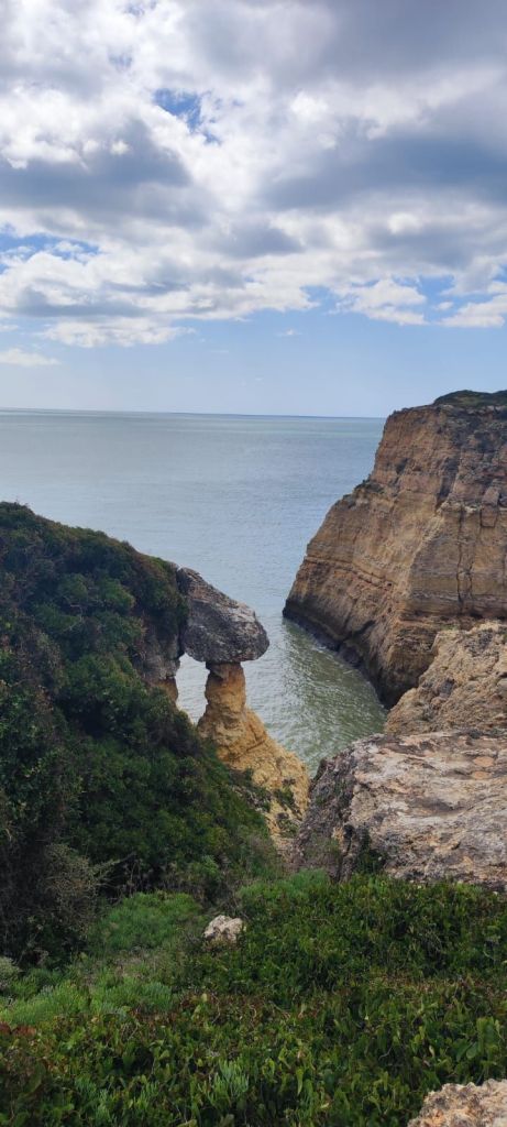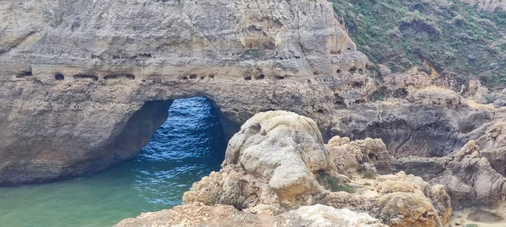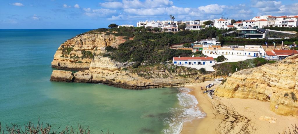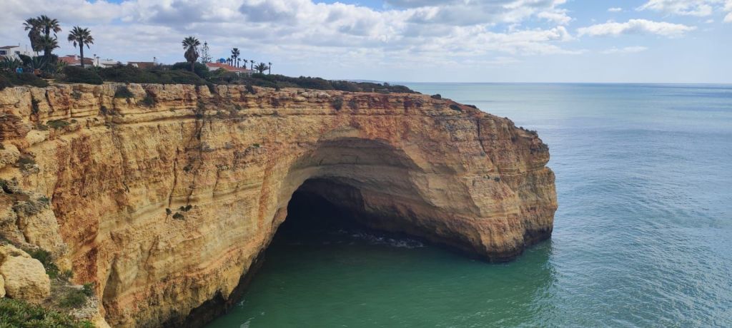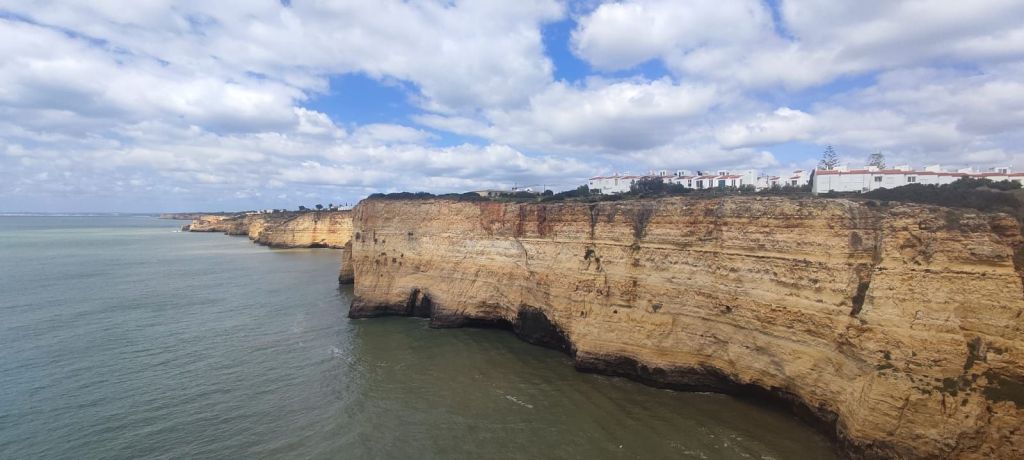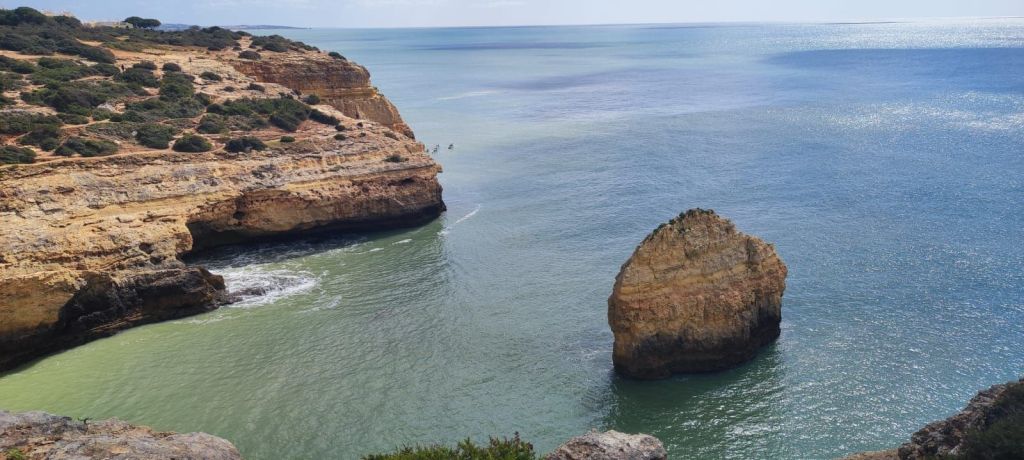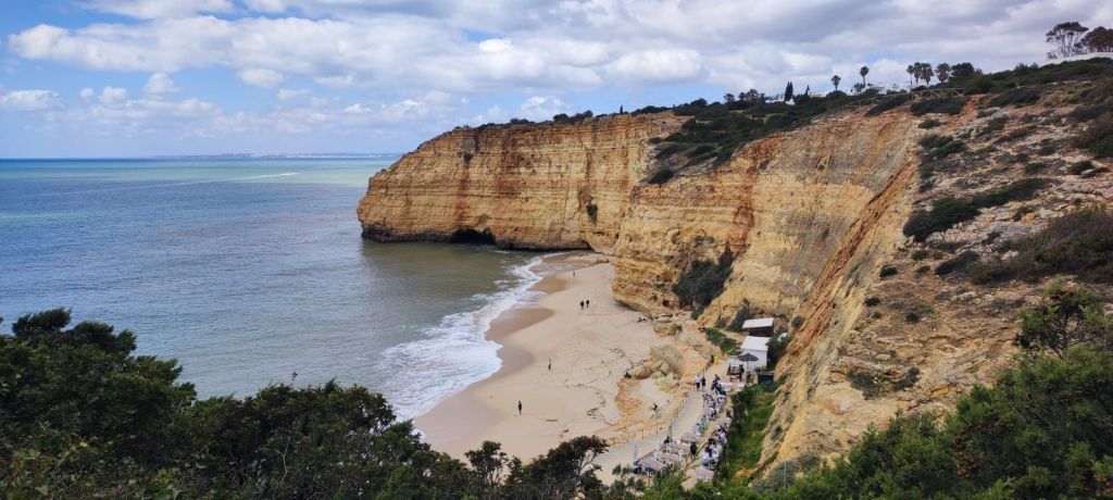 Comenzamos la caminata en la Praia da Marinha con sus acantilados rojizos de piedra caliza, con bellos arcos de piedra fruto de la erosión en medio de unas tranquilas aguas turquesa. Muy cerca, encontramos la Praia da Mesquida, una playa muy pequeña que, en verano, suele estar saturada. Siguiendo las pasarelas de madera llegamos al primer Vale Suspendido que cuenta con su panel informativo. Termina en la Praia Cao Ravioso, una pequeña playa a la que únicamente se accede por mar. El nombre de Valles suspendidos o colgantes hace referencia a los arroyos o torrentes de agua que han modelado estos acantilados mediante la erosión en sus diversas formas. Actualmente, apenas se observan estos cursos de agua (leves marcas de escorrentía) pero si que podemos apreciar sus efectos sobre el paisaje. La siguiente playa es la espectacular Playa da Corredoura, una de las más largas, encuadrada por un gigantesco acantilado de piedra con una cueva en cada extremo. Una decena de metros más adelante encontraremos la Gruta de Benagil, un gigantesco Algar (zona de erosión vertical como un pozo o una chimenea que comunica con el mar) que es conocida como la “Catedral del Algarve) En su interior se encuentra la Praia do Algar do José Rodeira sólo accesible desde el mar. La siguiente playa es la de Benagil, en la que hay bastantes servicios de restauración y en la que se pueden alquilar los kayaks y las barcas para acceder al Algar de Benagil.
