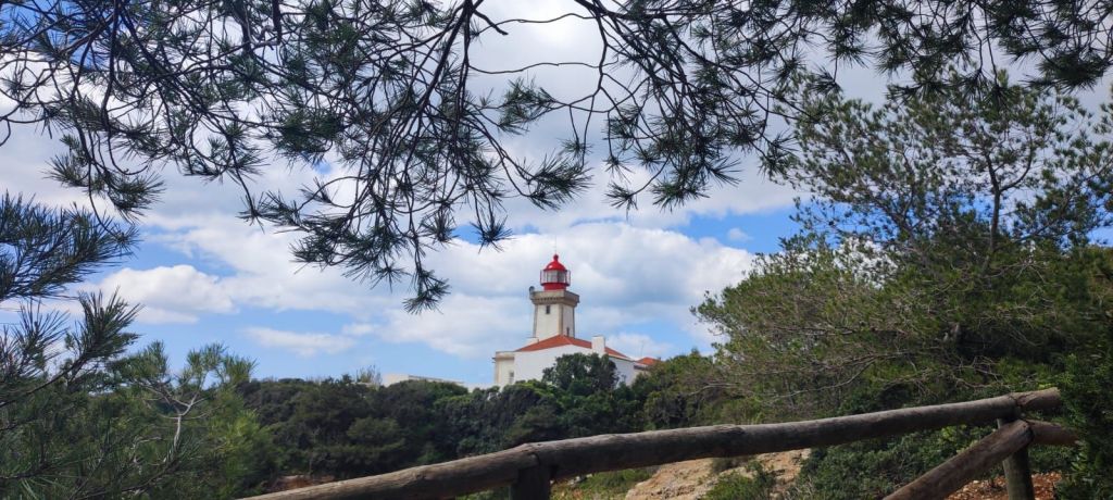 Continuando la caminata subimos por unas escaleras de piedra para llegar a la siguiente playa, la Praia do Carvalho, una de las más fotografiadas. Se accede por una túnel tallado en piedra cuyos escalones te transportan a otra dimensión. Continuamos la marcha subiendo por unas largas escaleras y pasando por diversos algares hasta llegar a la Grtoa do Coraçao que veremos desde las alturas y el Mirador Leixao do Larao, con un área de descanso con bancos y mesas. Continuamos hasta Cabo Carvoeiro en el que la línea de acantilados se ve interrumpida por otro Valle que, en su día, fue desembocadura de un río. Junto a éste encontramos la Praia do Vale Esninhaço. Continuamos la ruta con el Faro de Alfazina en el horizonte. Construido a finales del siglo XIX fue electrificado en 1950 y automatizado en 1981. Tras una fuerte subida llegamos a la explanada del faro y podemos admirarlo desde cerca. Continuamos por el acantilado, en una zona ya más urbanizada para llegar a la Praia do Vale Centianes, final oficial de nuestra ruta. En esta playa hay un moderno restaurante con inmejorables vistas sobre el Atlantico. Siguiendo la línea de la costa podemos ver el skyline de Lagos, Portimao, Carvoeiro, las grandes urbes del Algarve. En este punto iniciamos el regreso hasta la Praia da Marinha, donde hemos dejado el coche.