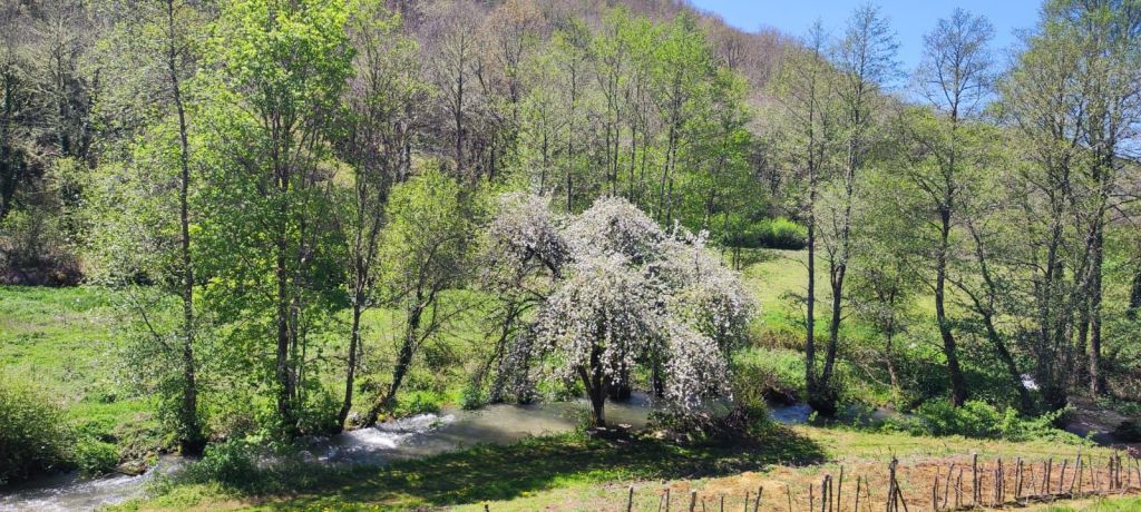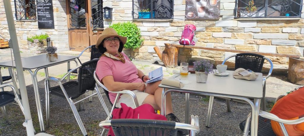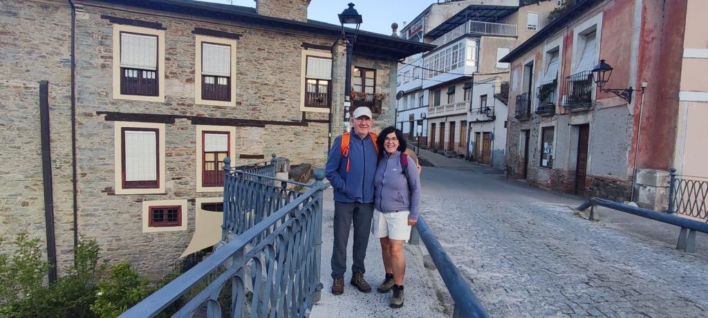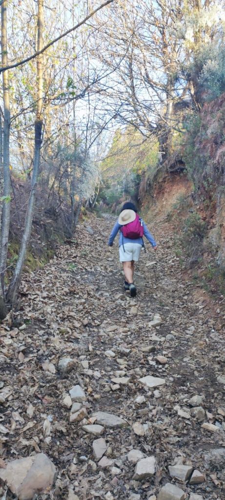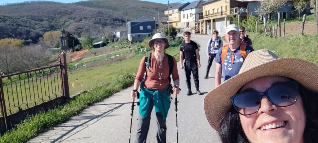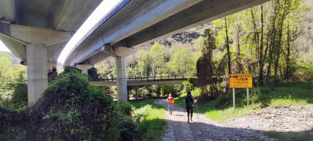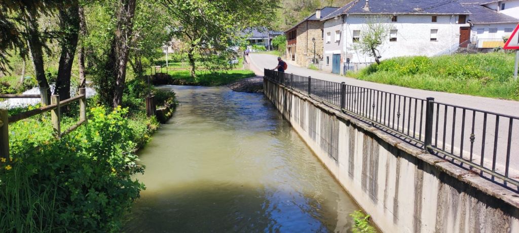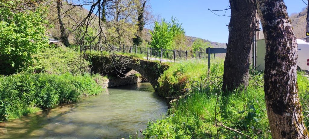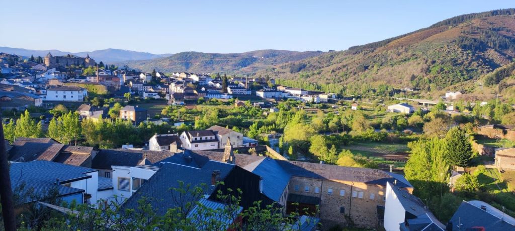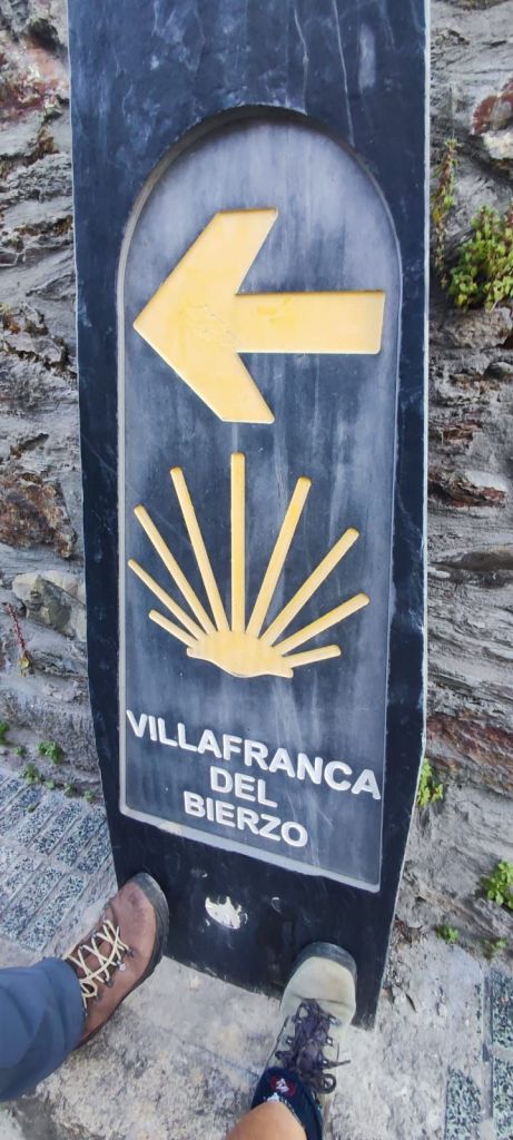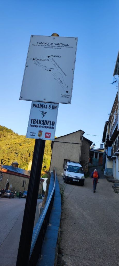 Comenzamos la caminata junto al Castillo Palacio de los Marqueses de Villafranca y nos dirigimos hacia la Calle del Agua hasta doblar por un callejón a la izquierda para cruzar un puente sobre el Río Burbia. Nada más cruzar el puente y la escultura homenaje al peregrino hay que tomar a la derecha por la calle Pradela por unas rampas de cierta dureza (nosotros nos despistamos unos metros y tuvimos que volver sobre nuestros pasos) El primer km la subida es bastante fuerte pero luego se va suavizando y se va por una ladera con unas vistas impresionantes del Bierzo. Atravesando castañares centenarios y pinares salpicados de robles se puede llegar al pueblo de Pradela que está a la derecha del camino (No es necesario entrar si no se va a hacer uso de algunos de sus servicios (Hay albergue) Tres kilómetros más adelante salimos a una carretera local que nos puede llevar al pueblo de Trabadelo. Si no se quiere entrar en Trabadelo se puede seguir, como hicimos nosotros, hasta recuperar el camino oficial pasado Trabadelo. A partir de aquí caminamos unos cuantos km por pista asfaltada y un carril peatonal al borde de la N-VI. Pasamos por las localidades de Portela de Valcarce, Ambasmestas y Vega de Valcarce por el valle del caudaloso río Valcarce. Desde Vega de Valcarce la carretera se va empinando suavemente para llegar a Ruitelan y, un poco más adelante tomamos a la izquierda la carretera que va a Las Herrerías. Entramos a esta aldea tras cruzar un puente romano sobre el Río Valcarce. Nos detenemos en Las Herrerías para tomar un bocado y afrontar la última subida del día.