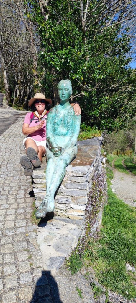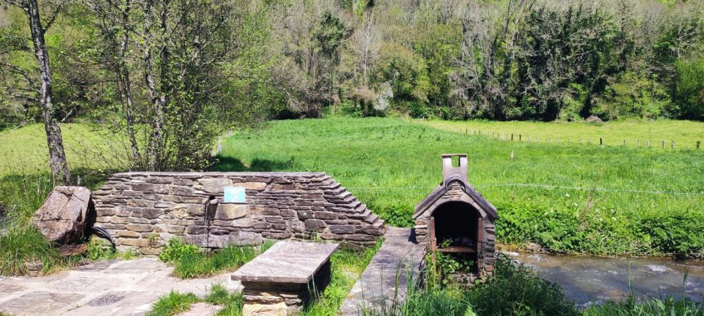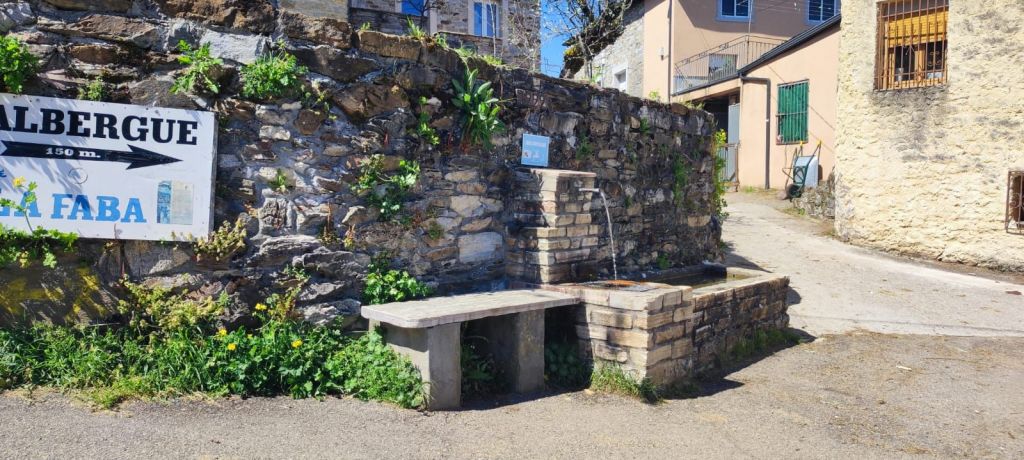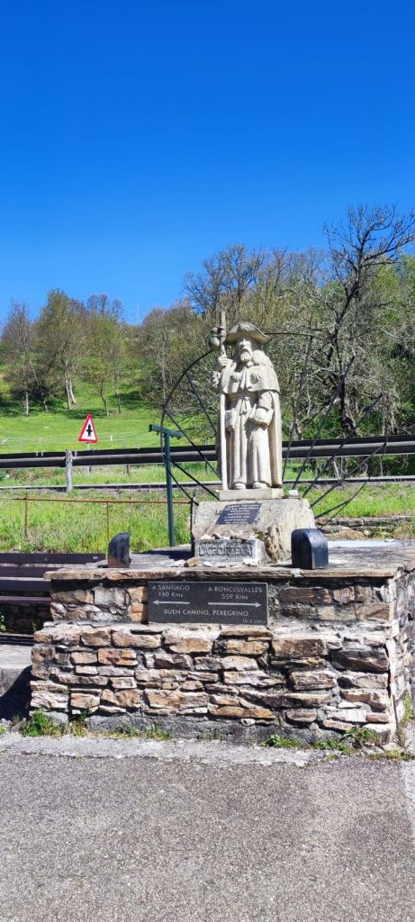 Seguimos la misma carretera hasta el barrio de Hospital en referencia a un antiguo hospital para peregrinos ingleses. Al finalizar este núcleo de casas comienza la auténtica subida a O Cebreiro. Por la misma carretera, con una subida más pronunciada hasta llegar a la flecha que nos indica que debemos cambiar la carretera para tomar una pista de tierra con algo menos de pendiente. Cruzamos el arroyo Refoxo y tomamos un carril algo sombrío que asciende sin descansos hasta llegar a las inmediaciones de La Faba, con albergue y fuentes. A partir de este punto abandonamos la sombra y vamos avanzando por bonitos caminos con vistas más despejadas en las que vamos teniendo excelentes panorámicas hasta alcanzar el último pueblo de León en este camino: Laguna de Castilla, al que llegamos por unas corredoras a cuyos lados pastan algunos grupos de vacas. Seguimos avanzando a media ladera de la sierra y ganando suavemente altitud hasta que un km más arriba aparece un enorme mojón que nos indica que entramos en Galicia. El último km hasta la Iglesia prerrománica de Santa María la Real se hace volando. Una peregrina de bronce sentada a un lado del camino nos da la bienvenida a la aldea de O Cebreiro poniendo fin a esta “etapa reina”