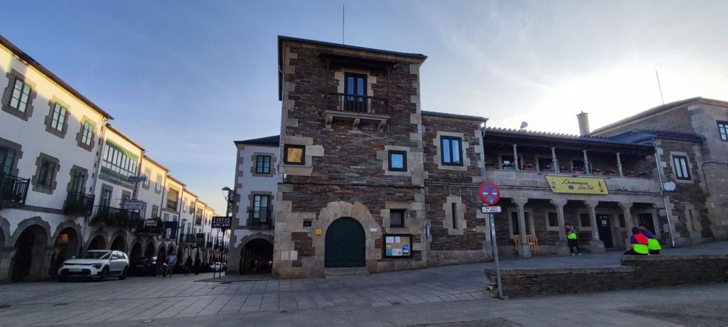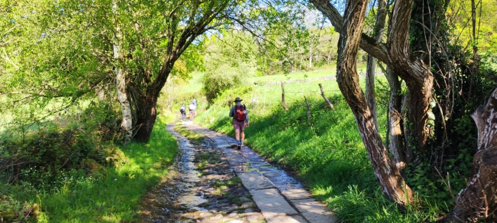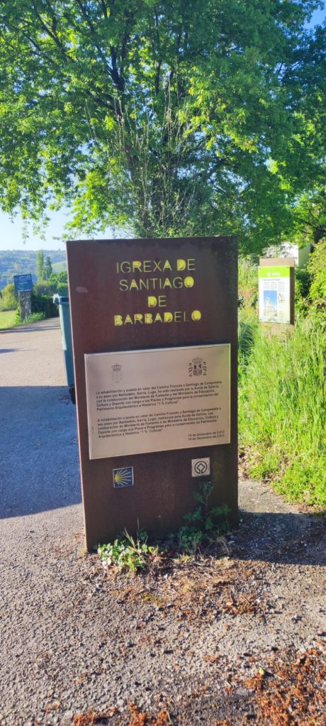 Comenzamos a caminar en la Avenida Benigno Quiroga al pie de la escalinata da Fonte repleta de personas que comienzan su caminata en este sitio y la quieren inmortalizar con una foto de grupo. Subimos la escalinata y continuamos por la calle Mayor, pasamos junto a la iglesia del Salvador y doblamos a la derecha para rodear el recinto del castillo Condal. Junto al antiguo edificio de la prisión preventiva hay un mirador junto a un crucero que nos permite un último vistazo al skyline de Sarria envuelto en una suave niebla mañanera. Continuamos junto al Convento de la Magdalena para cruzar el Río Pequeño por el medieval Ponte Áspera. A estas alturas los grupos de caminantes llenan completamente la pista de asfaltada por la que caminamos. Pasamos bajo un viaducto de la autovía, cruzamos un paso a nivel del ferrocarril e iniciamos una suave subida entre un bosque de castaños y robles. Atravesamos la aldea de Paredes, junto al castro del mismo nombre del que se conservan algunas estructuras. Enseguida entramos en el Concello de Barbadelo cruzando la aldea de Viley, a cuya salida se encuentra la iglesia románica de Santiago de Barbadelo. Retornamos al camino principal por una pista asfaltada para entrar a Rente junto a un grupo de grandes castaños. Seguimos por ese camino hasta A Serra, continuamos y hacia el km 7 de nuestro recorrido pasamos junto al Molino de Marzán, un complejo hotelero con albergue privado, tienda y cafeteria. Un poco más adelante encontramos un fotografiado Pascal (recorrido con grandes losas de piedra que facilita el paso por terrenos enlodados) Seguidamente pasamos las aldeas de A Pena, Peruscacallo, Cortiñas, A Brea y Morgana todas ellas con servicios más o menos concurridos. Por este camino también hemos encontrado “espontáneos” que ofrece fruta y sello para las credenciales desde mesas improvisadas. Continuamos camino en la compañía de Rafael y sus dos hijos, Paco y Dante, a los que hemos encontrado en etapas anteriores y nos comentan lo poblado que está hoy el camino. Continuamos pasando aldeas como Ferreiros, Mirallos, A Pena (donde se encuentra el mojón de 100 km justos a Santiago, junto al bonito albergue Do Rego) y hacia el km 14 entramos en As Rozas y aprovechamos un café poco concurrido para hacer una parada técnica y tomar un café y tortilla.