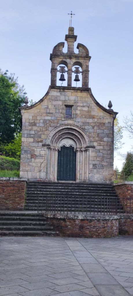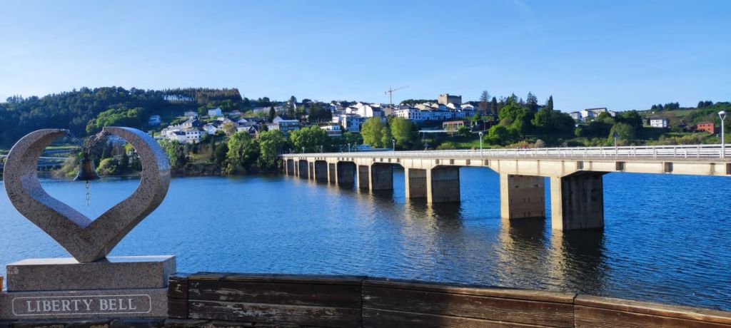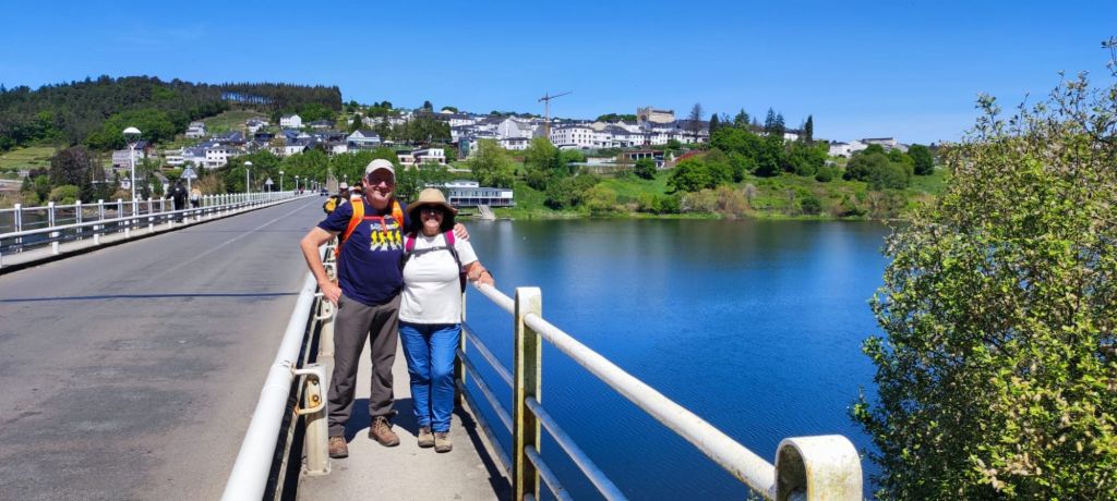 Dejamos a Rafael y sus hijos terminando su comida y continuamos por Moimentos a cuya salida ya se intuye el río Miño, seguimos hacia Mercadoiro, pasamos por A Parrocha, superamos unos modestos altos hasta llegar a Vilachá desde donde ya tenemos a la vista el Río Miño y la Villa de Portomarin. A la salida bajamos por una fuerte rampa asfaltada hasta la carretera LU-633 y por ella llegamos a la entrada del puente sobre el embalse. Cruzamos el puente, con todos los grupitos inmortalizando el momento (como nosotros mismos) para situarnos ante las escaleras para subir a un arco medieval trasladado del antiguo Portomarin, pasamos por la Capilla de las Nieves y en la Rúa do Peregrino detenemos la etapa para dirigirnos a nuestro alojamiento.