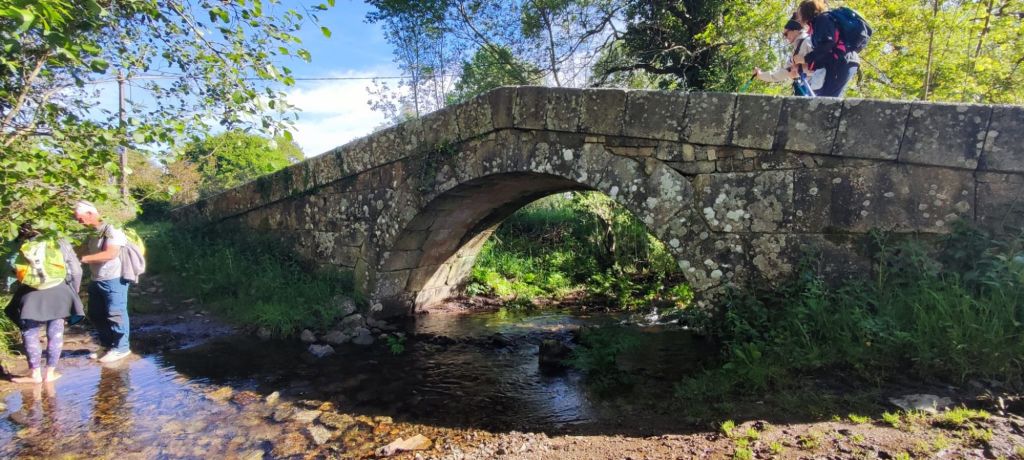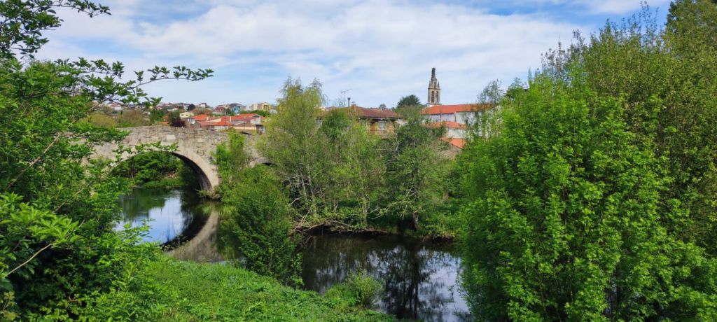 Con media jornada en nuestras piernas nos ponemos de nuevo en marcha en dirección Arzúa. Tomamos la estrecha Rúa de San Pedro, avanzamos por un denso bosque de robles, pasamos junto a la Iglesia románica de Santa María de Melide, pasamos el arroyo Catasol por un bonito paso de grandes piedras y atravesamos los lugares de Raído y Parabispo. Volvemos a bajar hasta el regato Valverde, nueva subida hasta A Peroxa y nuevo descenso hasta Boente. Continuamos por la carretera para llegar a Fraga Alta, donde hay algunos bares con la idea de comer algo antes de llegar a Arzúa pero no nos convencen ninguno. Así que giramos a la izquierda en dirección a O Río. En esta aldea hay un área de descanso bastante concurrida y continuamos por otro tobogán hasta la entrada de Ribadiso de Baixo. A la entrada hay un bar especializado en empanadas y decidimos hacer un alto para degustar el producto y tomar un descanso. Muy buena, por cierto, la empanada recién hecha que anunciaban.