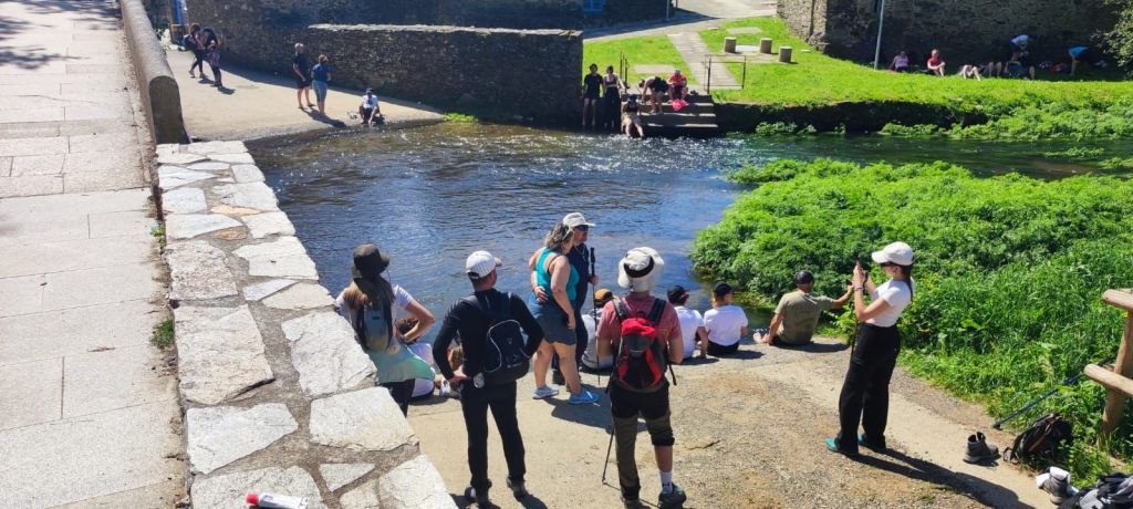 Salimos de Palas de Rey sobre las ocho y media de la mañana por la Travesía del Peregrino y bajamos hacia la carretera N-547 y tomamos un callejón en descenso, pasamos junto a una escultura de dos peregrinos danzantes (¡que humor!) y seguimos por un andadero junto a la carretera y pronto llegamos a Ponterroxán, seguidamente pasamos por Carballal y volvemos momentáneamente al bosque de robles para entrar en San Xulián do Camiño. Por una senda empedrada bajamos hacia el Río Tambre que cruzamos a la entrada de Ponte Campaña. En esta aldea vemos un café que está funcionando con un equipo electrógeno por lo que deducimos que aún no hay suministro eléctrico pero el camino no se para. Un poco más adelante, en un claro del bosque vemos un nutrido grupo pegado a sus teléfonos y comprobamos que ya va habiendo algo de comunicaciones. Continuamos hacia Casanova por un camino boscoso en subida para bajar de nuevo hacia el regato de Porto de Bois que se cruza por un puente elemental. Desde la aldea de Campanilla una pista asfaltada nos lleva a O Coto, donde comienza la provincia de A Coruña. Desde O Coto salimos hacia Leboreiro, cruzamos el río Seco por un alomado puente medieval, pasamos ante un gran polígono industrial y entramos en Furelos por un bonito puente medieval en el que vemos a algunos caminantes remojando sus pies en el río. Desde Furelos una pista asfaltada nos lleva a Melide. Nos cruzamos con una vecina que nos dice que el suministro eléctrico ha vuelto hace una media hora. En la Avda de Lugo, muy cerca de la confluencia del Camino Primitivo que viene desde Oviedo, encontramos un banco sacamos algo de efectivo y al pasar ante una populosa pulpería en pleno trabajo paramos a tomar un refrigerio. En el refrigerio compartimos mesa con Eva y Montse, dos mujeres catalanas con las que nos vamos encontrando por el camino.