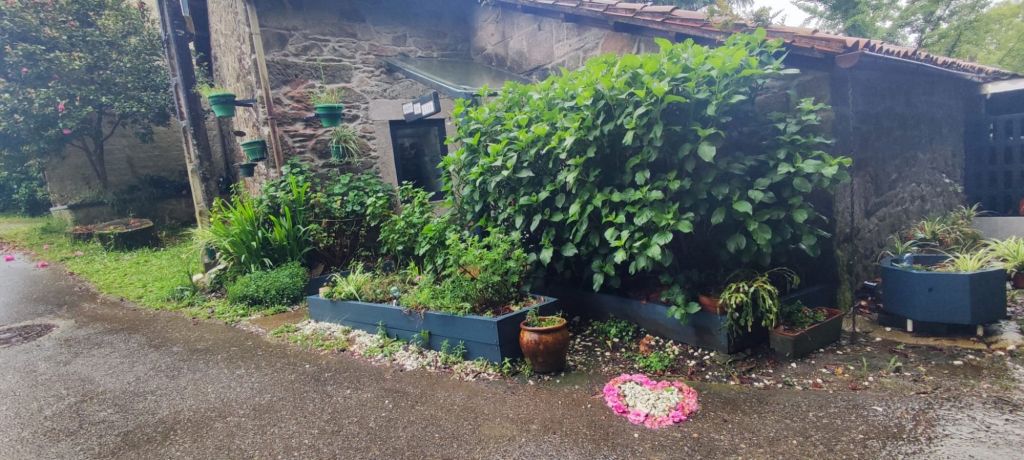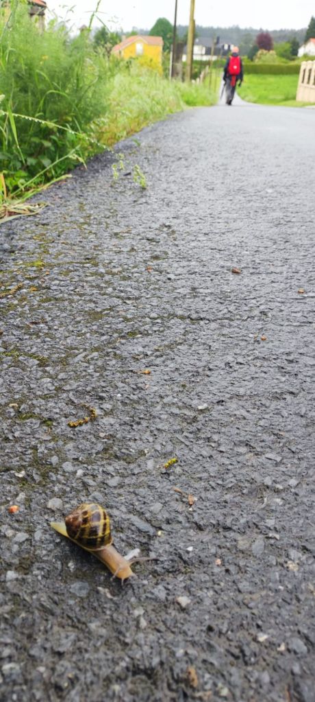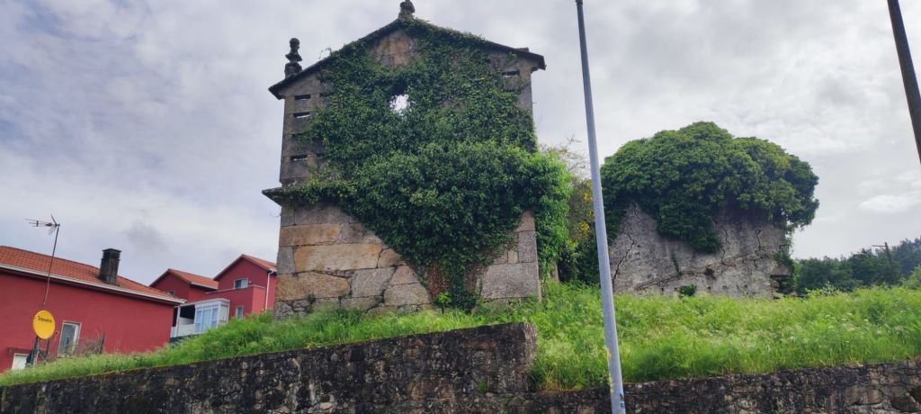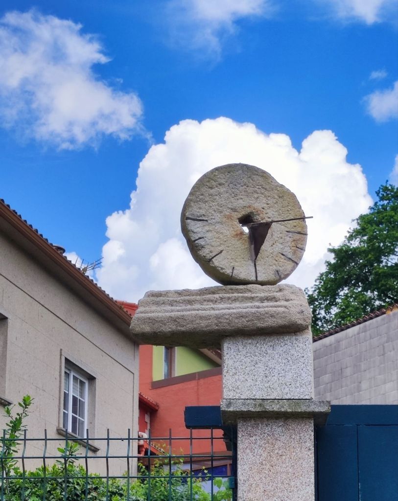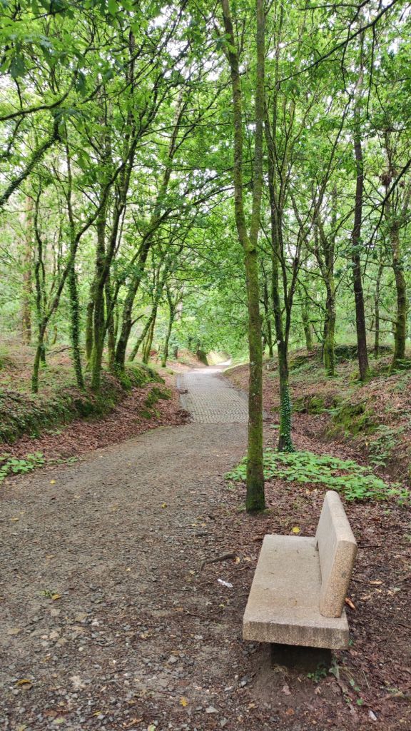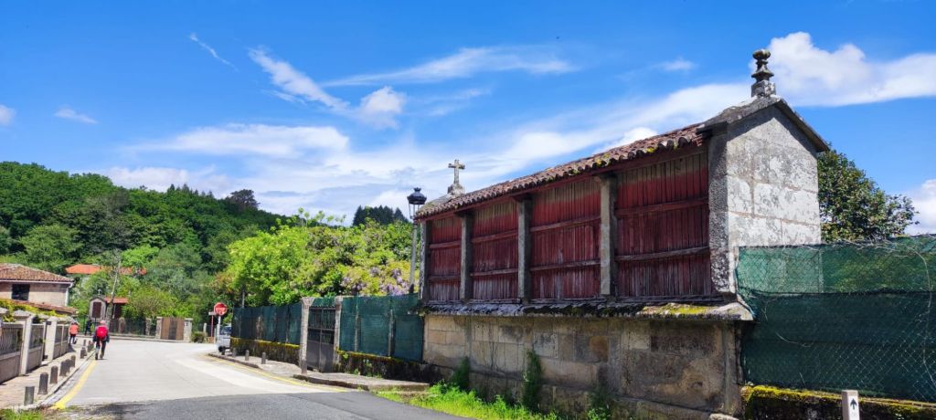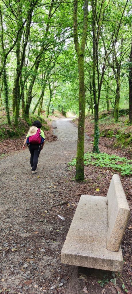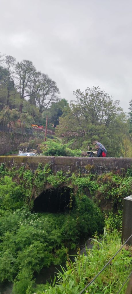 Teniendo todo esto claro, comenzamos nuestra caminata en la Plaza del Obradoiro en el km 0 del Camino de Santiago bajo un denso aguacero que comenzó a descargar sobre Santiago de madrugada y que no tenía visos de terminar muy pronto cuando comenzamos la caminata. Nos dirigimos hacia la fachada del edificio del Parador de los Reyes Católicos y giramos a la izquierda, bajando junto a la Iglesia de San Fructuoso por la Rúa das Hortas. Al principio hay poca señalización, pero continuamos hacia abajo y van apareciendo algunas flechas amarillas. Por fín, junto al robledal de San Lourenzo, encontramos el primer monolito de granito junto a un precioso bosque de robles centenarios. A partir de ahí, la señalización es siempre muy clara. Tras un fuerte descenso llegamos hasta el puente sobre río Sarela, un afluente del Sar, apenas visible por la espesa vegetación. En sus márgenes aún perviven los restos del viejo esplendor de las fábricas de curtidos pues en Santiago creció hasta fínales del XIX una boyante industria del cuero. Luego, subimos hasta la aldea de Sareila de Abaixo, desde la que tenemos unas magníficas vistas a las torres de Santiago. En este punto, deja de llover y la caminata se hace más amena. Transitamos por espacios bucólicos a los que Rosalía De Castro dedicó algunos versos en su libro Follas Novas. “… aqués vellos carballos/ amostrando as súas raíces/ calva-las redondas copas…” Continuamos por asfalto, atravesando numerosas aldeas: As Moas de Abaixo, Carballal, Pedrido, Quintans, Portela, O Lombao, Augapesada…No están claros los límites entre lo rural y lo urbano, pero el paisaje es agradable y las carreteras, tranquilas.
