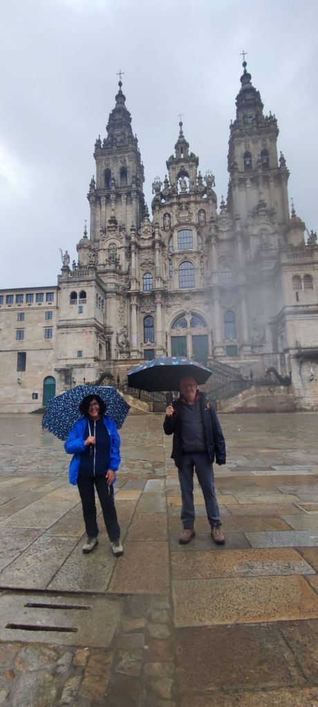 – La salida de la Plaza del Obradoiro bajo el aguacero.