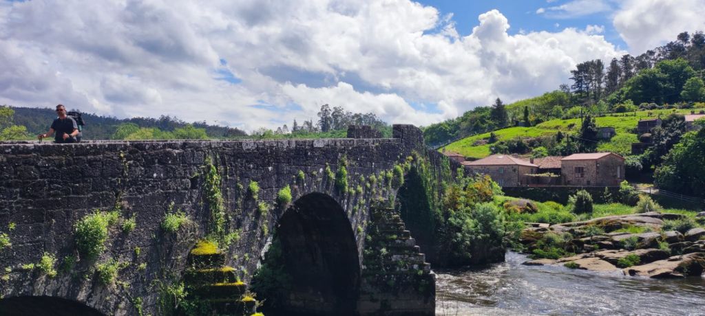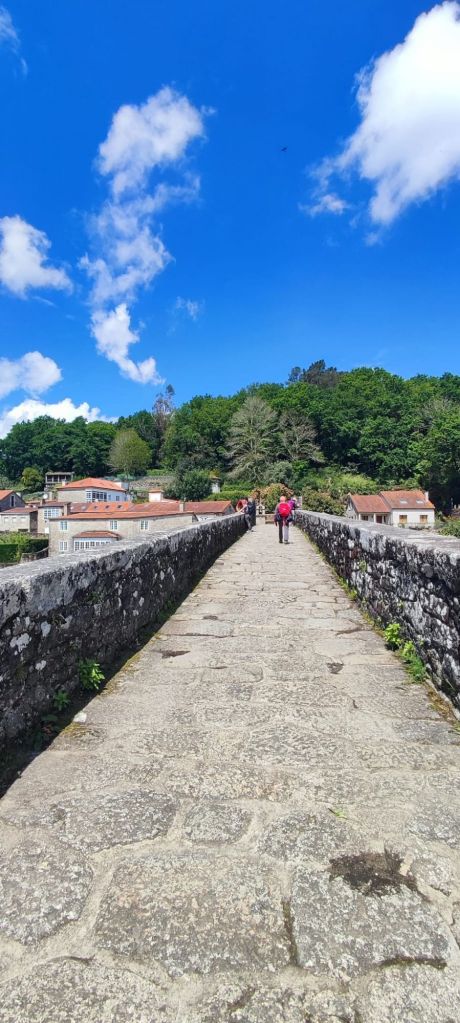 Desde el Puente sobre el Rego dos Pasos en Augapesada tomamos por una pista la subida al Mar de Ovellas, el plato fuerte del día. Son unos 230 m de desnivel en 2,5 km. La subida no es difícil, simplemente hay que tomársela con paciencia y buscando un ritmo cómodo y haciendo los descansos oportunos. Además hay bancos en distintos puntos de la subida, a la sombra de robles, y una fuente en la parte alta. Desde el alto del Mar de Ovellas y Carballo, descendemos hasta Ponte Maceira, donde el río Tambre, un viejo molino, el gran puente con tres grandes arcos y dos pequeños y la vegetación nos regalan un espectáculo para los sentidos. Al otro lado del puente encontramos la Capela de San Brais y, a la derecha el Pazo de Baladrón construido entre 1945 y 1955. Continuamos por terreno llano, en ocasiones junto a una carretera, hasta el pequeño repecho de Chancela. Al llegar al alto de Chancela pasamos junto a la entrada monumental del Pazo de Chancela. El camino sigue en suave bajada hasta Negreira, donde finalizamos esta primera etapa de nuestro Epílogo.