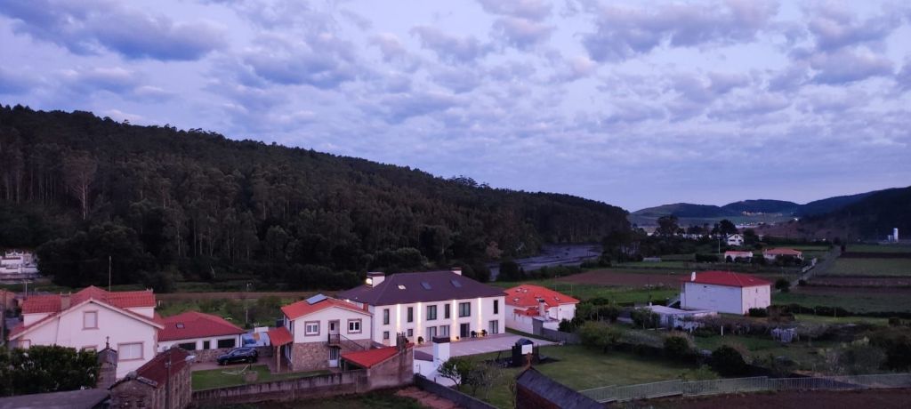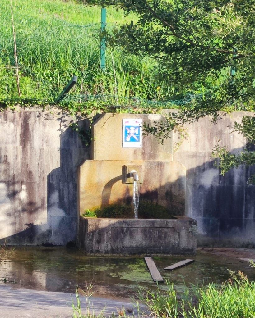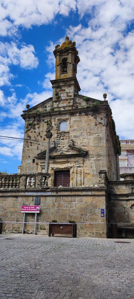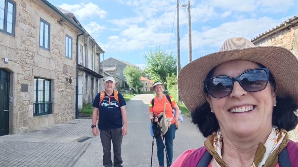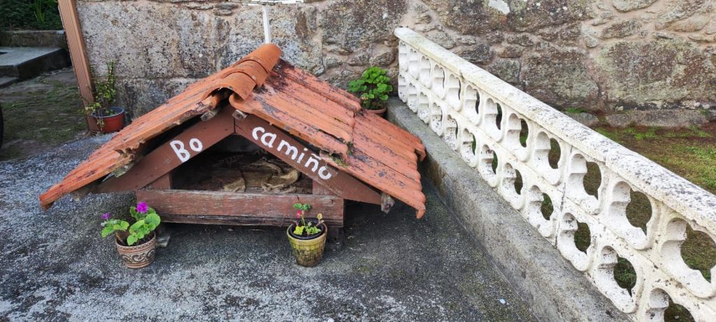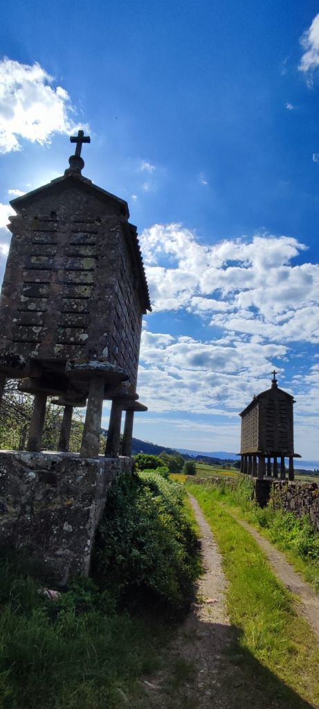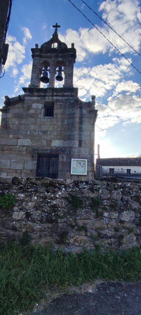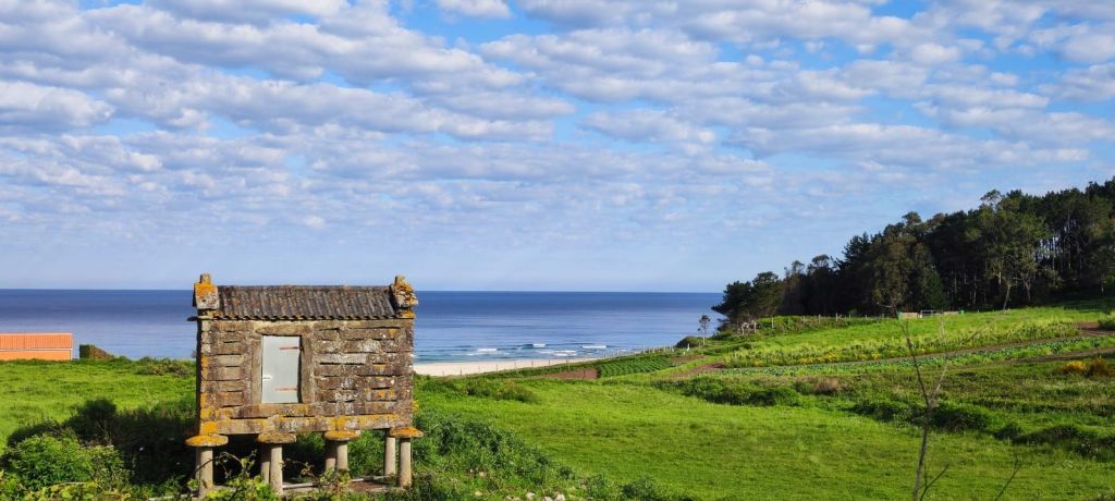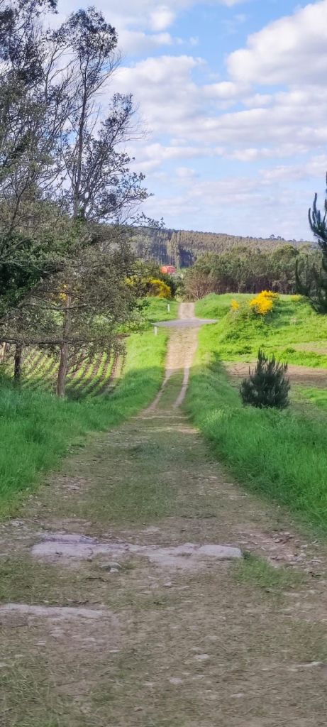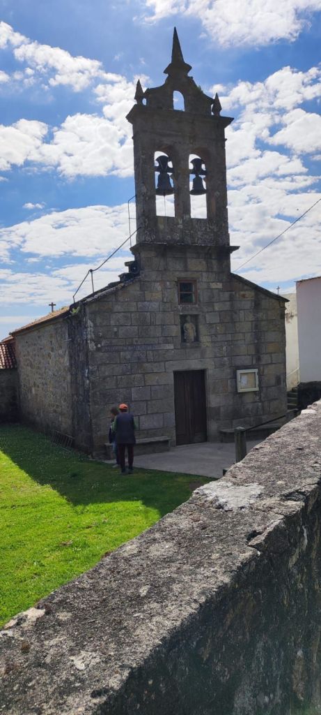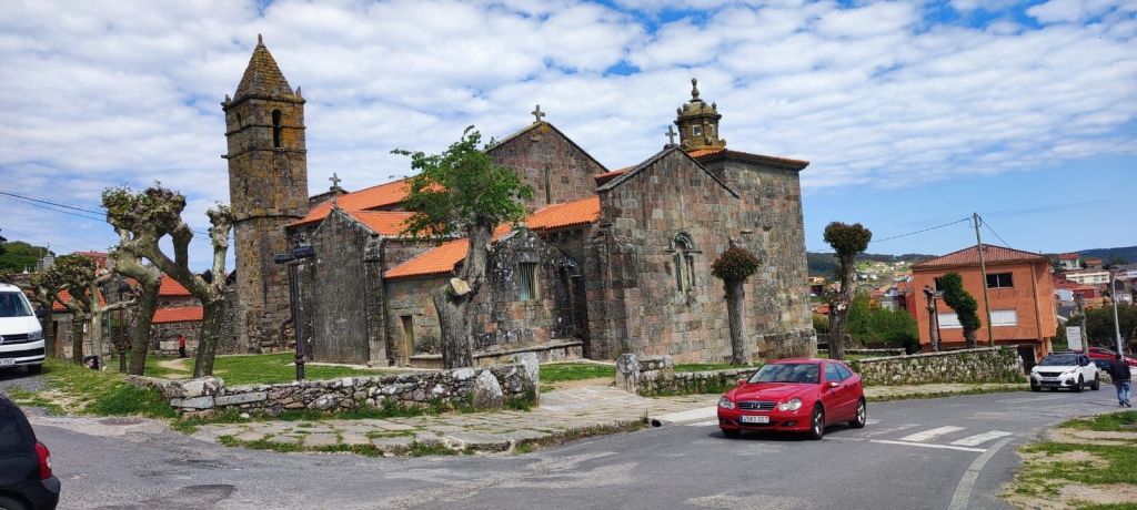 Salimos de Lires en dirección a la Iglesia de Santo Estevo y tomamos un camino a la izquierda con cultivos de huerta y prados. Enseguida comenzamos una subida hasta la aldea de A Canosa y a la salida, volvemos a un camino de tierra entre bosques de pinos, eucaliptos y helechos hasta llegar al Alto de Canosa. Descendemos por el Monte do Couto hasta llegar a la entrada de Cadrís desde donde tenemos una bonita vista de la Praia do Rostro. Seguimos llaneando hasta Castrexe donde ya podemos ver, completa, la Praia do Rostro. De nuevo en subida, llegamos Suarriba, poco después a Buxán con un gran aserradero a la entrada, cruzamos la aldea y, a la salida, hay un kiosco bar bastante rudimentario. Aquí encontramos a Carmen que habíamos visto en Muxia, y hacemos un tramo en su compañía. Continuamos camino hasta San Salvador de Duio (bar) y 500 metros más adelante llaneamos hasta Hermedesuxo por una estrecha carretera local con bastante tráfico. Tras una recta de unos 600 metros giramos a la derecha y ya tenemos a la vista las casas y la Iglesia de San Martín de Duio, nombre que hace referencia a una antigua ciudad romana Dugium, que aparece mencionada en el Códex Calixtinus. Seguimos por la Rúa de San Martiño y bajamos hasta el barrio de San Roque a la entrada de Fisterra. Junto a la Cruz de Baixa, un cruceiro situado sobre un penedo y con un bonito mirador sobre la Ensenada do Sardiñeiro donde nos sentamos en un cómodo banco y nos tomamos la fruta.