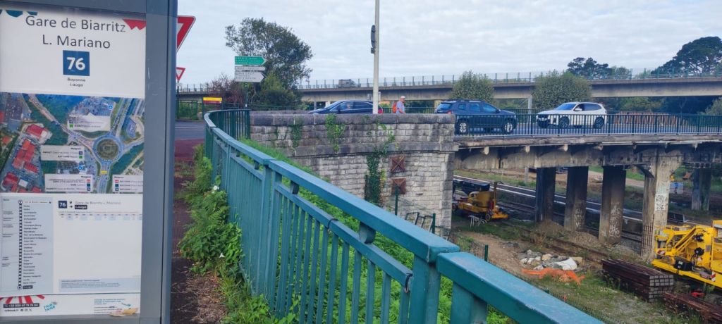 Iniciamos nuestra caminata desde la Catedral de Sainte-Marie, en pleno casco antiguo; la rodeamos y, desde allí, descendemos por la rue Poissonnerie para pasar junto Les Halles (mercado cubierto) y llegamos a la orilla del río Nive (Errobi en euskera) y, sin cruzarlo, torcemos a la derecha para caminar en paralelo a su cauce, algo más de un km rodeados de estudiantes que se dirigen a los liceos que hay por la zona. Seguimos de frente junto a un carril bici y, un poco más allá, ante las instalaciones de un club de remo encontramos el primer poste con flechas e indicaciones del camino. Se trata de un tramo muy agradable en el que confluyen tres rutas jacobeas (La del Baztan, el Camino francés que se dirige hacia Saint Jean Pied de Port y este camino del Norte). Avanzando siempre junto al río, pasamos bajo los viaductos de la av. André Grimard, donde hay un gran letrero STOP GENOCIDIO y, más adelante, bajo el puente del ferrocarril; dejamos a nuestra derecha una zona deportiva con campos de rugby y pistas de atletismo; acto seguido pasamos por debajo de una pasarela peatonal. A unos 450 metros de dicha pasarela debemos estar muy atentos, pues aquí nuestro camino del Norte se bifurca respecto de los otros dos caminos (hay pequeñas pegatinas sobre un poste eléctrico y una flecha pintada. La señalización del Camino en Francia es muy parca y discreta, por lo que hay que estar muy atento a las señales o ir con un buen track) Giramos a la derecha, ascendiendo una cuesta, cruzamos un paso a nivel y seguimos en franca subida; tras un tramo de escalones, tomamos a la izquierda una callecita y salimos ante unos grandes depósitos de agua. Poco a poco nos vamos acercando al municipio de Anglet. En esta zona hay un poco más deseñalización. Pasamos por un par de polígonos industriales con concesionarios de motos y coches y encontramos un pequeño café en el que tomamos un refrigerio. Continuamos en dirección al municipio de Biarritz. Los vuelos de varias avionetas nos indican que nos encontramos en las proximidades del aeropuerto de Biarritz-Pays Basque y continuamos por una zona periurbana entre urbanizaciones hasta pasar un nuevo paso a nivel y caminamos por la izquierda de las vías por un tramo acerado de la calle Luis Mariano, y por ésta llegamos a los antiguos Docks (almacenes) de la Gare de Biarritz, reconvertidos en una moderna zona comercial y de restauración; seguimos de frente, pasando a poca distancia de la estación de tren de Biarritz-La Nègresse. Al llegar a una rotonda, giramos a la derecha y cruzamos un puente sobre la vía férrea. Éste es un punto escasamente señalizado, justo tras pasar ante una farmacia debemos girar a la izquierda por la rue des Mouettes y seguir un trecho bajo el viaducto. Así, en paralelo a las vías del tren, llegamos a la orilla del Lago de Mouriscot. Tras un breve tramo de camino de tierra por bosque nos adentramos en el municipio de Bidart–Bidarte. Por la avenida des Italiens, atravesando una zona residencial; seguimos la rue de Tutilenia, desde la que gozaremos de las primeras vistas sobre el Cantábrico y tomamos el Sendero, sin bajar a la playa de Erretegia; bordeamos la Corniche (acantilado) de la Falaise, para descender finalmente a la capilla de la Madeleine, con un magnífico mirador sobre el océano, una buena mesa de orientación y un memorial dedicado a la paz, a los Derechos Humanos y recordando algunos hechos significativos relacionados con el tema.