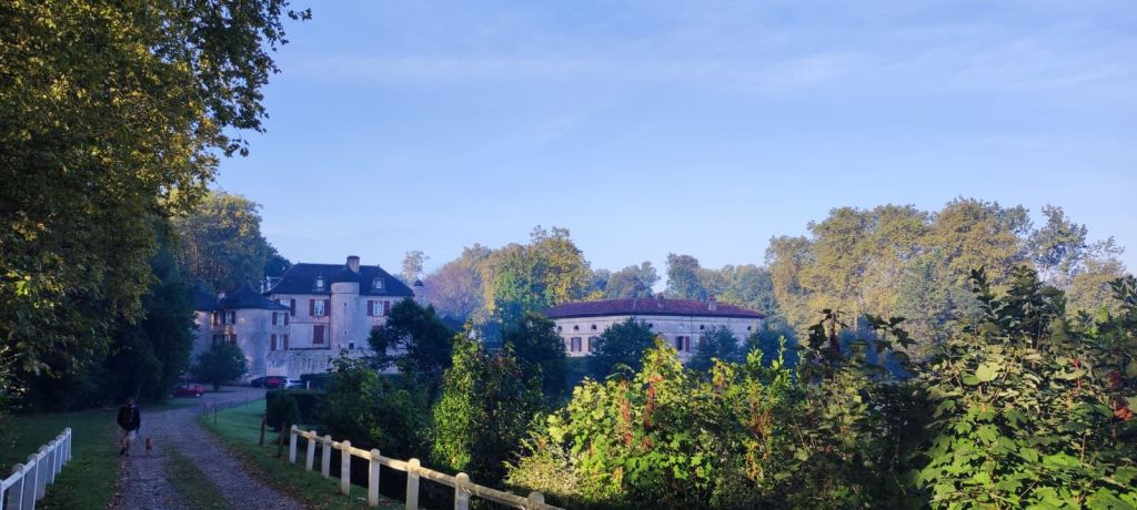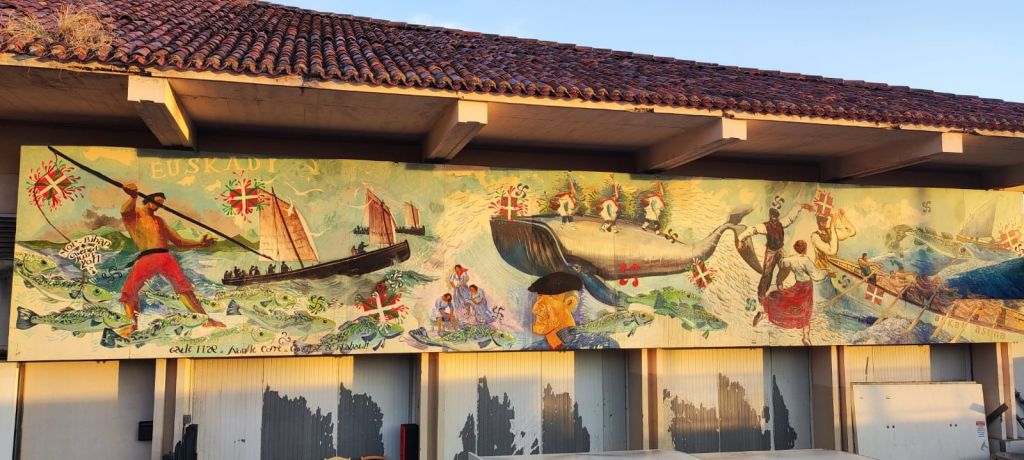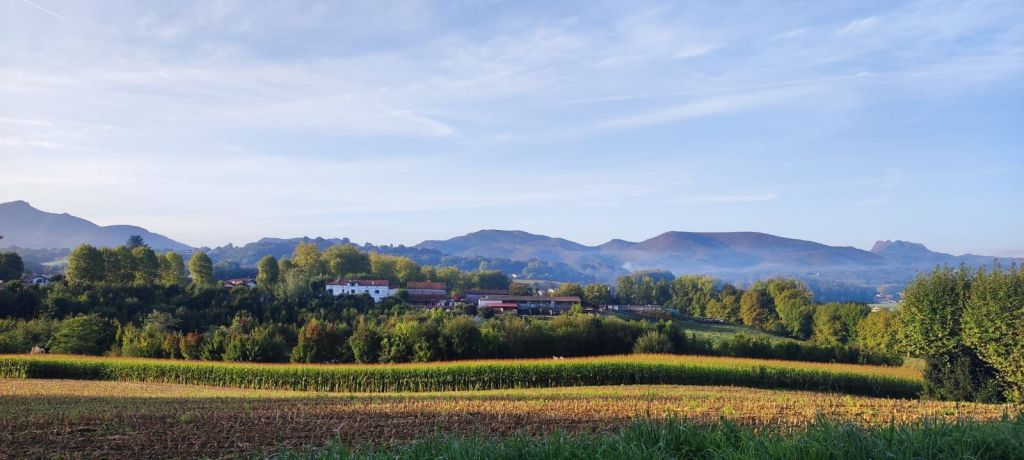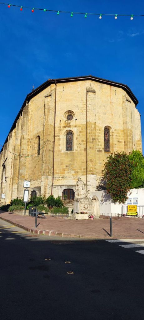 Cruzamos el puente de la carretera D-810 (Pont Charles de Gaulle) sobre el río Nivelle, que nos deja en la vecina villa de Ciboure-Ziburu (en este famoso puente se encuentra una placa con el origen etimológico de Ziburu, “final del puente” en vasco). Tras cruzar el puente seguimos la acera junto al aparcamiento del puerto. En la entrada del canal del puerto hay dos faros impresionantes con una construcción muy particular del arquitecto André Pavlovsky construidos al final de la segunda guerra mundial. En este punto, nos adentramos en el casco viejo de Ciboure. El trazado oficial nos lleva hasta la carretera D 810 por una agradable campiña con ganado pastando en las praderas. Pasamos un tramo bajo una imponente hilera de plátanos de sombra que lleva a la entrada del Chateau d’Urtubie (cerrado a esa hora de la mañana) Caminamos junto al enorme parque del Chateau para entrar en la localidad de Urrugne- Urruña que atravesamos por su calle principal. Pasamos junto a la Iglesia de Saint Vincent, de estilo renacentista y en la que vemos un relieve con dos peregrinos en el tímpano de una puerta lateral. Aprovechamos para tomar un café y nos encontramos con dos peregrinos en tránsito. Más adelante charlaremos con uno de ellos, Valentin, que realiza su segundo camino del Norte.