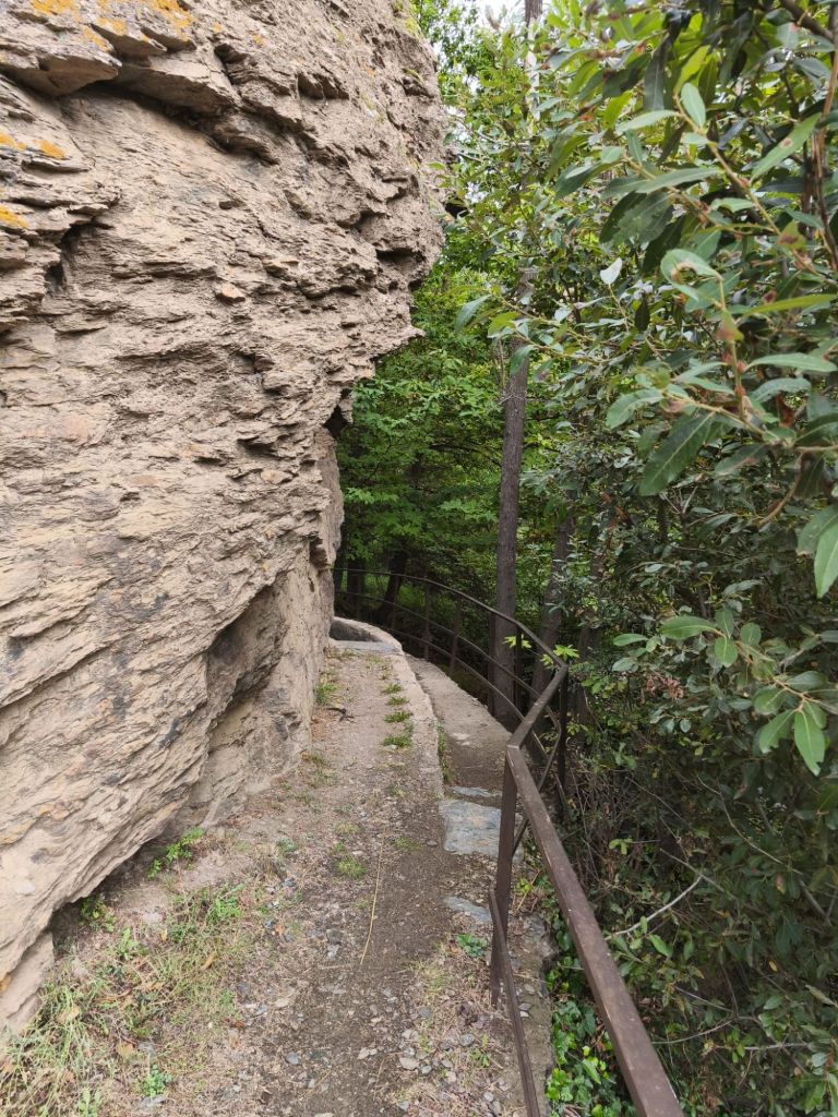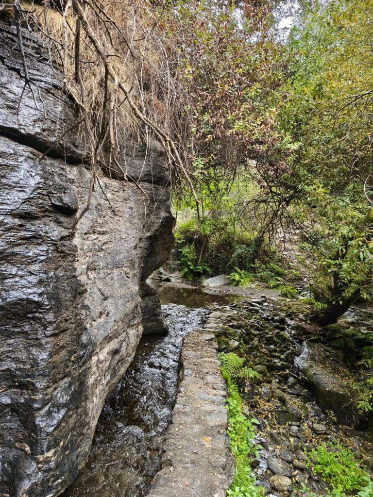 Continuamos nuestra caminata por una senda que va sobre la acequia y que está un poco expuesta sobre el barranco, aunque han colocado una barandilla que mitiga ligeramente la sensación de vértigo. En un pequeño barranco nos sorprende una preciosa cascada. Más adelante abandonamos el borde de la acequia para descender por un sendero que pasa junto a un gran depósito de agua. Ahí enlazamos con la acequia de nuevo. un poco más adelante dejamos definitivamente la acequia y conectamos con una pista de hormigón. En ese punto comenzamos el descenso hacia Lanjarón cruzándonos por un sendero señalizado como Sendero Bordaila-Acequia Nueva. Pasamos junto a unas antiguas eras, cruzamos otras acequias mientras cruzamos los caminos que van a los cortijos de la zona, y en algunos tramos caminamos por por una pista hormigonada. Llegamos a Lanjarón por el Barrio Hondillo con sus populares tinaos, y se regresa al punto de origen, pasando de nuevo junto a la Ermita de San Sebastián.