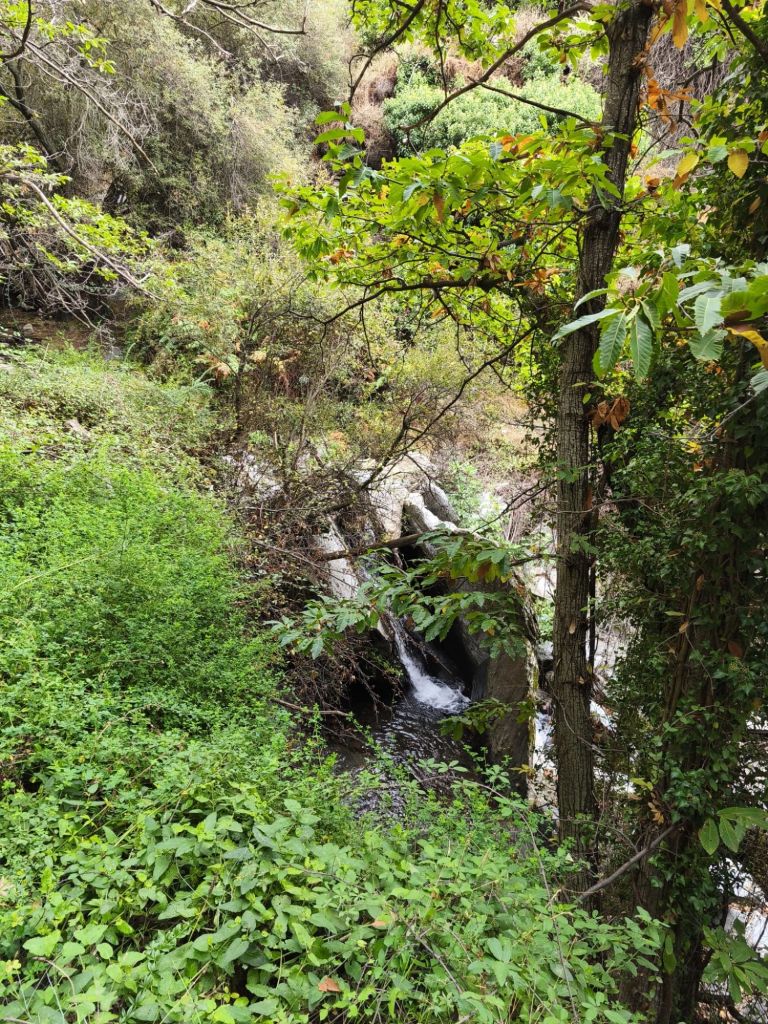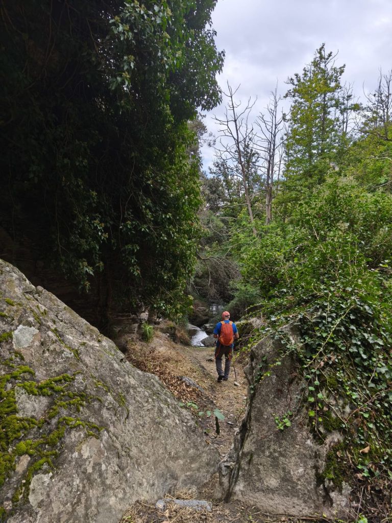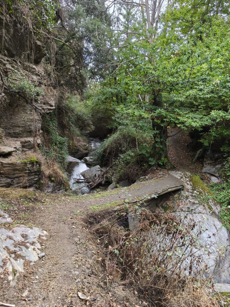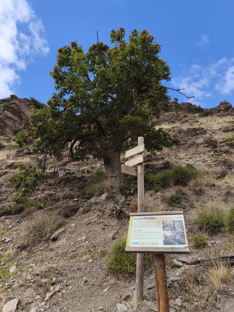 Comenzamos la caminata tras dejar el coche en la Barriada de La Paz junto a la carretera a la salida de Lanjarón hacia Órgiva. Pasamos junto a la ermita de San Sebastián, junto al museo del Agua y un bonito parque dedicado a este elemento y a los agricultores y agricultoras de Lanjarón. Cruzamos el río Lanjarón por un puente y desde este punto parte un camino de herradura que va ascendiendo río arriba, y que pasa junto a la fuente Hoya del Grillo. Un poco más adelante se inicia el sendero Lanjarón-Tello, PR-A 34. Es un sendero empedrado, con bastante pendiente que va ascendiendo hasta la Casa Forestal de Tello. Solamente hay que seguirlo durante unos tres km. Está bien señalizado con las habituales marcas blancas y amarillas. El sendero lo cruzan un par de pistas que llevan a los cortijos de la zona. Durante el ascenso disfrutamos de magníficas vistas hacia Sierra Nevada. A nuestra izquierda tenemos el río Lanjarón con el rumor constante del aguan y en la ladera de enfrente magníficos ejemplares de castaños. A nuestra espaladas va quedado Lanjarón, la presa de Rules y la costa. A unos dos km de nuestro recorrido comenzamos a atravesar uno de los castañares más frondosos de la zona, el castañar de Patatún, aunque ya no quedan tantos ejemplares como los que tuvo en otra época. Estos castaños formaban un bosque paradisíaco que desgraciadamente fue mermado por un incendio forestal que tuvo lugar en 2005, si bien aún se conservan algunos imponentes ejemplares centenarios. Es un lugar fresco, en el que pequeños arroyos atraviesan el sendero creando un pequeño oasis de frescor. Un poco más arriba, a unos 1200 m de desnivel abandonamos el sendero por una senda muy poco marcada que desciende bruscamente hacia un cortijo situado a la izquierda, que bordeamos por la derecha en busca del descenso al río. Es un entorno precioso, escondido en el fondo de profundos tajos, donde el agua desciende por pequeños saltos entre las rocas, rodeados de frondosa vegetación. Aquí hay un puente que permite cruzar al otro lado. Nada más cruzar subimos por una precaria vereda hacia una acequia que se observa en la parte superior, la acequia Montalbán. Caminamos un poco hacia nuestra derecha para ver la acometida de la acequia y descansar un poco tomando una fruta.