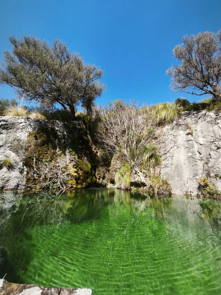 Cruzamos una primera cancela de tipo menorquín, y continuamos por un sendero algo embarrado, hasta pasar dos cancelas más. Llegamos a un bonito estanque en el que se derrama una sencilla cascada con un agua increíblemente verde esmeralda.