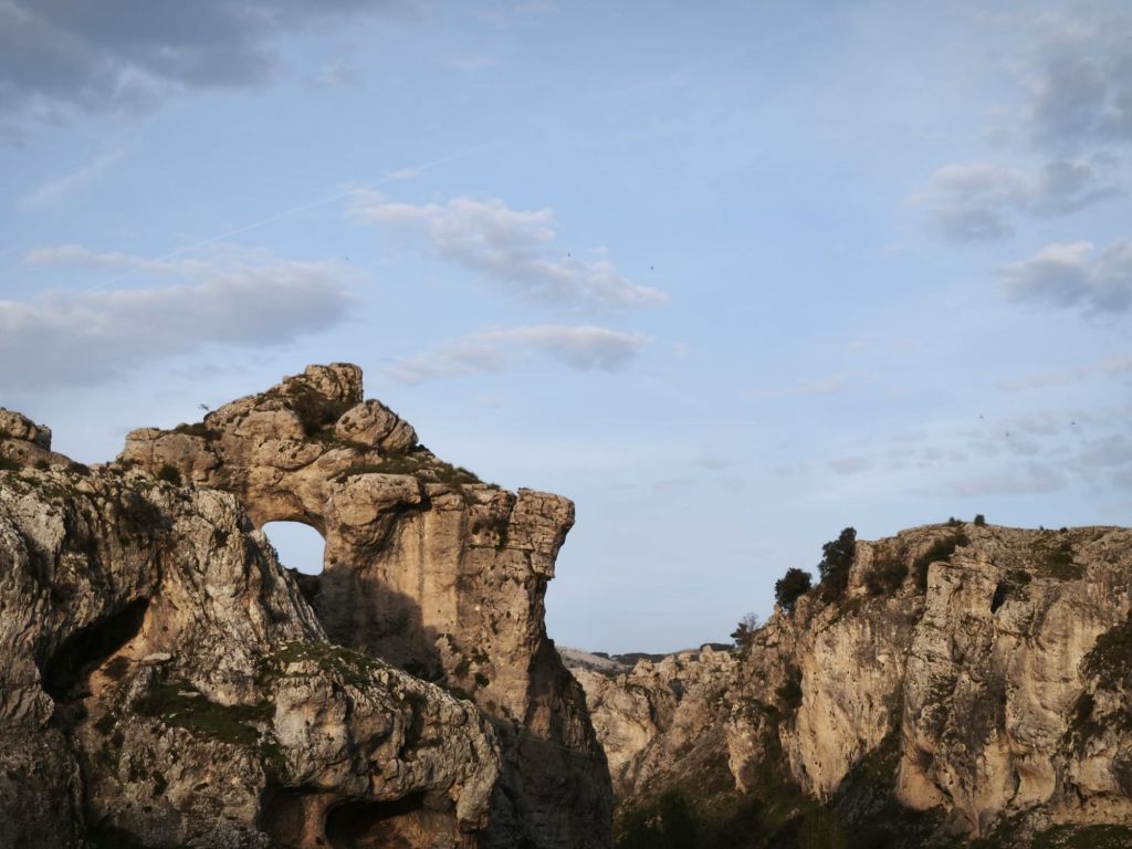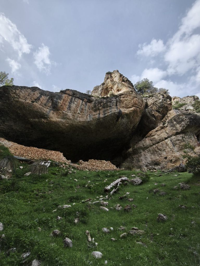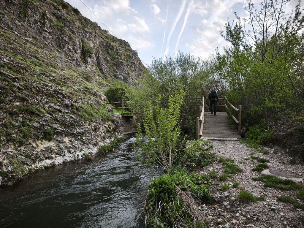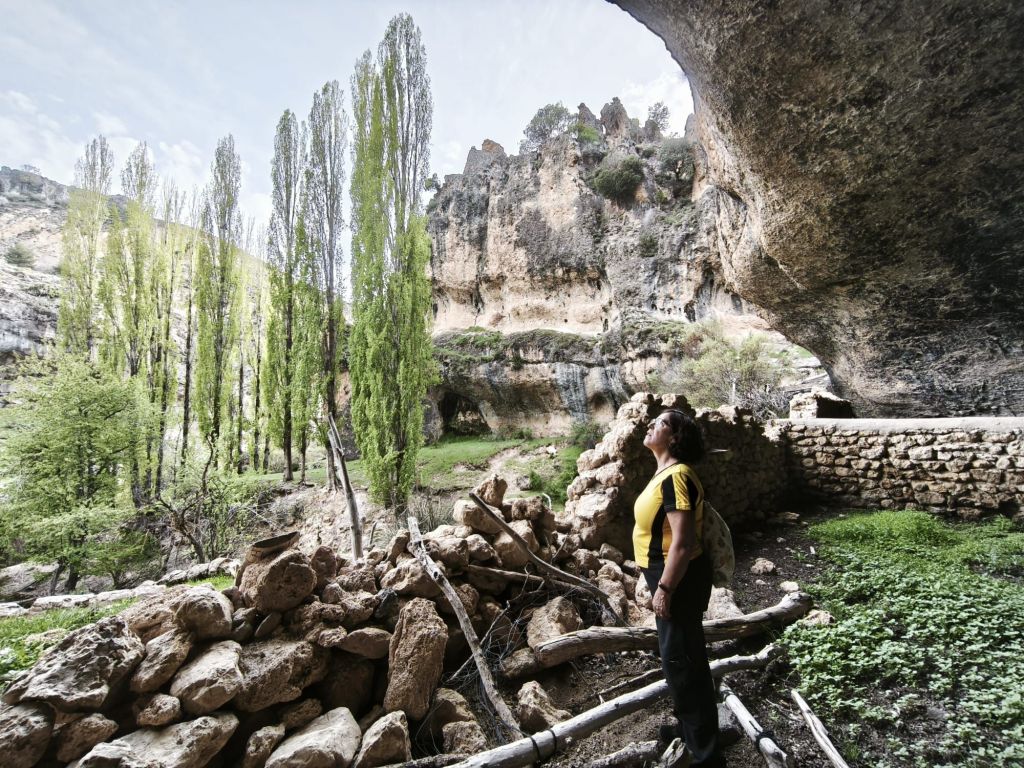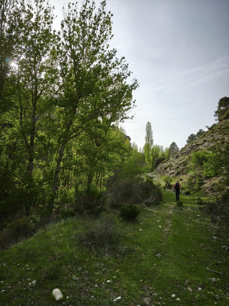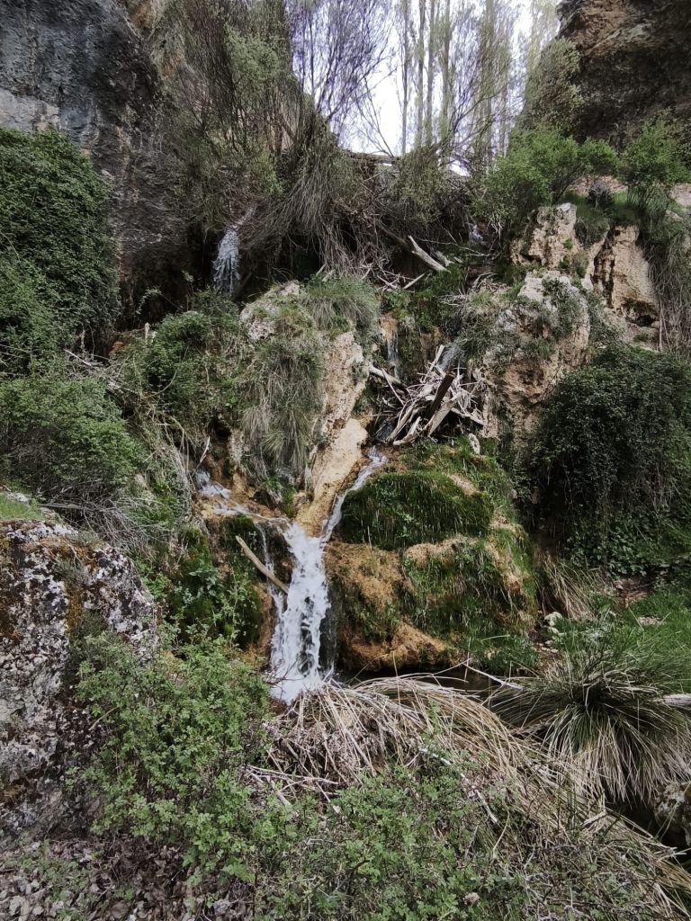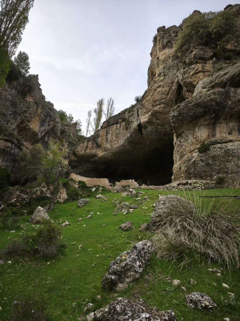 Aproximadamente a los 1,5 km, llegamos a la unión de aguas: el Arroyo Azul entrega su caudal al Segura. Giramos a nuestra izquierda para remontar este pequeño afluente. El carril se estrecha y el entorno se vuelve más íntimo. Aquí la biodiversidad es la protagonista: vemos nogales de gran porte, arces y algunos ejemplares de abedul, una reliquia botánica en estas latitudes. El camino discurre junto al cauce del Arroyo Azul (también conocido como Roazul) que, quizás por los temporales del invierno pasado, ha cambiado algo el cauce y ha invadido el camino. Hacia el km 3,5 de nuestro recorrido nos desviamos a la derecha para subir a la Cueva del Arroyo Azul. Se trata de un gran abrigo rocoso utilizado por los pastores para refugiar ganado ante las tormentas de la sierra. Tras un breve descanso, regesamos al arroyo, lo cruzamos y desde aquí, el sendero comienza a ganar una altura suave para regalarnos vistas despejadas de las muelas calizas que rodean el valle. Al salir del barranco, el paisaje cambia drásticamente a un páramo seco conocido como la estepa de Castilla la Vieja, ofreciendo vistas panorámicas del entorno. Enlazamos con el camino que nos lleva hacia Pontón Alto, desde donde iniciaremos el cómodo descenso final hacia Pontón Bajo pasando por hitos locales como la Piedra Horadada y el Cristo de las Maravillas