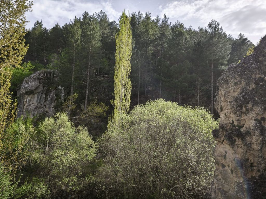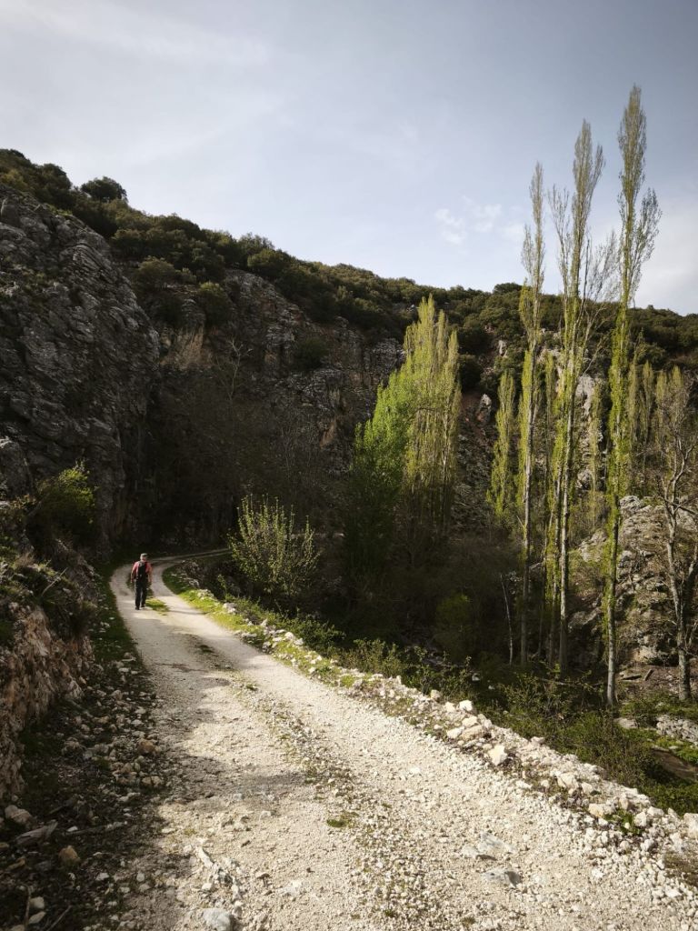 Tras una suculenta comida en la Casa del Cordero comenzamos la caminata en Pontón Bajo buscando el carril que bordea el margen izquierdo del río Segura. En estos primeros pasos, el río balbucea entre chopos y mimbreras, mostrando una vegetación de ribera que en este comienzo de primavera se tiñe de unos verdes vibrantes. Al poco nos encontramos con Nati y Jose, unos madrileños afincados en León que han comido junto a nosotros en la Casa del Cordero. Tras cambiar algunas impresiones sobre la comida y el senderismo, continuamos el camino para encontrarnos con el Arroyo Azul.