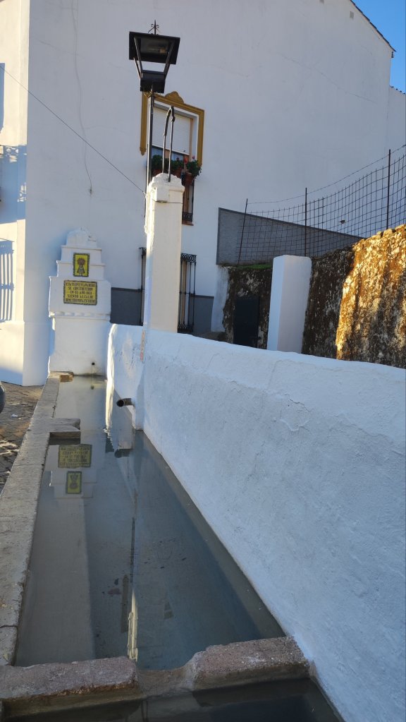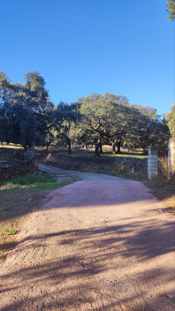Es un camino amplio, en ligera subida por el que el grupo se ensancha y por el que caminamos unos tres km hasta tomar un desvio que nos llevará hasta el Arroyo de Jernanderia, lo cruzamos por un puente y caminamos entre varias fincas en la dehesa de Las Canteras. Por el «camino del Colesterol» por el que los habitantes de la localidad suelen pasear habitualmente nos acercamos a Gerena. Cruzamos la urbanización semideshabitada de los Jardines de Gerena y por la Calle Ferrocarril llegamos al Auditorio de la Rodadera desde el que partimos esta mañana. Cuando llegamos ya suena la música y han comenzado a repartir el potage de garbanzos y los botellines de cerveza.