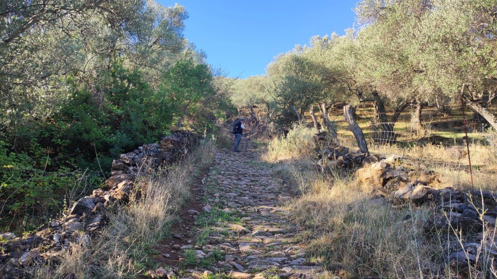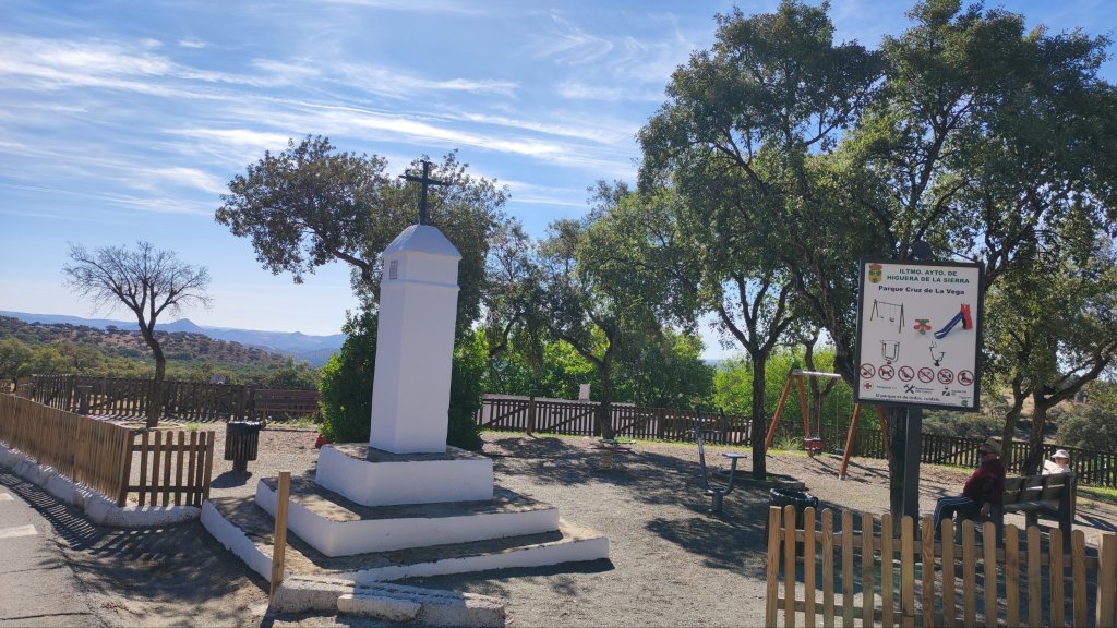 Tras un breve refrigerio, iniciamos el descenso por una abrupta vereda que se suaviza con la entrada a un pinar de repoblación por el que transitaremos unos 600-700 m hasta desembocar en un camino entre callejones en el que la pendiente se suaviza un poco por el que llegaremos hasta las inmediaciones de Higuera de la Sierra. Salimos a la carretera HU-8132 y tras caminar por ella unos 500 m llegamos a la Cruz de la Vega, un antiguo humilladero reacondicionado como un pequeño parque. Tras otros 500 m por la carretera llegamos a una bifurcación a la izquierda en la que tomamos un camino entre dehesas de alcornoques y encinas en leve subida hasta llegar a la entrada de la Finca la Carpintera. A la derecha de la entrada hay una estrecha vereda que baja pegada a la tapia de la finca. La seguimos y tras atravesar dos cancelas para atravesar una finca de ganado bovino, y salimos de nuevo a un callejón en la zona más umbría de la sierra, por lo que atravesaremos varias manchas de castaños. El resto del camino hasta La Umbría discurre por un camino muy sombreado que desemboca en el prado a la entrada de la Aldea por el que cruzamos esta mañana.
