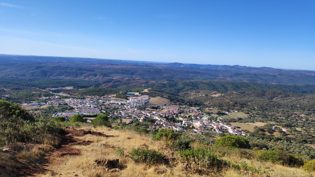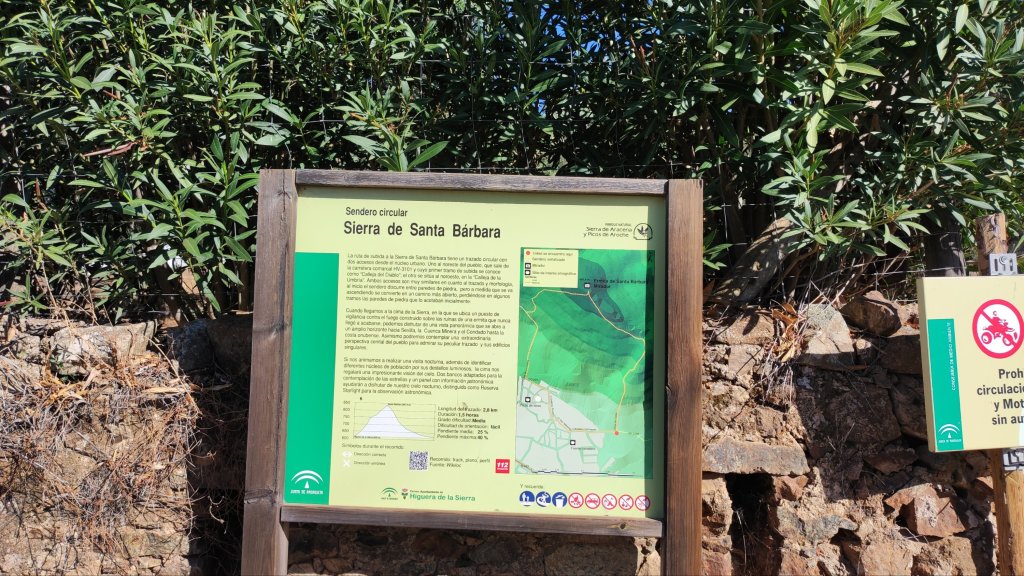 El sendero que seguimos (PR-A-41) está perfectamente señalizado y tiene su origen siguiendo la calle principal de la Aldea hasta llegar a una bifurcación de caminos junto a un prado. A la derecha, en subida, el camino de ida y a la izquierda vemos el camino por el que regresaremos. Desde este punto el sendero va progresando en subida, entre los típicos muros de piedra seca de esta sierra, entre encinas de buen porte y el sonido de los cerdos ibéricos que mastican las bellotas recién caídas. No es infrecuente que al escuchar nuestros pasos se acerquen curiosos. A los dos km de nuestro caminar alcanzamos una meseta que nos da un respiro a las piernas para, un poco más adelante, alcanzar una bifurcación a la izquierda en la que veremos un indicador de 450 m hasta la sierra de Santa Bárbara. Es el único tramo de subida fuerte de la jornada. Medio km de intensidad que nos deja en el punto más alto de la Sierra de Santa Bárbara, con vistas a tres provincias (Sevilla, Huelva y Badajoz) con Higuera de la Sierra a nuestros pies.