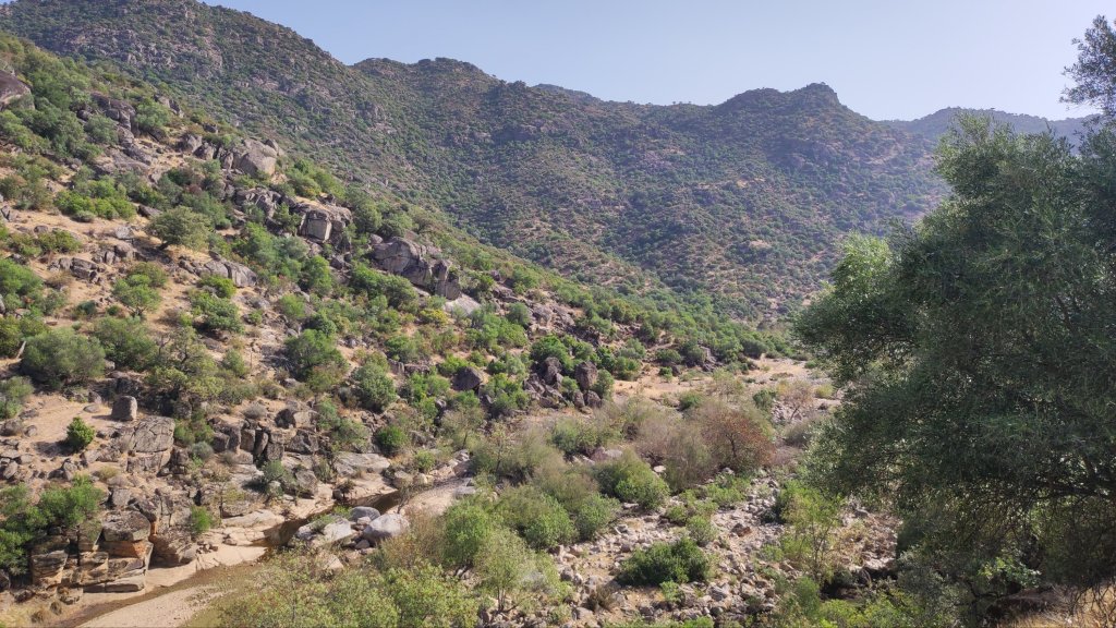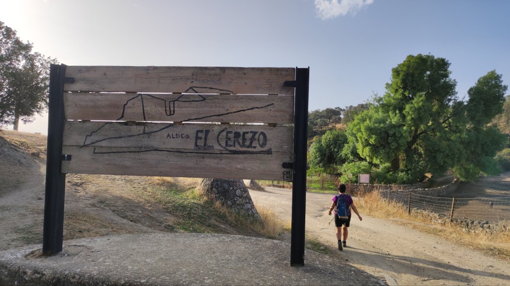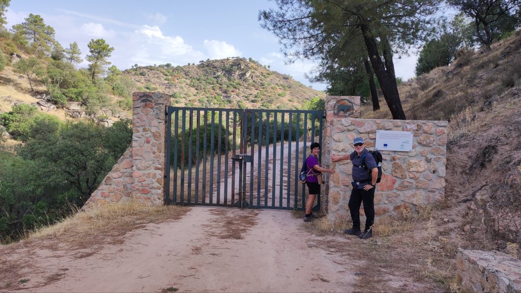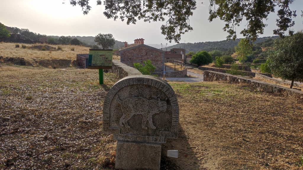 Comenzamos a caminar en la Aldea del Cerezo, una pedanía de Cardeña que vivió sus tiempos mejores con la explotación de la minería y el pastoreo y su declive se inició en la década de los 60 con el éxodo rural y el agotamiento de los recursos mineros. Actualmente el lugar ha sido rehabilitado y se explota como casas de Turismo Rural . Hay un Centro de visitantes que se encontraba cerrado el día de la visita. El sendero es lineal, tiene una longitud de unos 7 km y un desnivel de unos 440 m. Se comienza en un leve descenso entre fincas privadas dedicadas a la ganadería de ovejas, vacas y cerdos ibéricos. A unos 800 m de camino encontramos la primera cancela que evita el paso de los vehículos a motor pero que tiene un paso practicable para los caminantes. En la cancela podemos reconocer un grabado del Lince Ibérico, que es la estrella (muy esquiva) de este parque. Algo más adelante nos encontraremos con un pequeño mirador sobre el Arroyo de las Cantareras y a nuestra izquierda podemos ver el Cerro del Colchón (705 m) cubierto de una densa vegetación entre las que se distinguen unas manchas de quejigos. Sobre la cima sobrevuelan algunos buitres leonados y algún buitre negro.