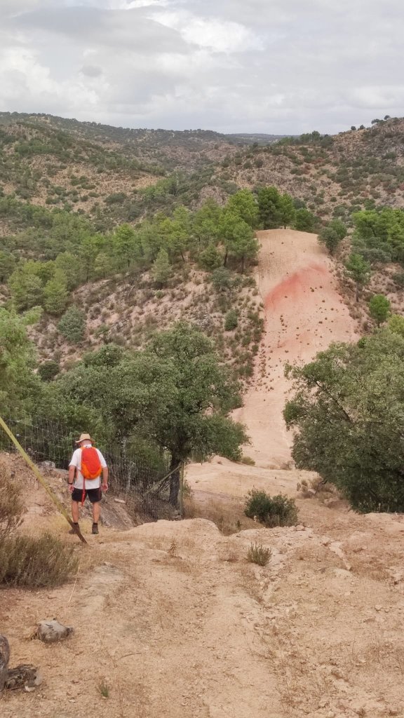 En este punto el descenso se acentúa bastante hasta llegar al arroyo de los Molinos y comenzar la subida por el paraje de los Algarrobales. Casi todo este tramo de subida discurre por la zona de la umbría, cosa que se agradece porque el día está un poco caluroso. Llegamos al arroyo de los Covachones y cruzamos por encima de un muro de contención de una pedrera y entramos en una zona de encinas bastante poblada. Continuamos ascendiendo, ahora con unas hermosas vistas de la Garganta Verde hasta llegar al km 6 de la carretera CA-9104 que une Zahara de la Sierra con Grazalema.