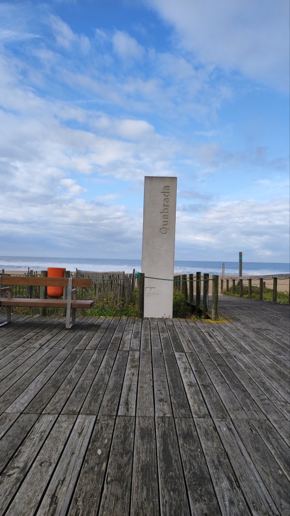 Comenzamos a caminar justo en el punto en que lo dejamos ayer: junto al fuerte de Nossa Senhora da Conceiçao, el Casino modernista y el impresionante muro de azulejos en el que se representan escenas de la historia de la ciudad y algunos de los personajes protagonistas de los mismos. Junto al mosaico está la oficina de información turística en la que nos atiende amablemente la responsable de la misma, nos sella la «credencial» y nos adelanta algunos detalles del camino del día. un poco más adelante nos detenemos un momento ante la Biblioteca Diana Bar, un bello edificio ya algo deteriorado. En ese punto comienza el paseo marítimo de Póvoa en el que de trecho en trecho vamos encontrando diferentes esculturas de personajes locales mientras el Atlántico ruge a nuestra izquierda pulverizando su nubecilla de agua salada a nuestro paso. Al terminar el paseo entramos en la freguesía de A Ver O Mar y comienza nuestro caminar sobre las pasarelas y puentecillos que salvan las dunas. Una bendición en un día como hoy, ya que toda la noche pasada estuvo lloviendo y los caminos terrizos a nuestro lado aparecen con grandes charcas de Agua.